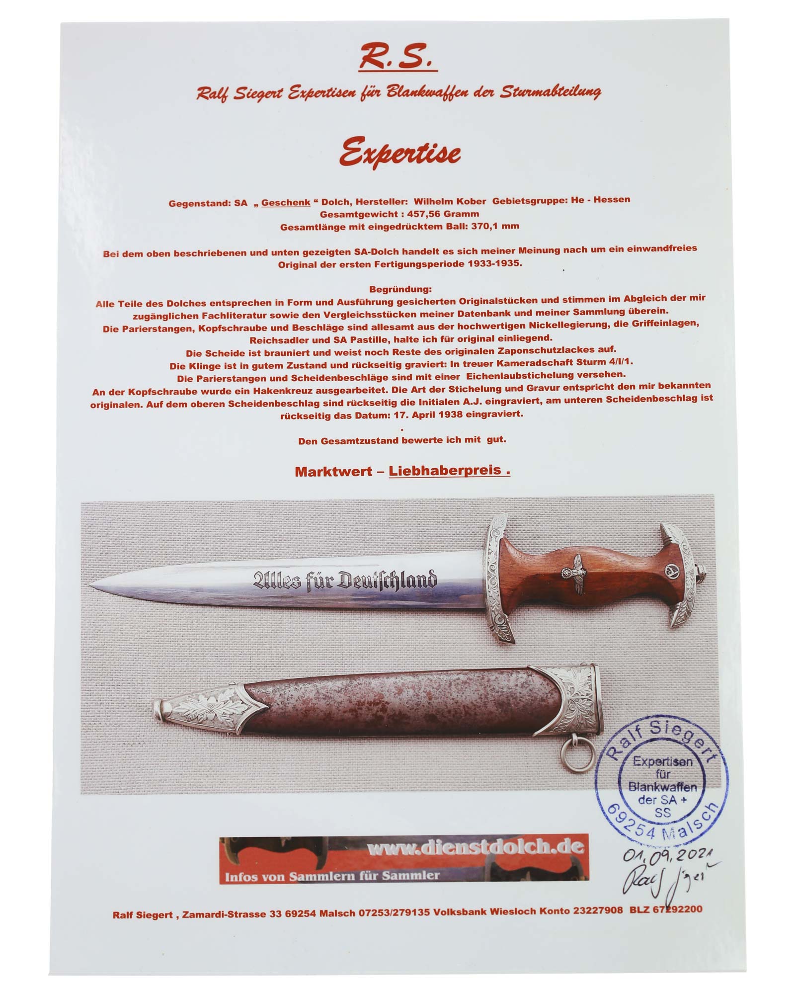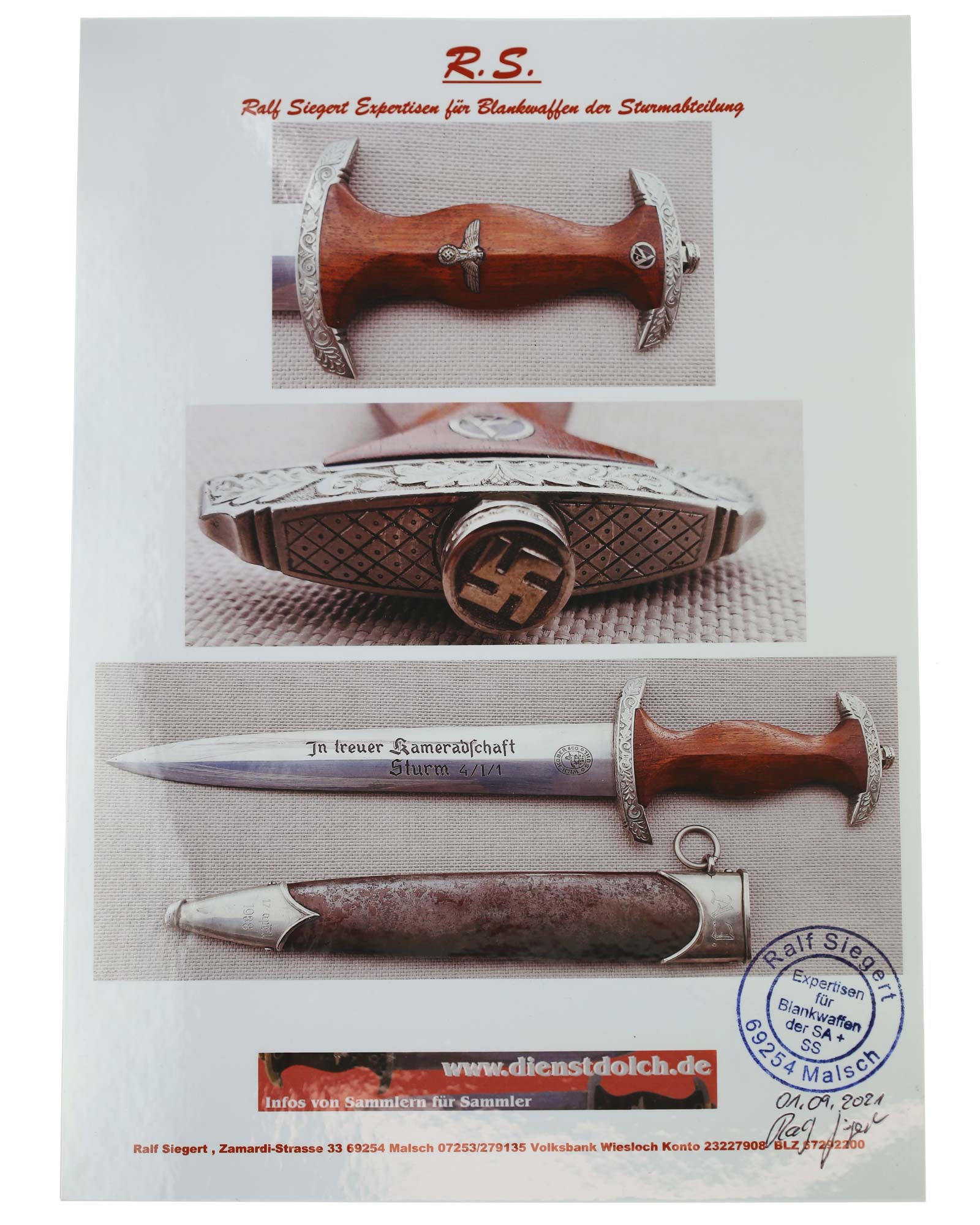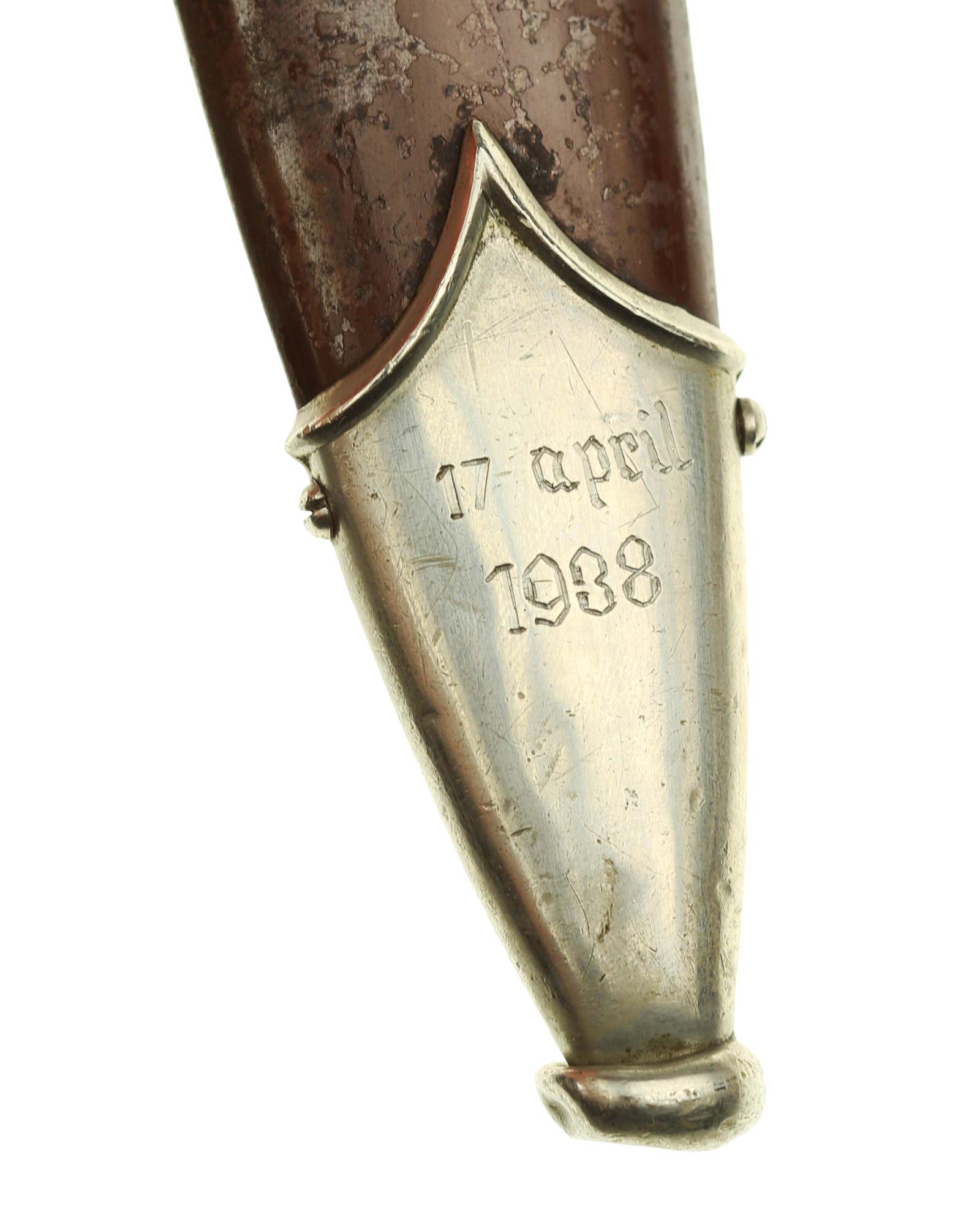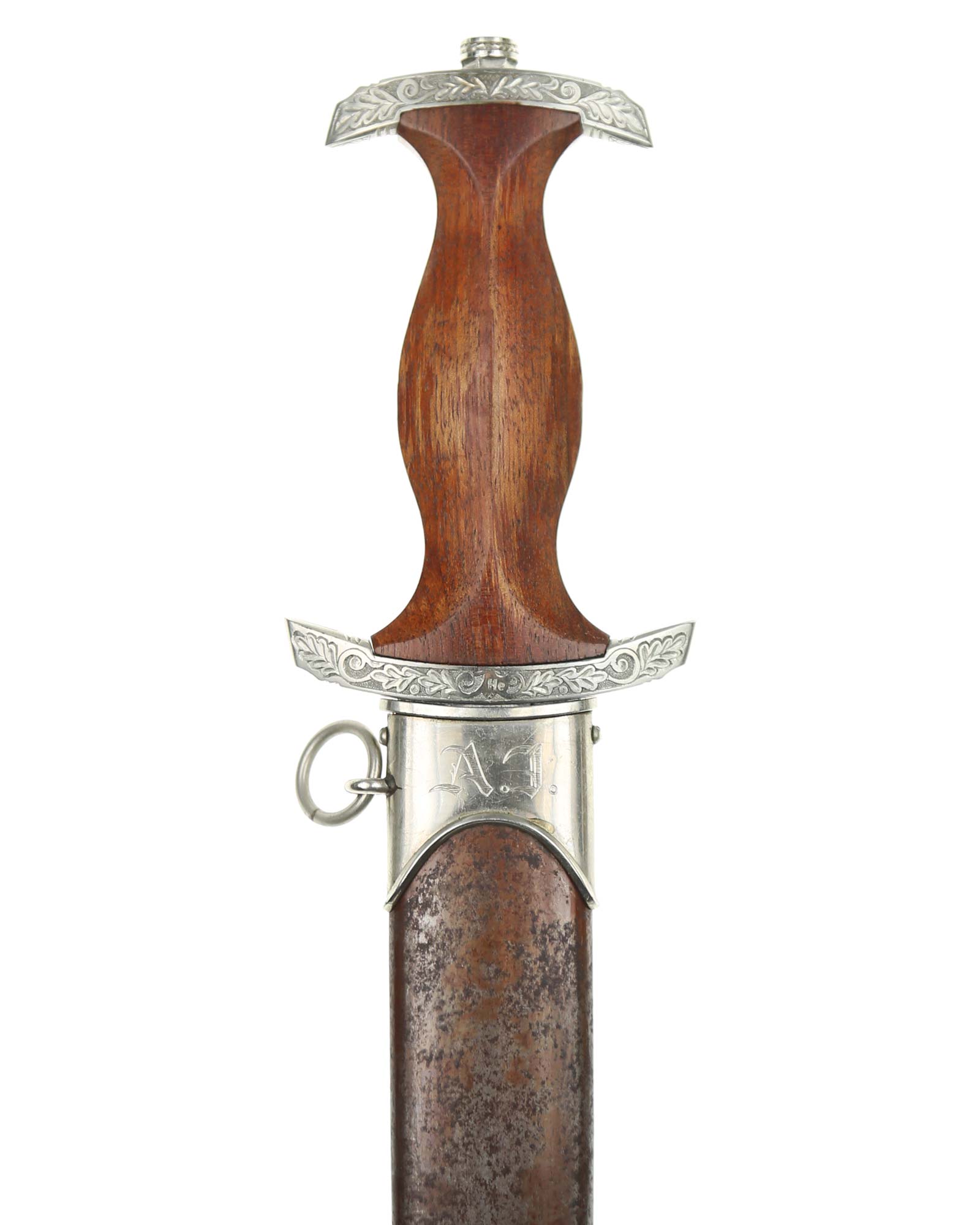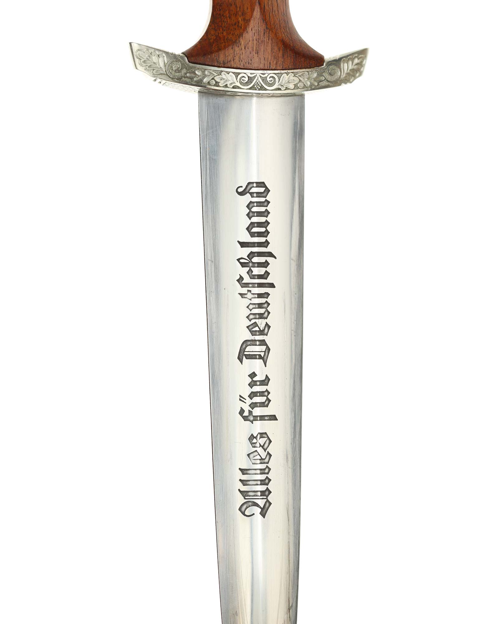 Клинок: Клинок стальной, прямой, двулезвийный, 4-гранный в сечении, без долов. На клинке готическим шрифтом нанесена надпись «Alles für Deutchland» ( «Всё для Германии»). На другой стороне нанесена надпись «In treuer Kameradschaft Sturm | 4/I/1» (В верном товариществе Штурм). Надписи и клейма: возле пяты клинка с тыльной стороны – «Willhelm Kober & Co Suhl» — клеймо немецкой фирмы «Вильгельм Кобер Зуль».