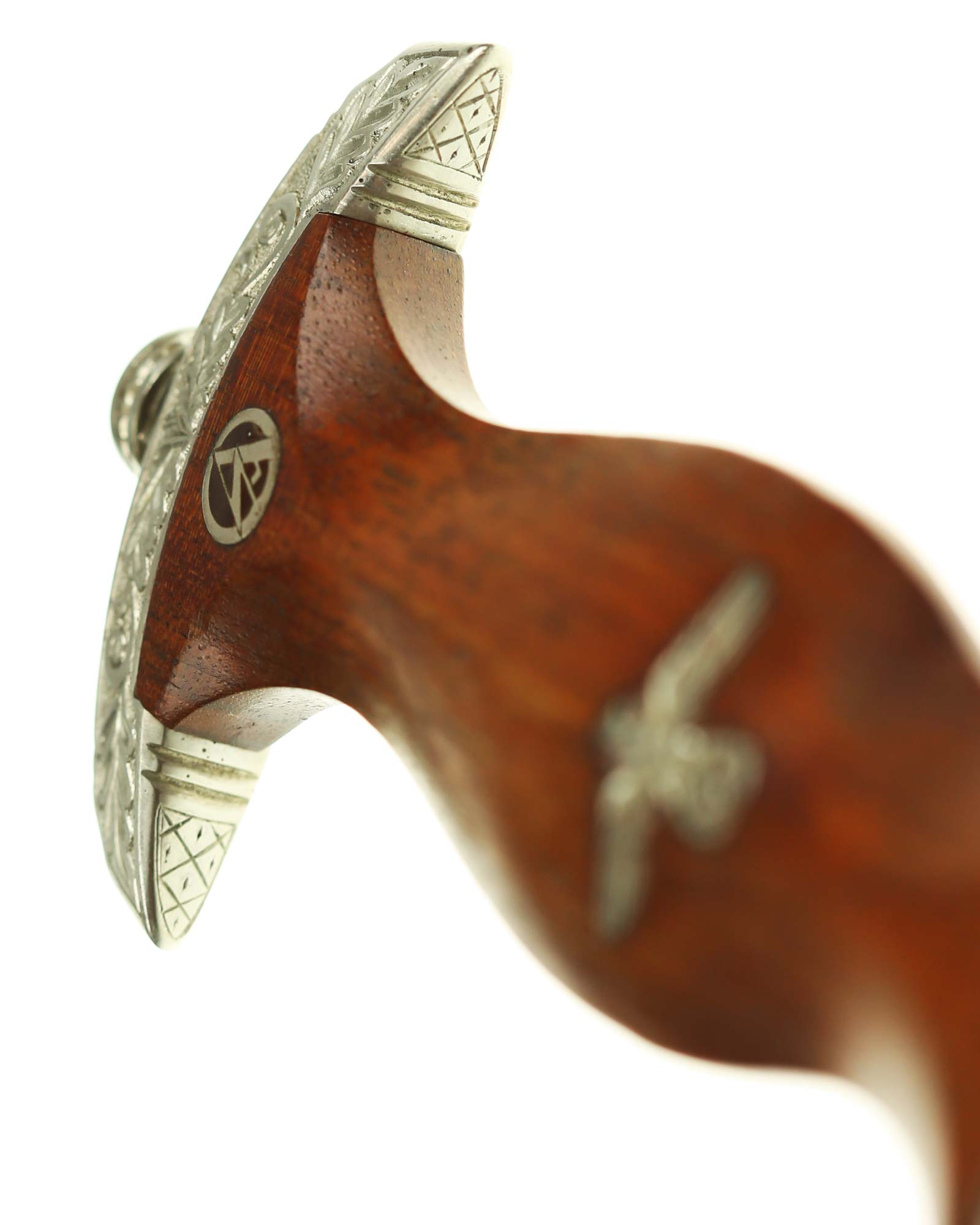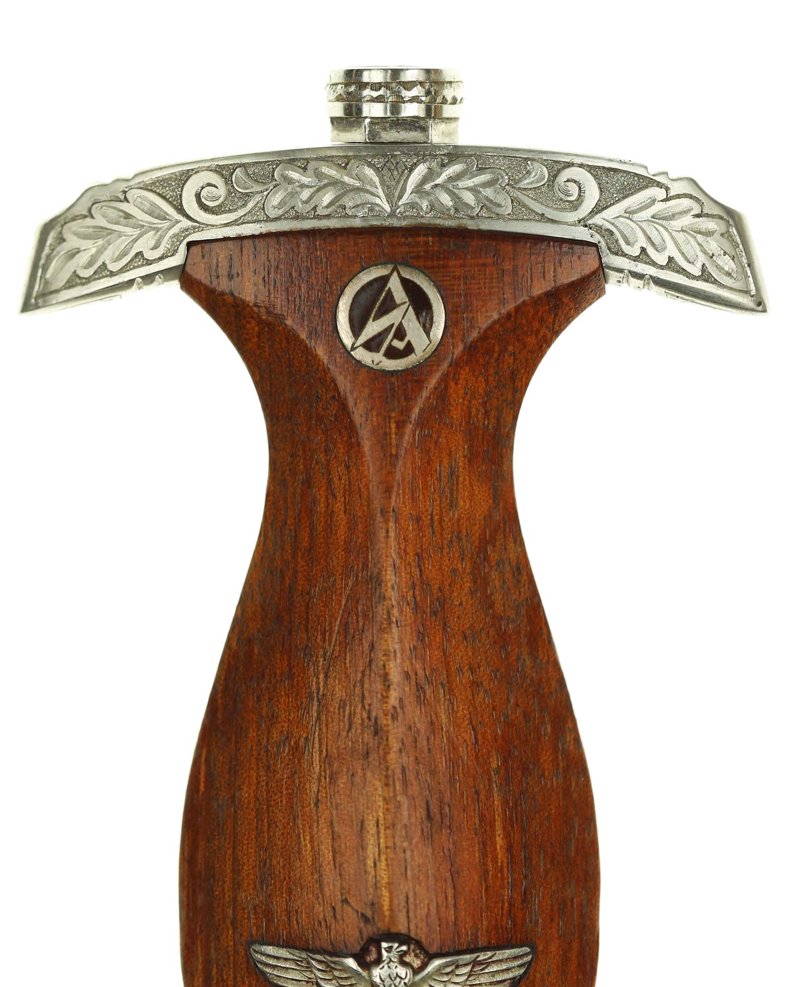 Рукоять: Эфес состоит из рукояти и крестовины. Рукоять, крепящаяся на полосу всадным способом, – фигурная, деревянная, тонированная в светло-коричневый цвет, с расширениями по срезам и в средней части, с выраженной центральной гранью. На лицевой стороне рукояти вверху в дерево врезана круглая эмблема СА, покрытая эмалью; в средней части рукояти – металлический знак в виде стилизованного изображения раскинувшего крылья орла, держащего в когтях венок со свастикой. Навершие рукояти С-образное, белого металла, с концами, чуть загнутыми вниз; на навершии сверху расположена круглая гайка, навинчивающаяся на хвостовик клинка. Крестовина С-образная, белого металла, с концами, чуть загнутыми вверх, в несколько увеличенном и перевернутом виде копирует навершие рукояти. На гарде с тыльной стороны – буква «He» [Hessen].