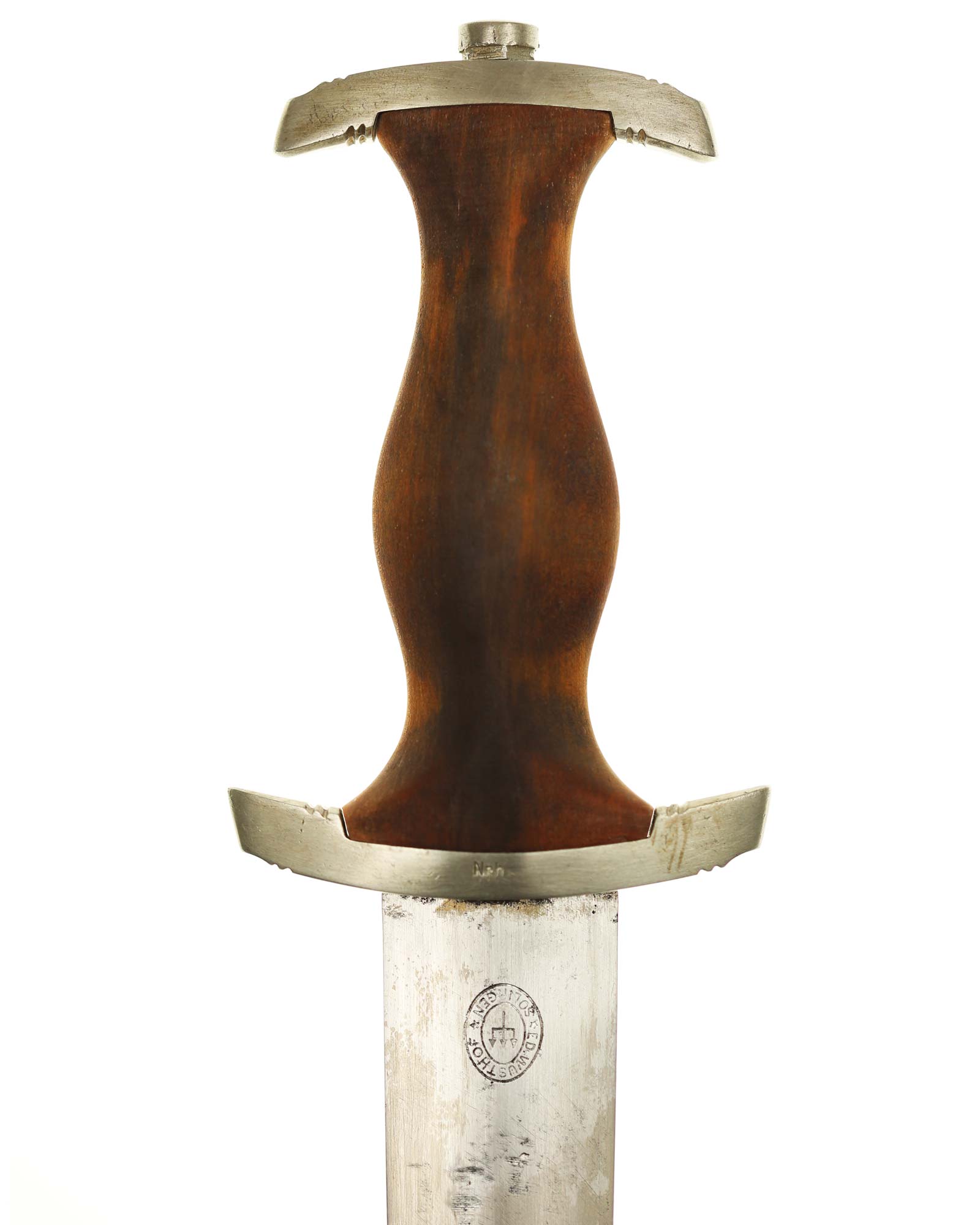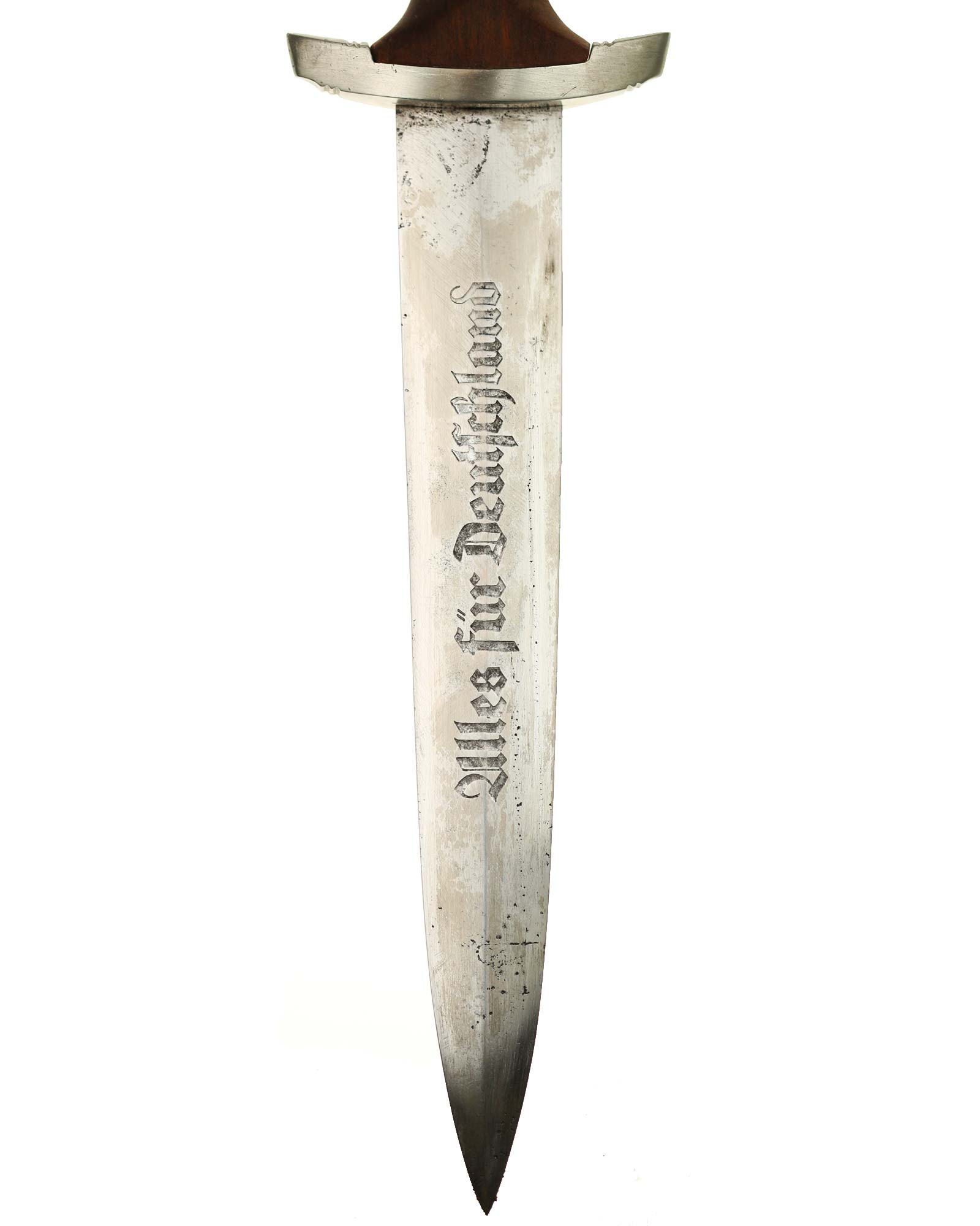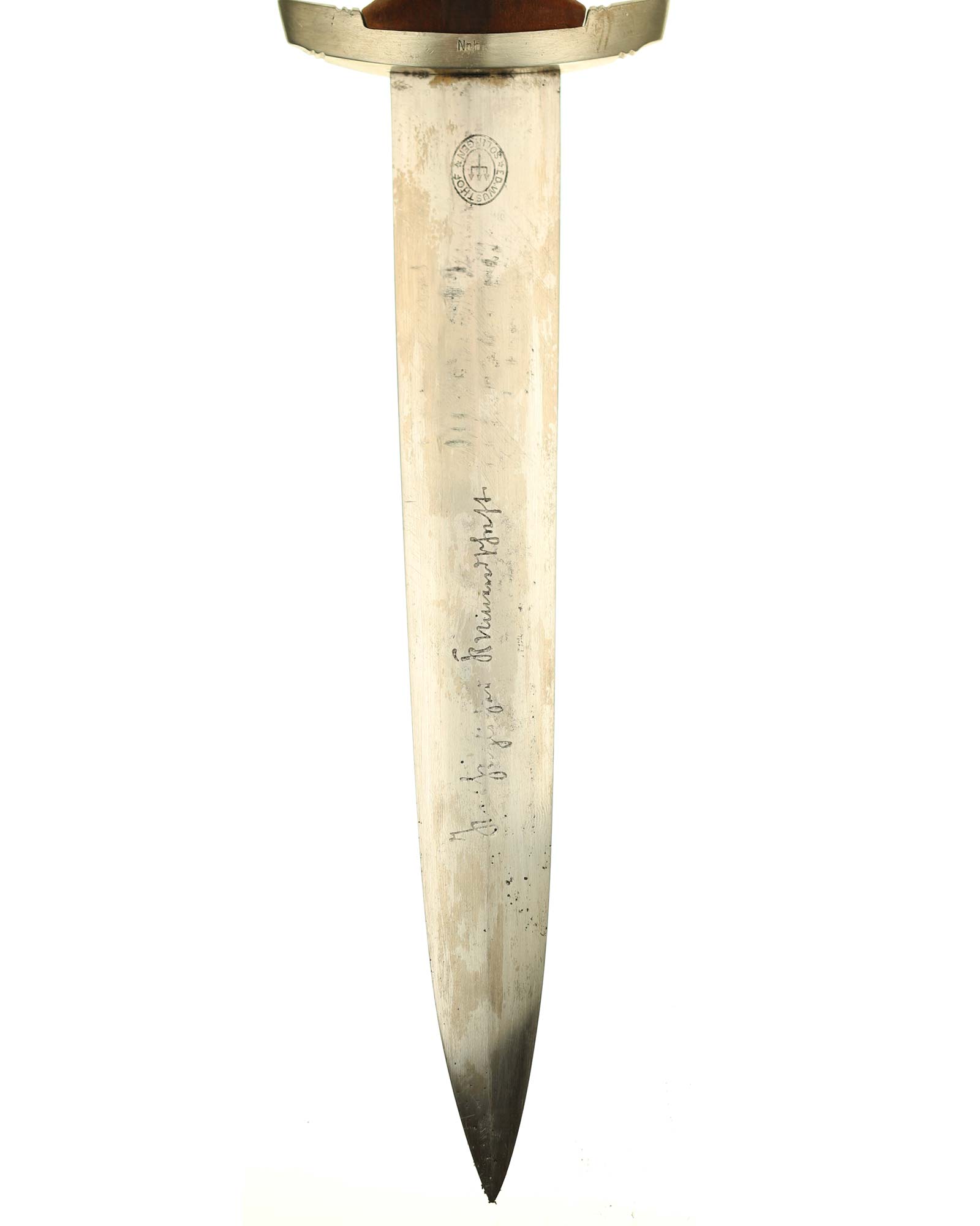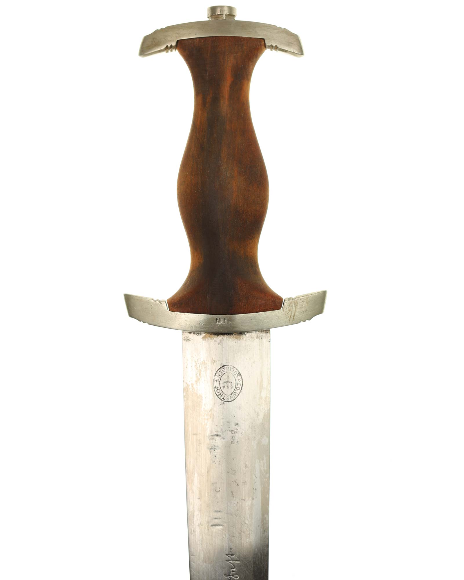 Клинок: Клинок стальной, прямой, двулезвийный, 4-гранный в сечении, без долов. На клинке готическим шрифтом нанесена надпись «Alles für Deutchland» («Всё для Германии»). На другой стороне нанесена надпись «ln herzlicher Kameradschaft Ernst Röhm» (В знак сердечной дружбы Эрнст Рём). К сожалению надпись стёрта частично. Надписи и клейма: возле пяты клинка с тыльной стороны – «Ed. Wüsthof Solingen» — клеймо немецкой фирмы «Эд. Вюстхоф Золинген».