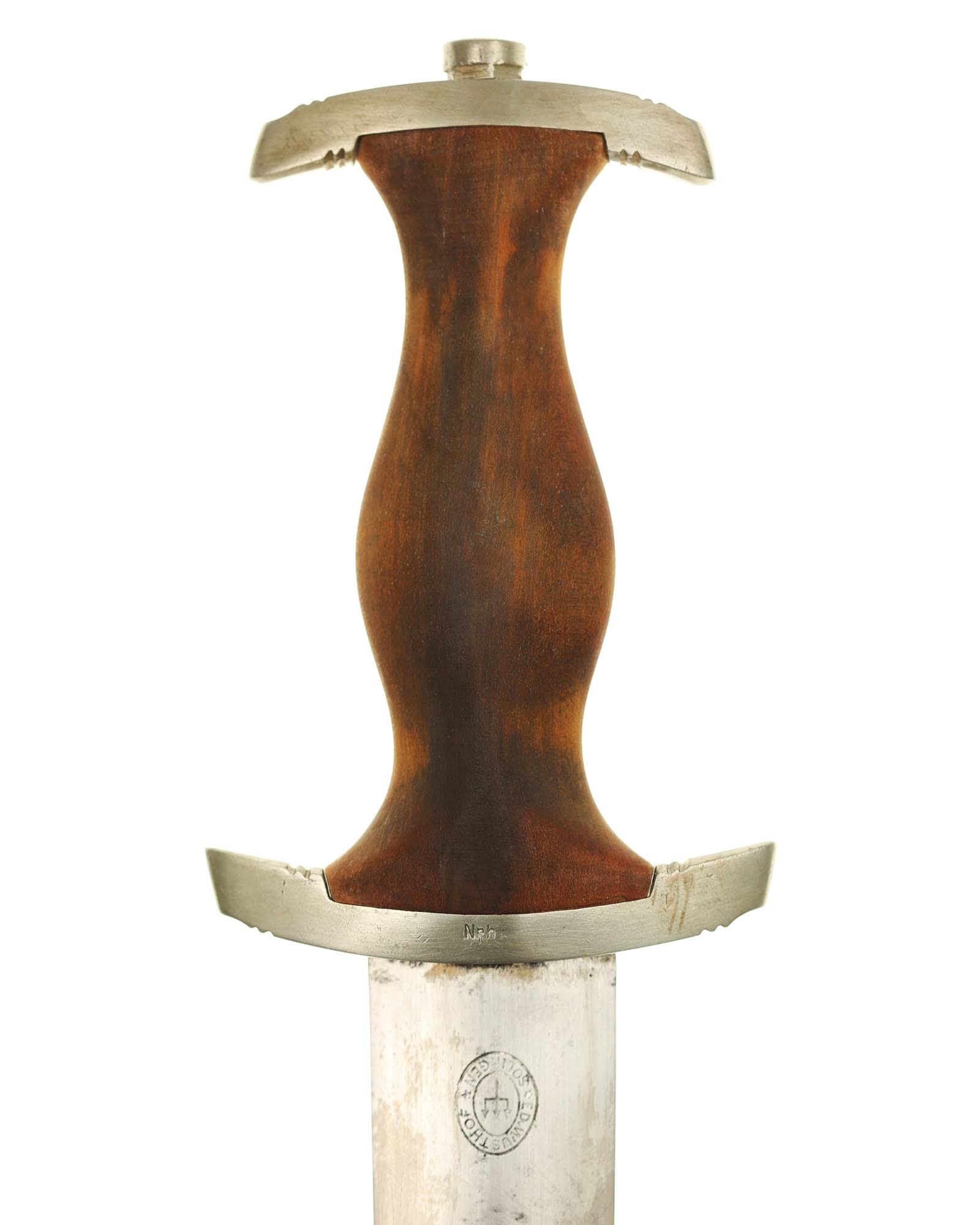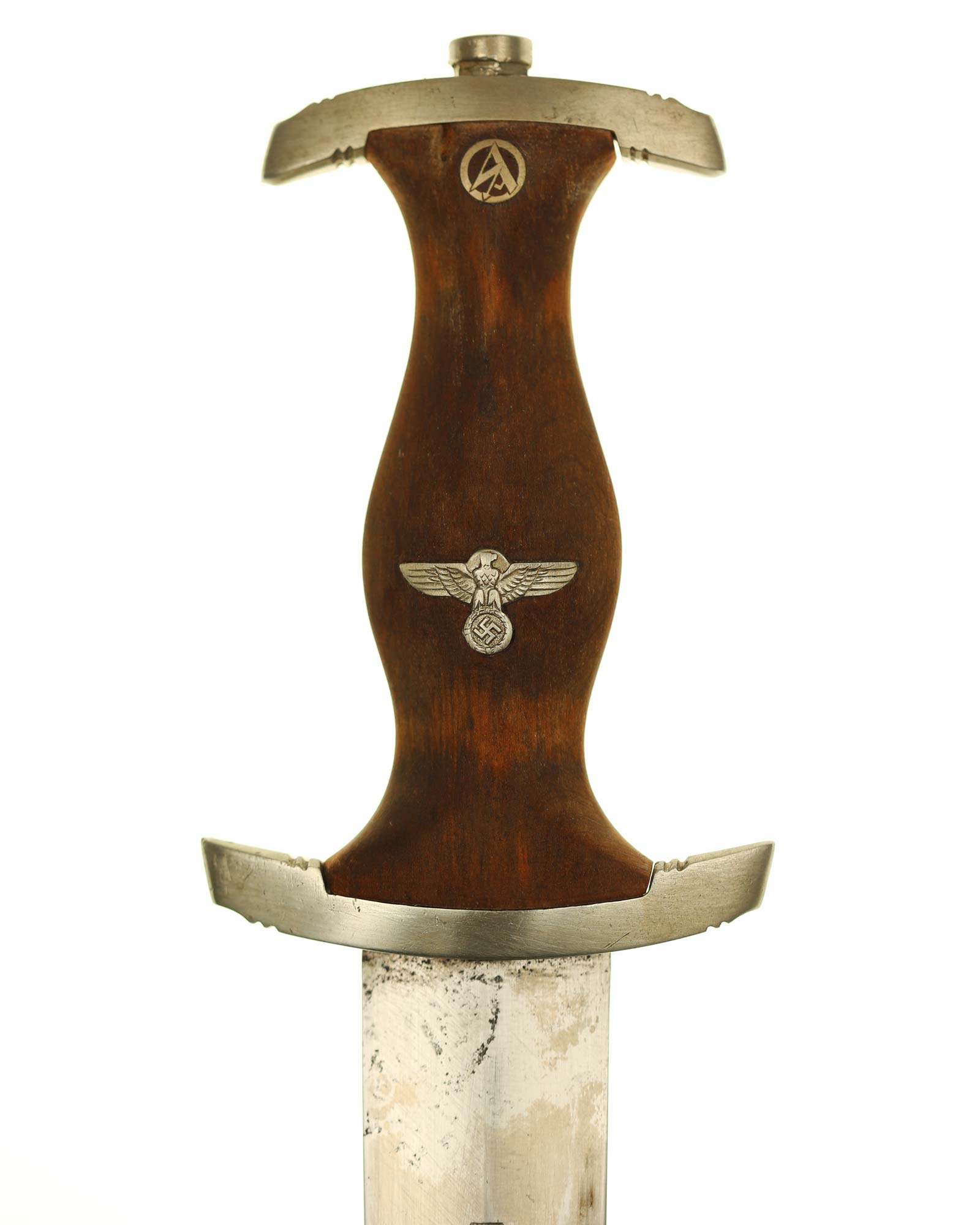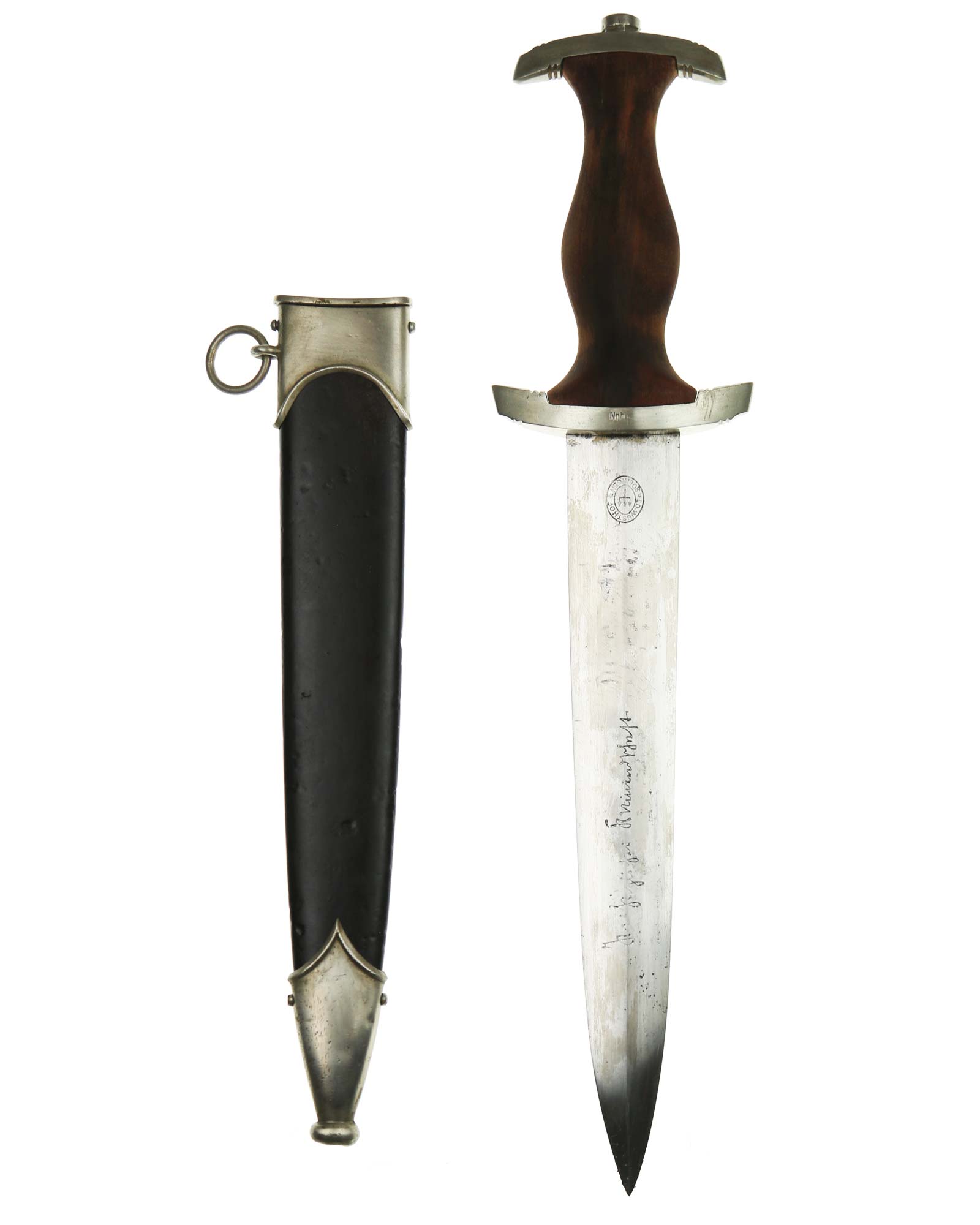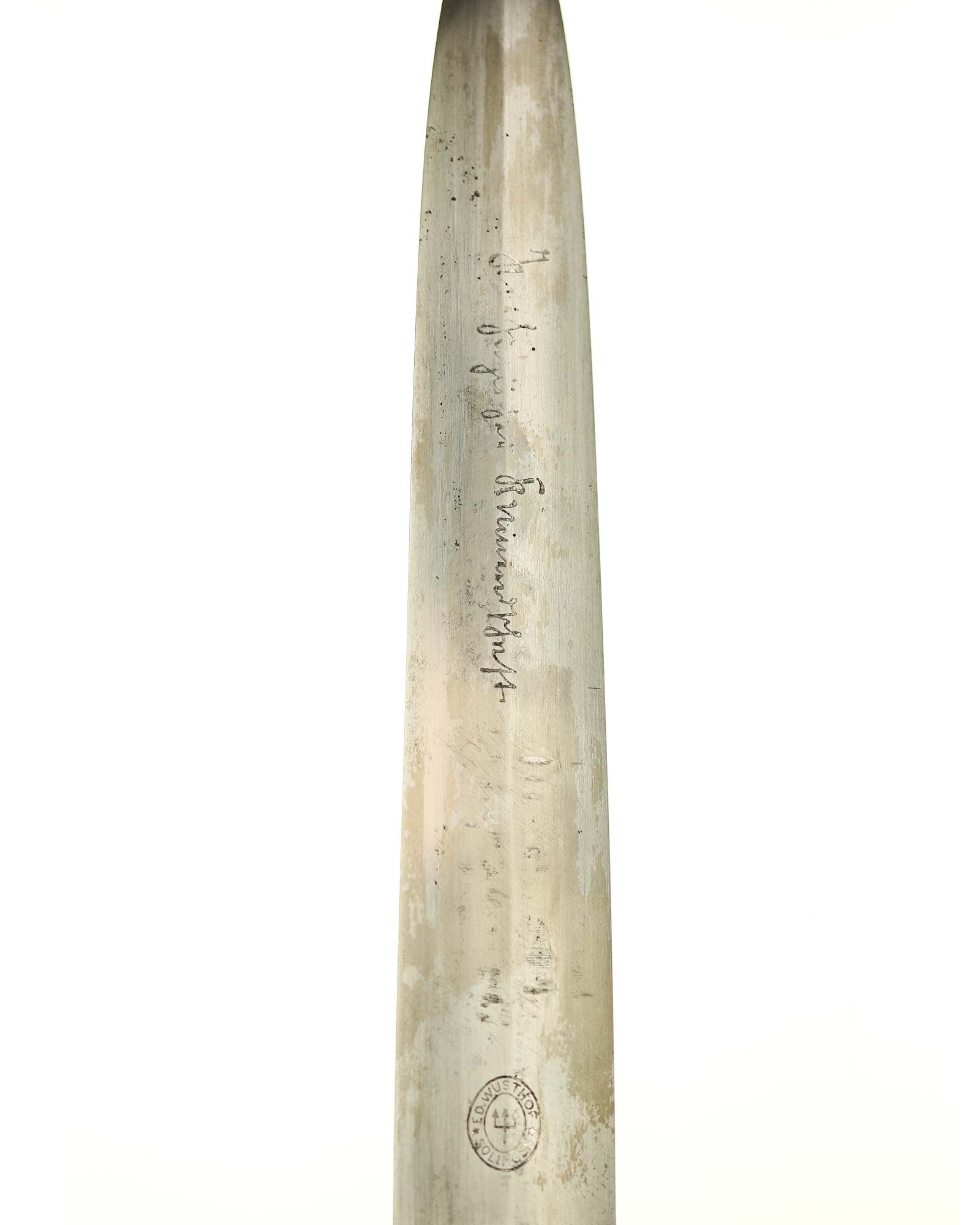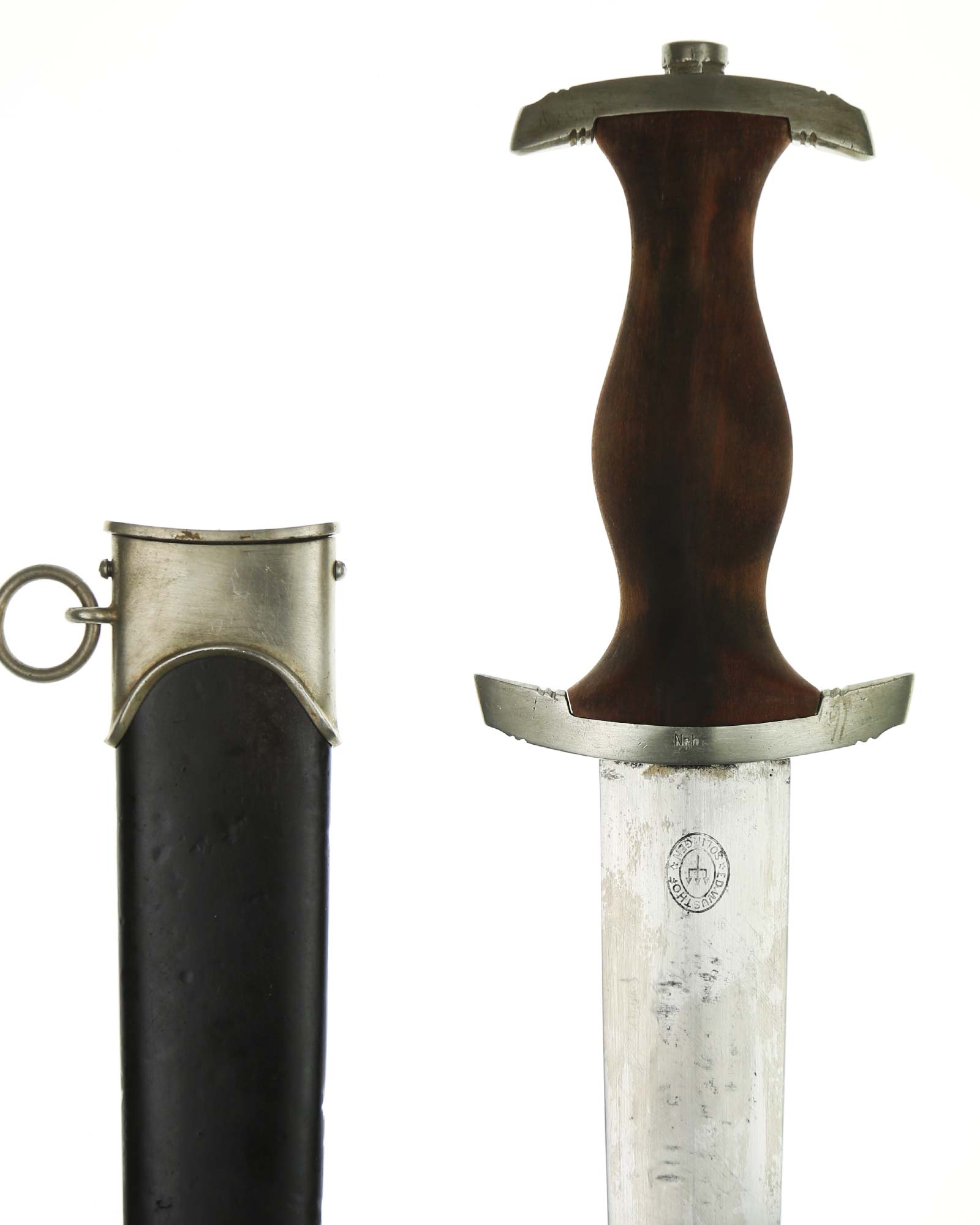 Клинок: Клинок стальной, прямой, двулезвийный, 4-гранный в сечении, без долов. На клинке готическим шрифтом нанесена надпись «Alles für Deutchland» («Всё для Германии»). На другой стороне нанесена надпись «ln herzlicher Kameradschaft Ernst Röhm» (В знак сердечной дружбы Эрнст Рём). К сожалению надпись стёрта частично. Надписи и клейма: возле пяты клинка с тыльной стороны – «Ed. Wüsthof Solingen» — клеймо немецкой фирмы «Эд. Вюстхоф Золинген».