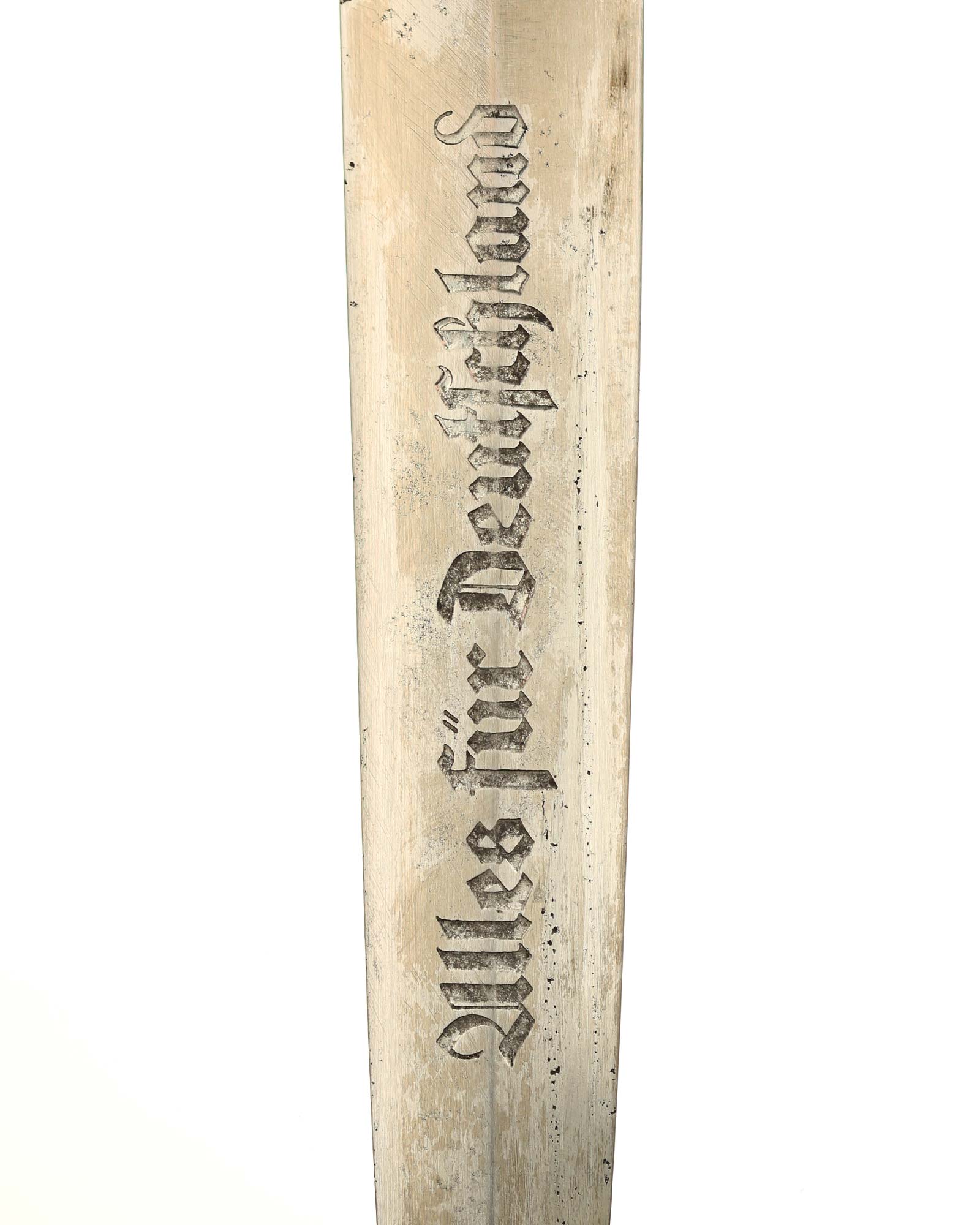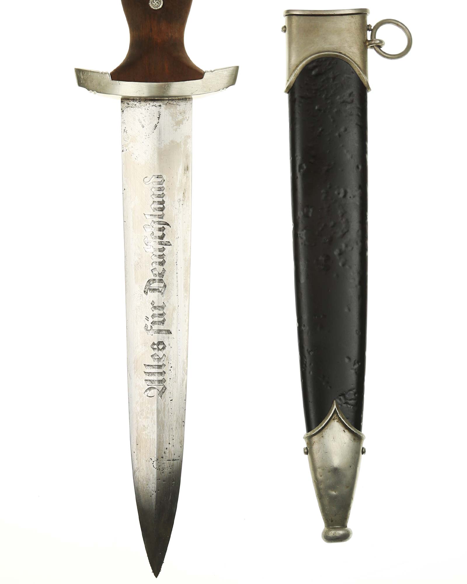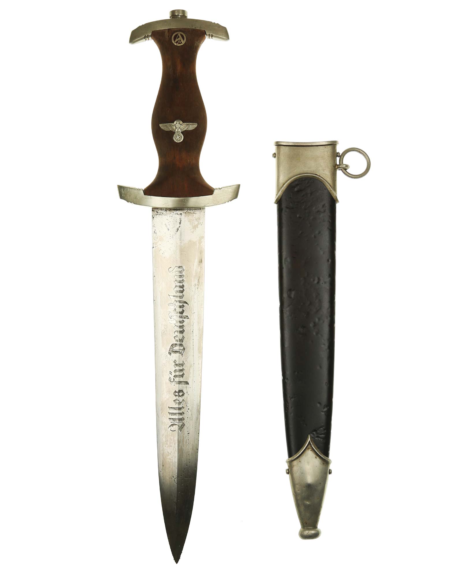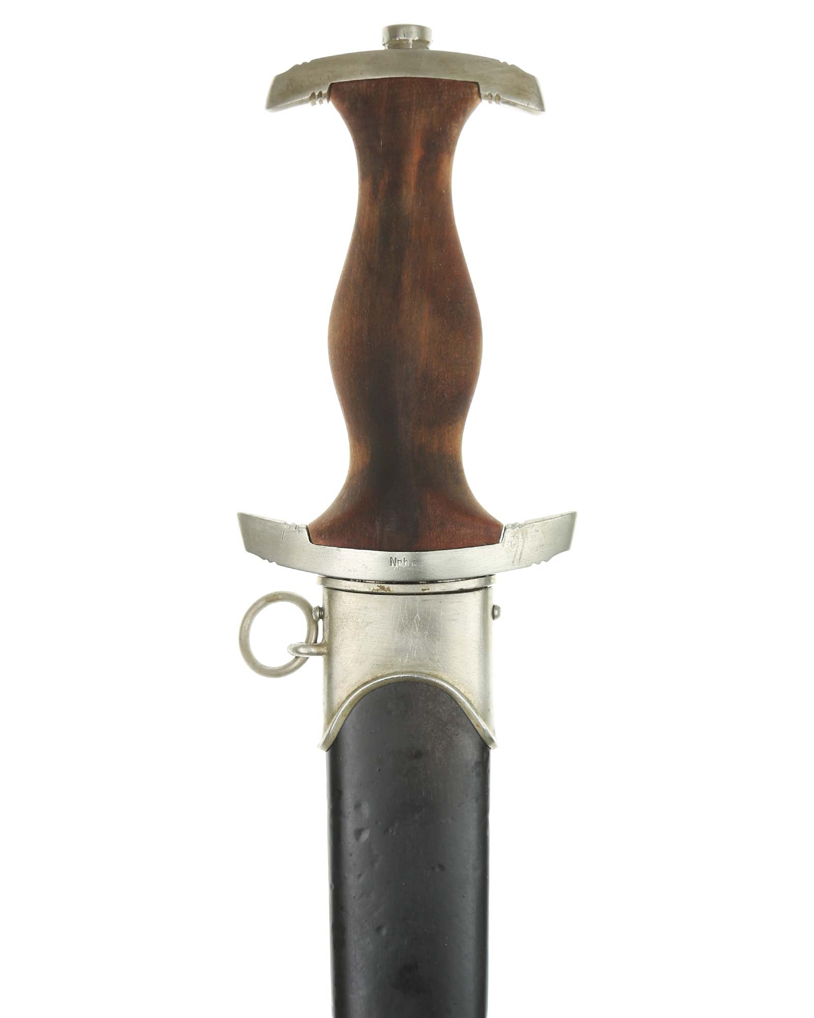 Клинок: Клинок стальной, прямой, двулезвийный, 4-гранный в сечении, без долов. На клинке готическим шрифтом нанесена надпись «Alles für Deutchland» («Всё для Германии»). На другой стороне нанесена надпись «ln herzlicher Kameradschaft Ernst Röhm» (В знак сердечной дружбы Эрнст Рём). К сожалению надпись стёрта частично. Надписи и клейма: возле пяты клинка с тыльной стороны – «Ed. Wüsthof Solingen» — клеймо немецкой фирмы «Эд. Вюстхоф Золинген».