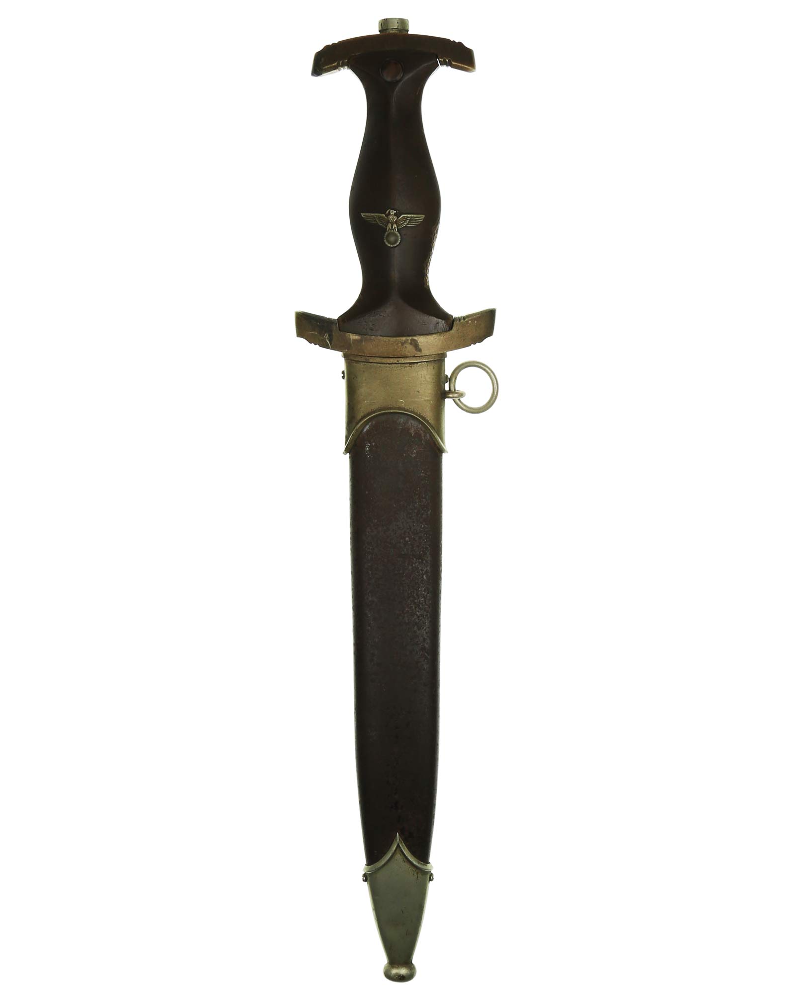 Рукоять: Рукоять из мореного в черный цвет дерева. Рукоять в верхней части имеет вставку в виде черного эмалевого глазка с рунами, в средней части рукояти – металлический знак в виде стилизованного изображения раскинувшего крылья орла, держащего в когтях венок со свастикой. Металлические элементы гарды изготовлены из мельхиора. Крестовина С-образная, белого металла, с концами, чуть загнутыми вверх, в несколько увеличенном и перевернутом виде копирует навершие рукояти.