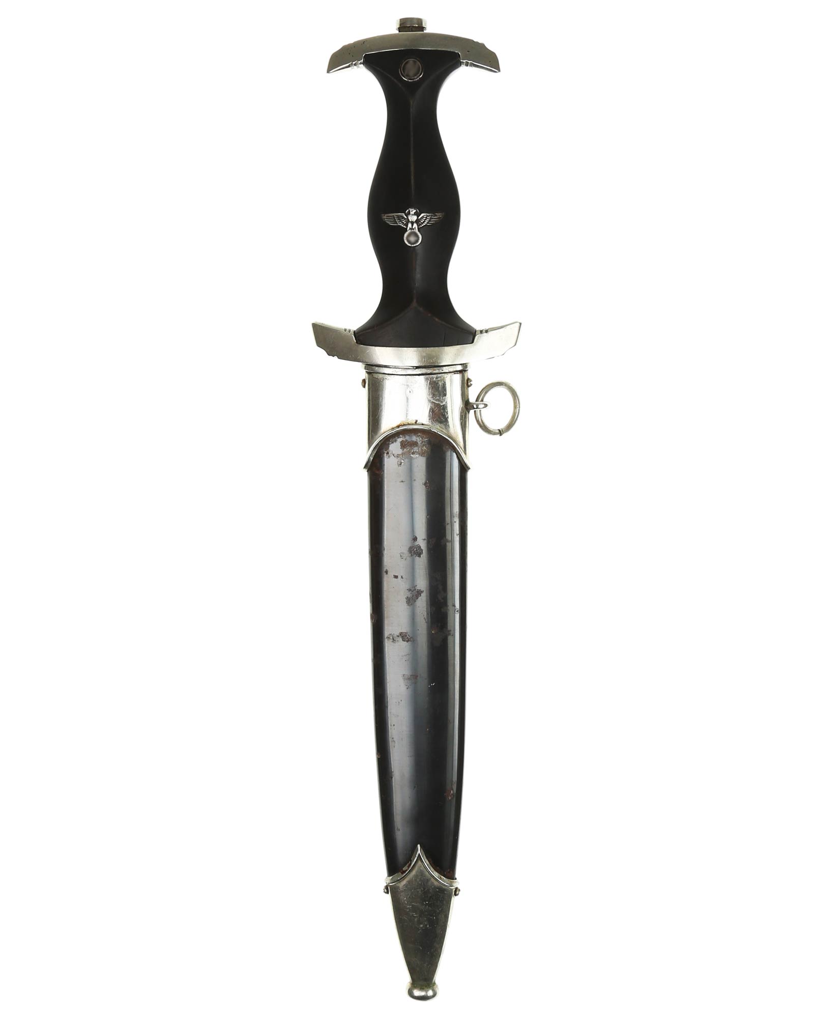 Клинок: Клинок стальной, классический кинжального типа, прямой, двулезвийный, с выраженным центральным ребром. Чрезвычайно редкий вариант кинжала SS "Schutzstaffel" с полностью сохранившейся наградной надписью от главы СС Генриха Гиммлера на оборотной стороне клинка. Кинжал изготовлен в середине 1930-х годов известной фирмой "Carl Eickhorn" (элитной оружейной фирмой в Золингене, выпускавшей высококачественное холодное оружие, в т.ч. для СС), клеймо на клинке маленького размера и расположено очень близко к гарде - это характерно только для наградных кинжалов, чтобы наградная надпись была в пропорции и могла полностью поместиться на клинке. На лицевой стороне клинка традиционно нанесен девиз SS "Meine Ehre heißt Treue" (Моя честь называется Верность). На оборотной стороне помещена дарственная надпись "In herzlicher Kameradshaft Ernst Röhm" (В знак сердечной дружбы Эрнст Рём).