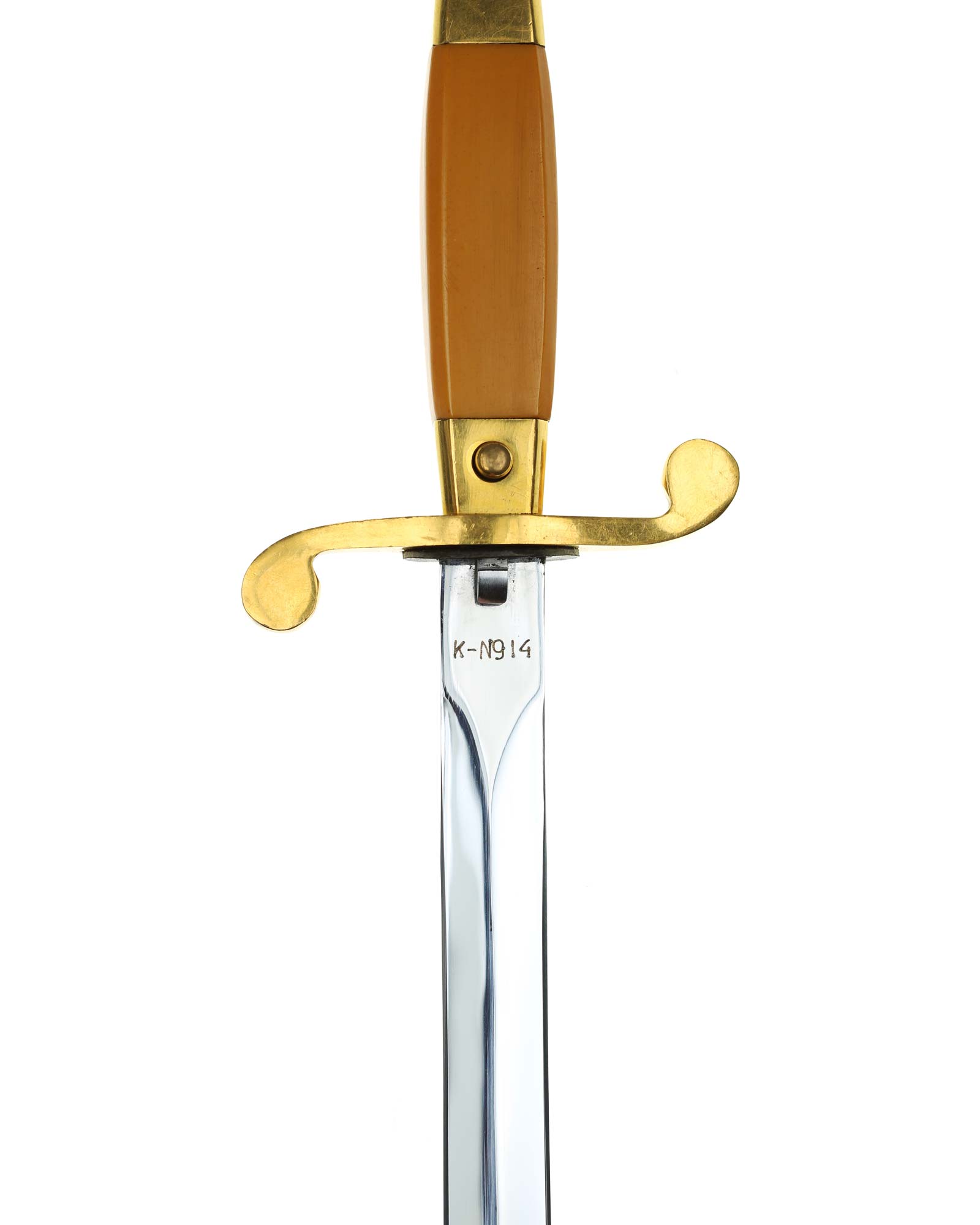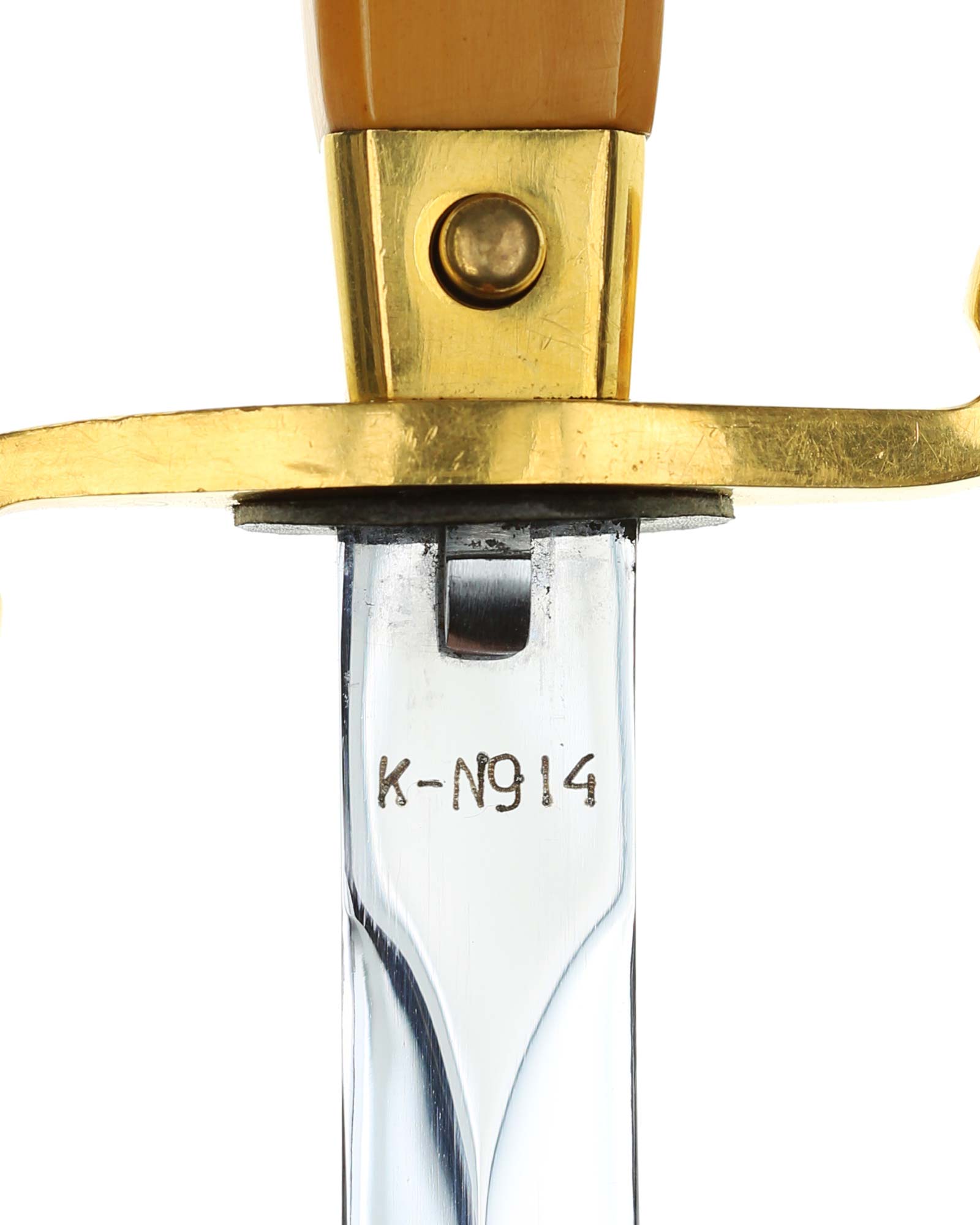 Клинок: Клинок прямой, стальной, двулезвийный, ромбического сечения, никелированный, без долов. На пяте клинка с одной стороны нанесена аббревиатура производителя и год выпуска изделия в виде надписи «ЗиК/1952», с оборотной стороны номер и серия оружия» № K-N914»