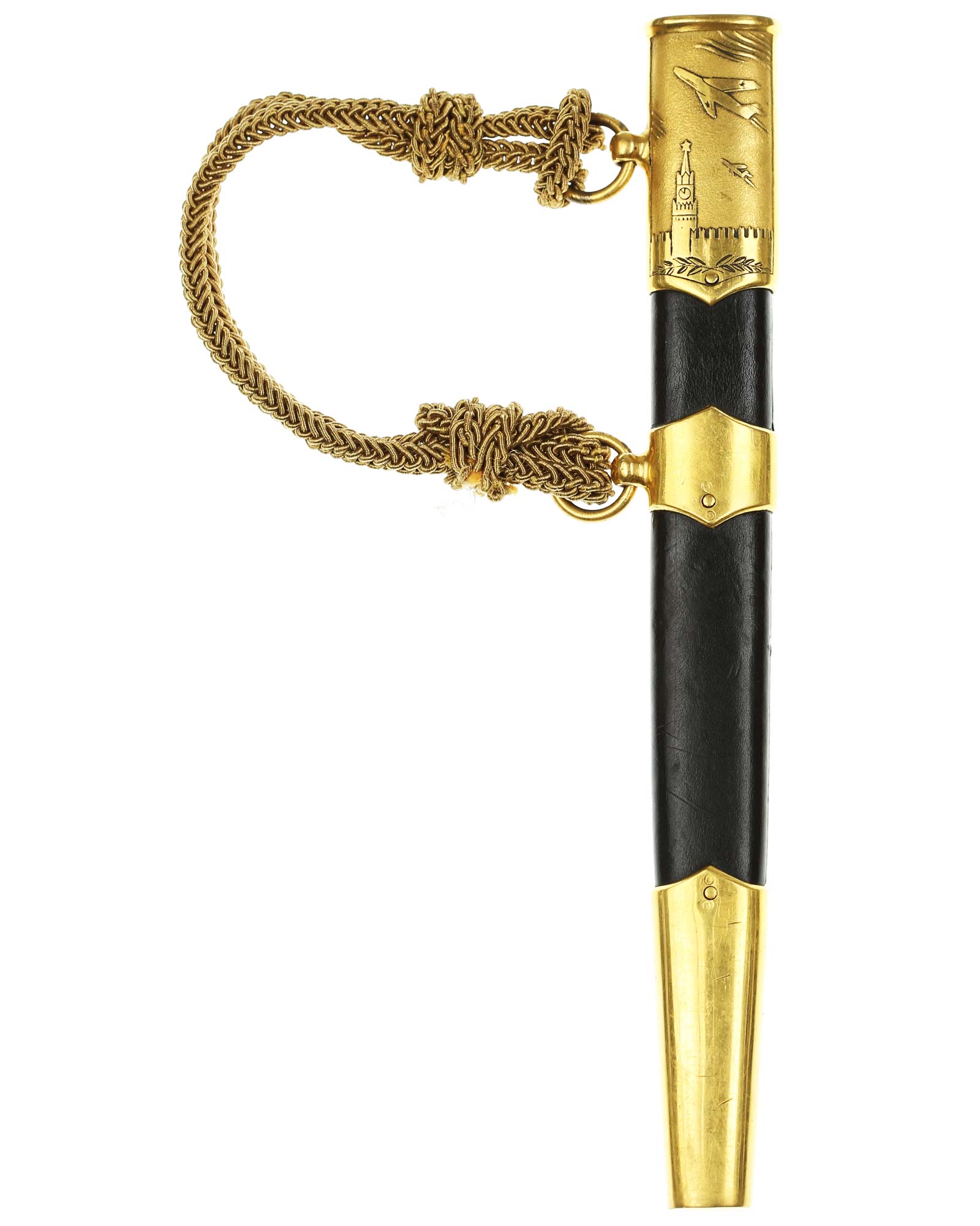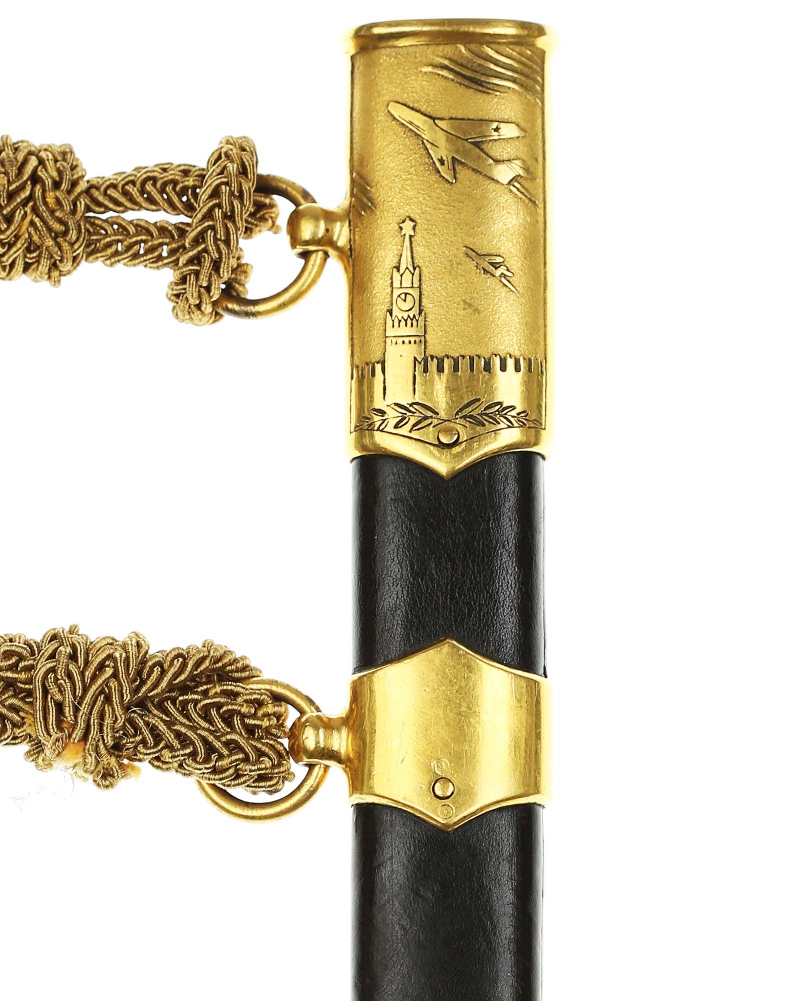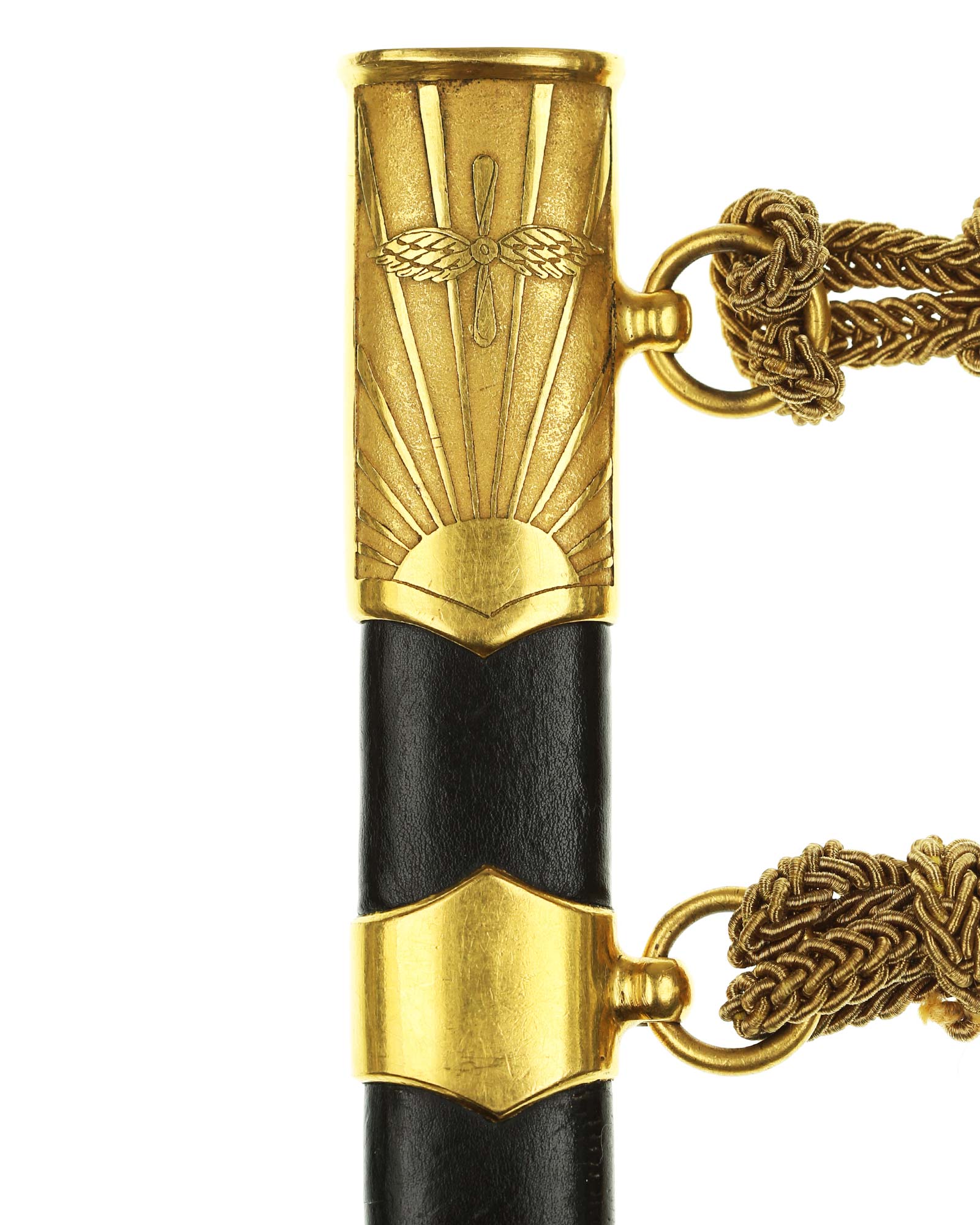 Ножны: Ножны деревянные, обтянутые черной кожей. Прибор ножен латунный, позолоченный, с зубчатыми краями, состоит из устья, обоймицы и наконечника. На устье с одной стороны нанесено изображение самолетов. На устье и гайке имеются подвижные кольца для ремней портупеи.