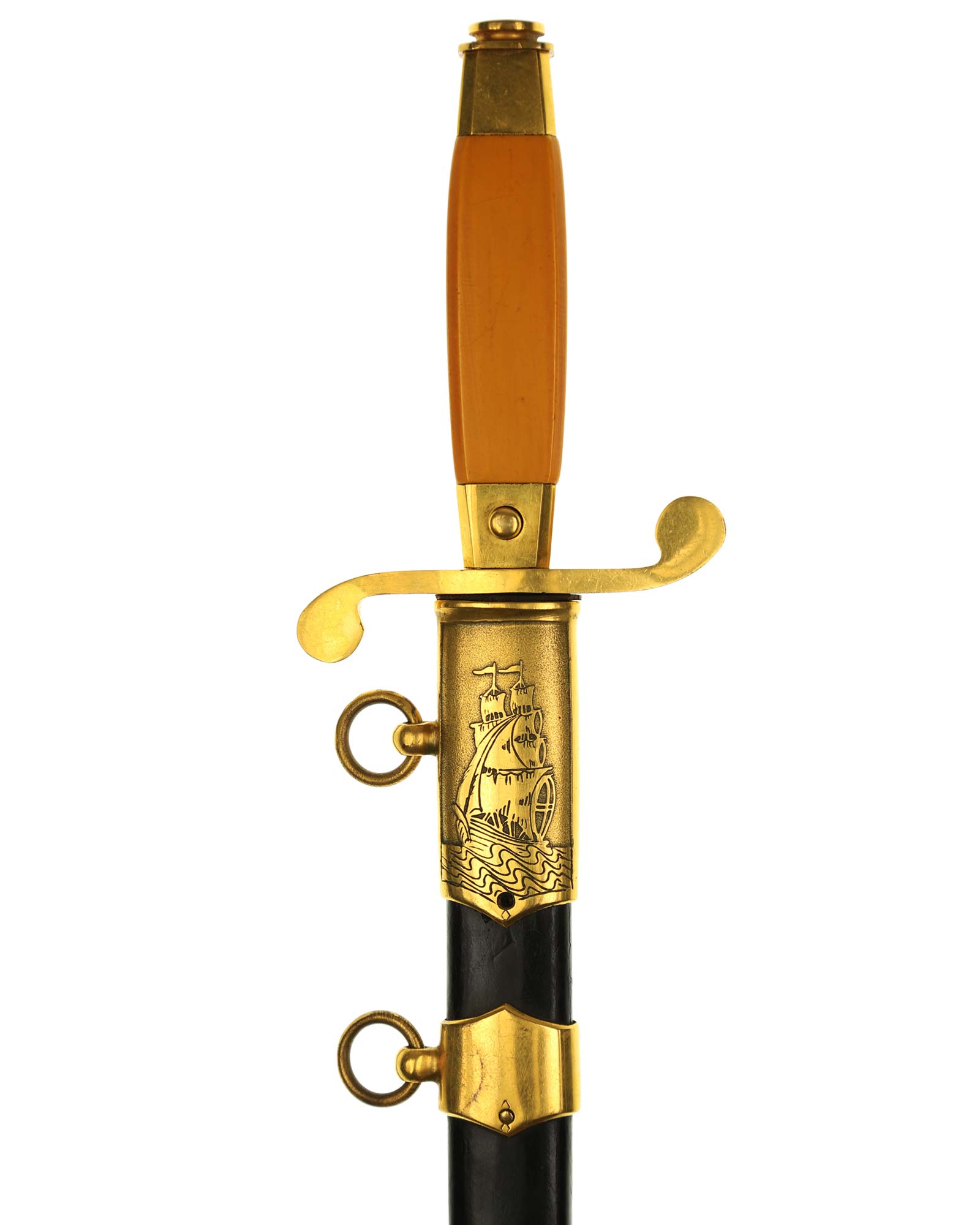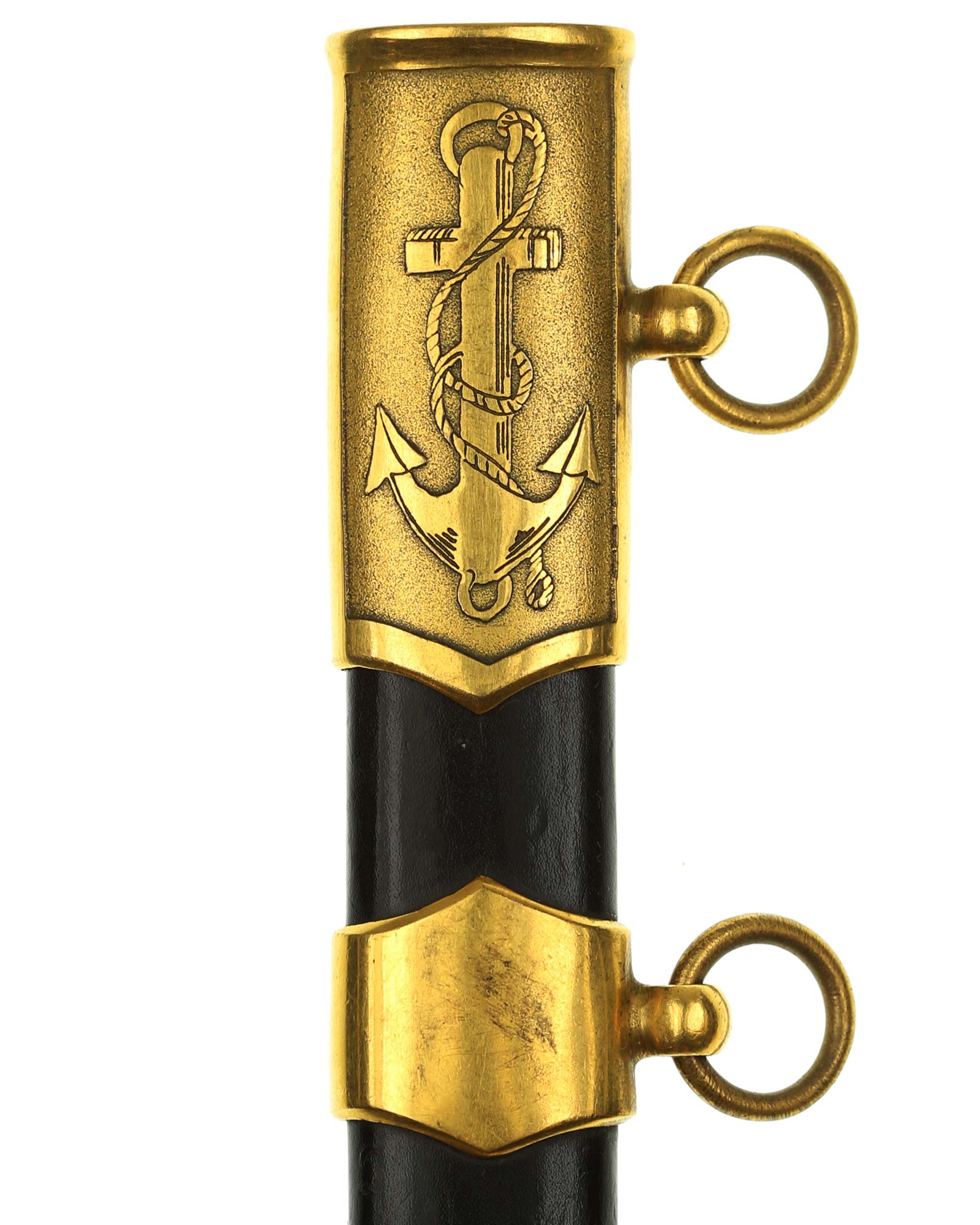 Ножны: Ножны деревянные, обтянутые черной кожей. Прибор ножен латунный, позолоченный, с зубчатыми краями, состоит из устья, обоймицы и наконечника. На устье с одной стороны нанесено изображение якоря, с другой стороны парусного корабля. На устье и гайке имеются подвижные кольца для ремней портупеи.