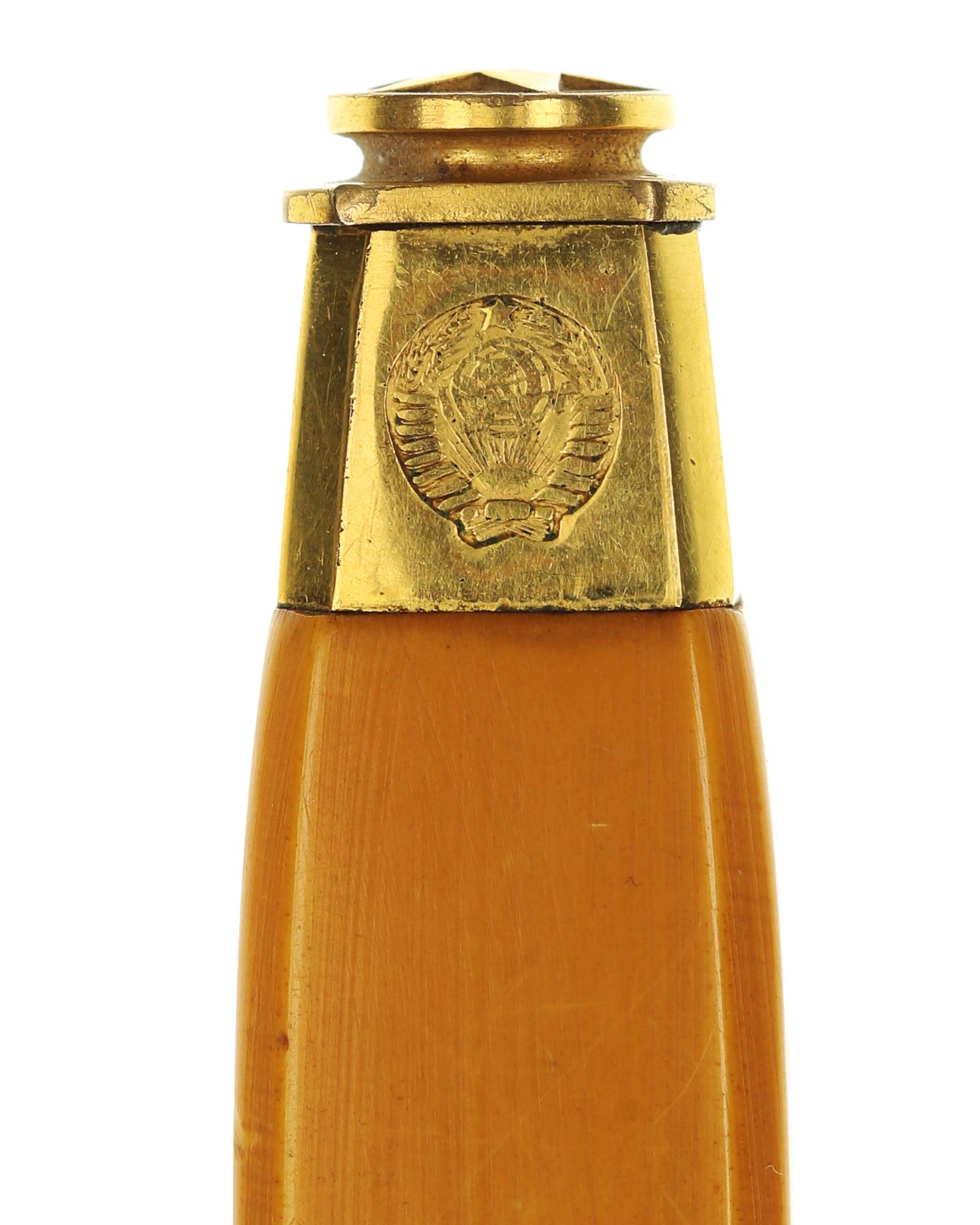 Рукоять: Рукоять выполнена из желтого пластика. Навершие рукояти латунное, винт крепления выполнен в виде шайбы с латунной пятиконечной звездой. На навершии рукояти стоит изображение советского герба. Крестовина рукояти латунная, S-образная. У основании рукояти коническая латунная втулка, в которой располагается кнопка, соединенная с двумя пружинами у пяты клинка, предназначенными для фиксации клинка в ножнах.