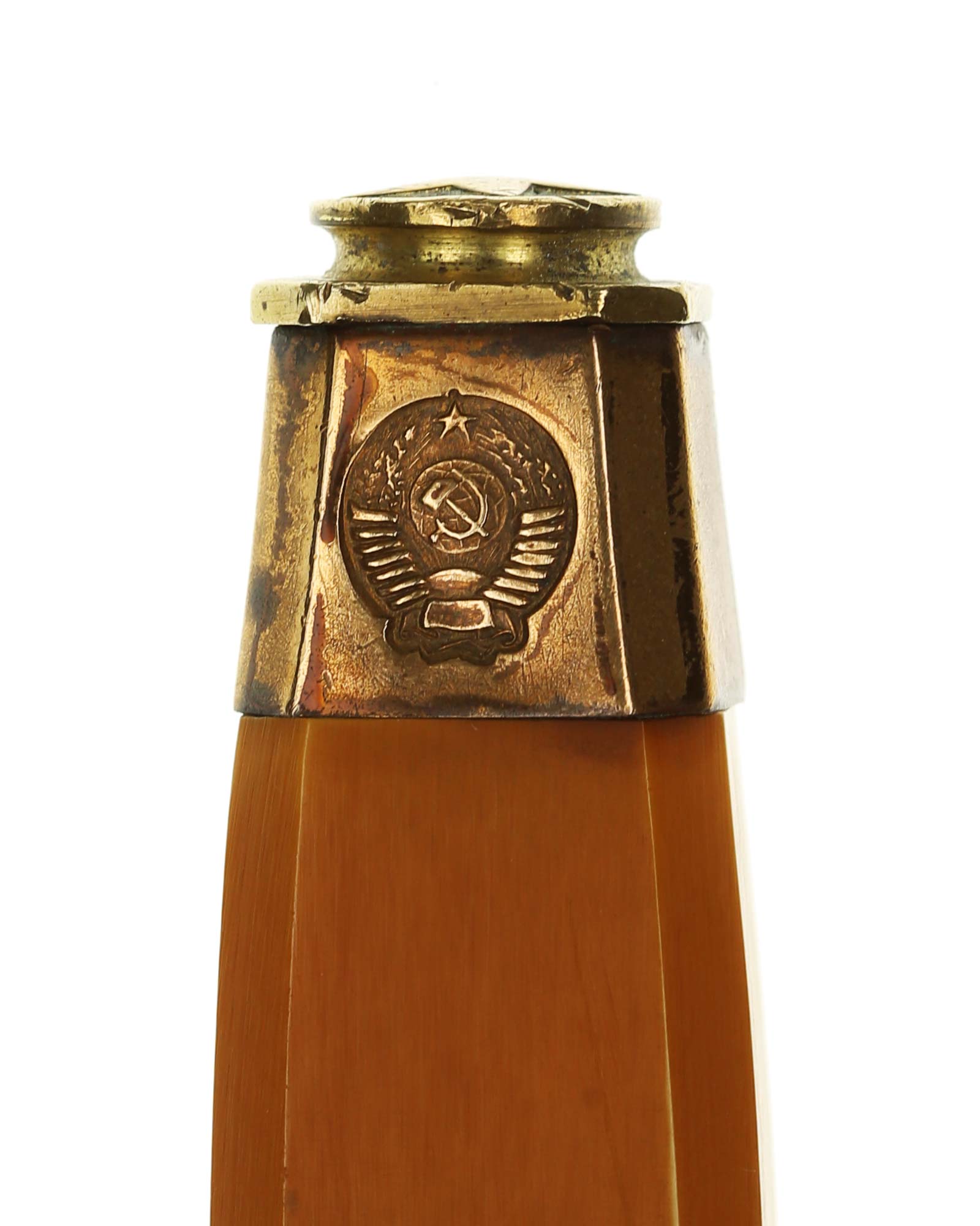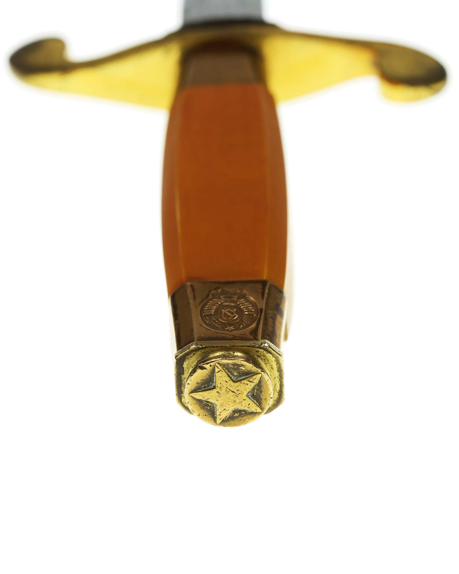 Рукоять: Рукоять прямая, из пластмассы, оранжевого цвета, бочкообразная, прямоугольного сечения, с фасками. Сверху и снизу имеются конические втулки. На верхней втулке расположено изображение Государственного герба СССР. Сверху на хвостовик клинка навинчивается прямоугольная гайка со слабо выступающим рельефным изображением пятиконечной звезды на круглом щите. Крестовина прямая, плоская, с загнутыми в разные стороны закругленными окончаниями. Ножны покрыты черной кожей.