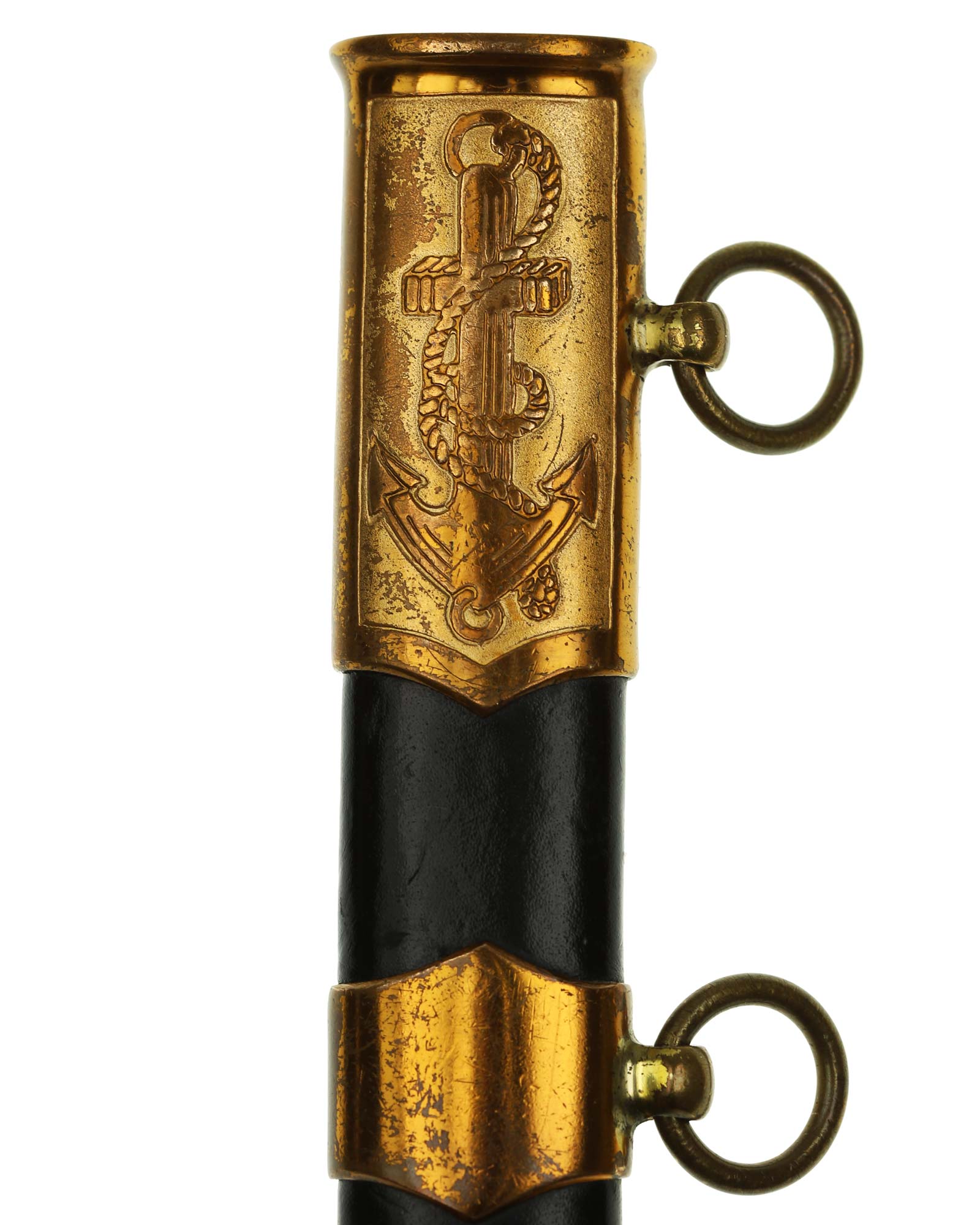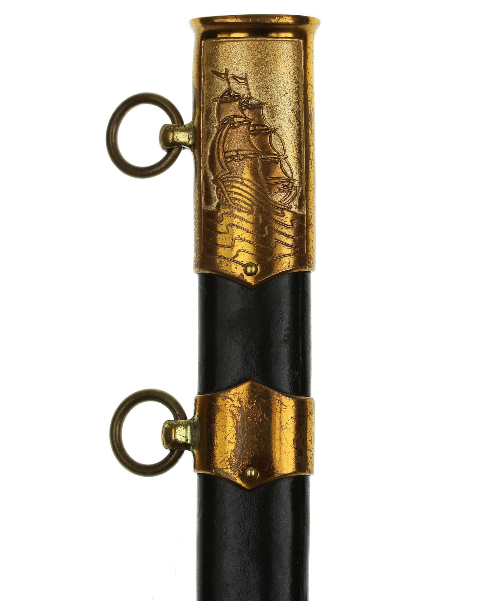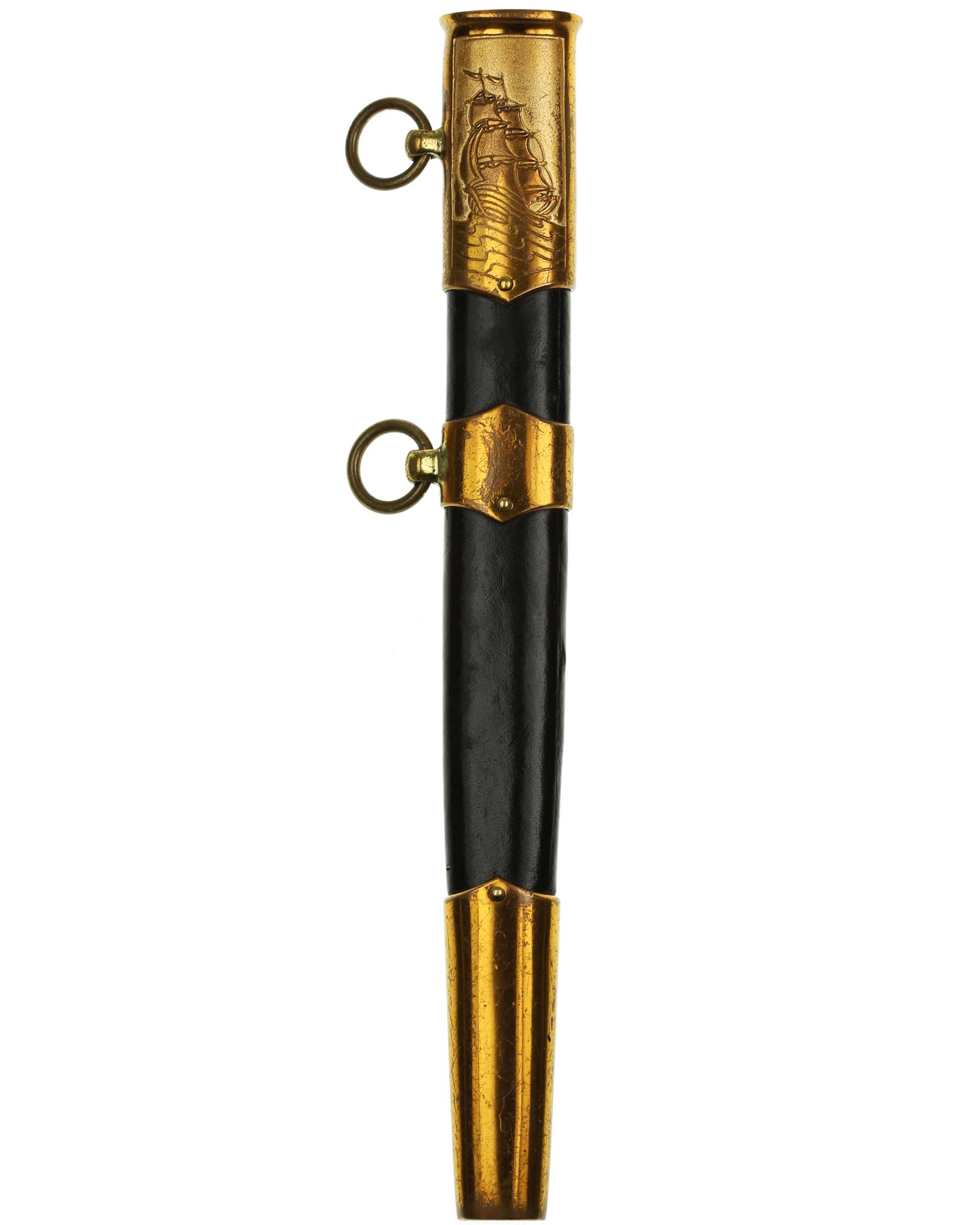 Ножны: Прибор ножен латунный, позолоченный, с зубчатыми краями, состоит из устья, обоймицы и наконечника. На устье с одной стороны нанесено изображение якоря, с другой стороны парусного корабля. На устье и гайке имеются подвижные кольца для ремней портупеи.