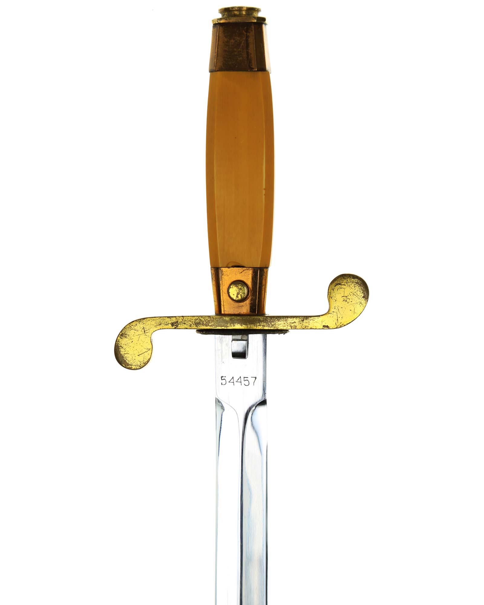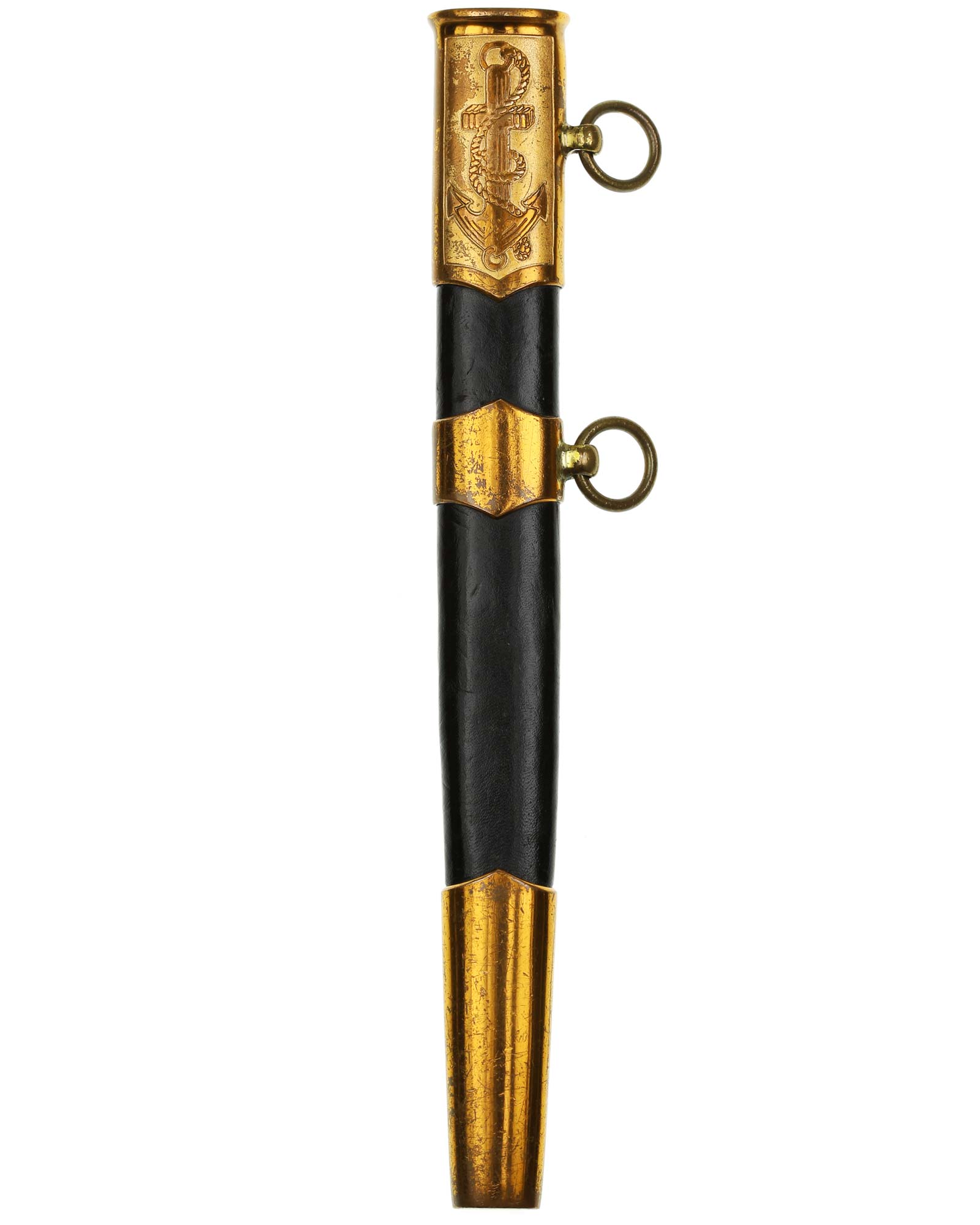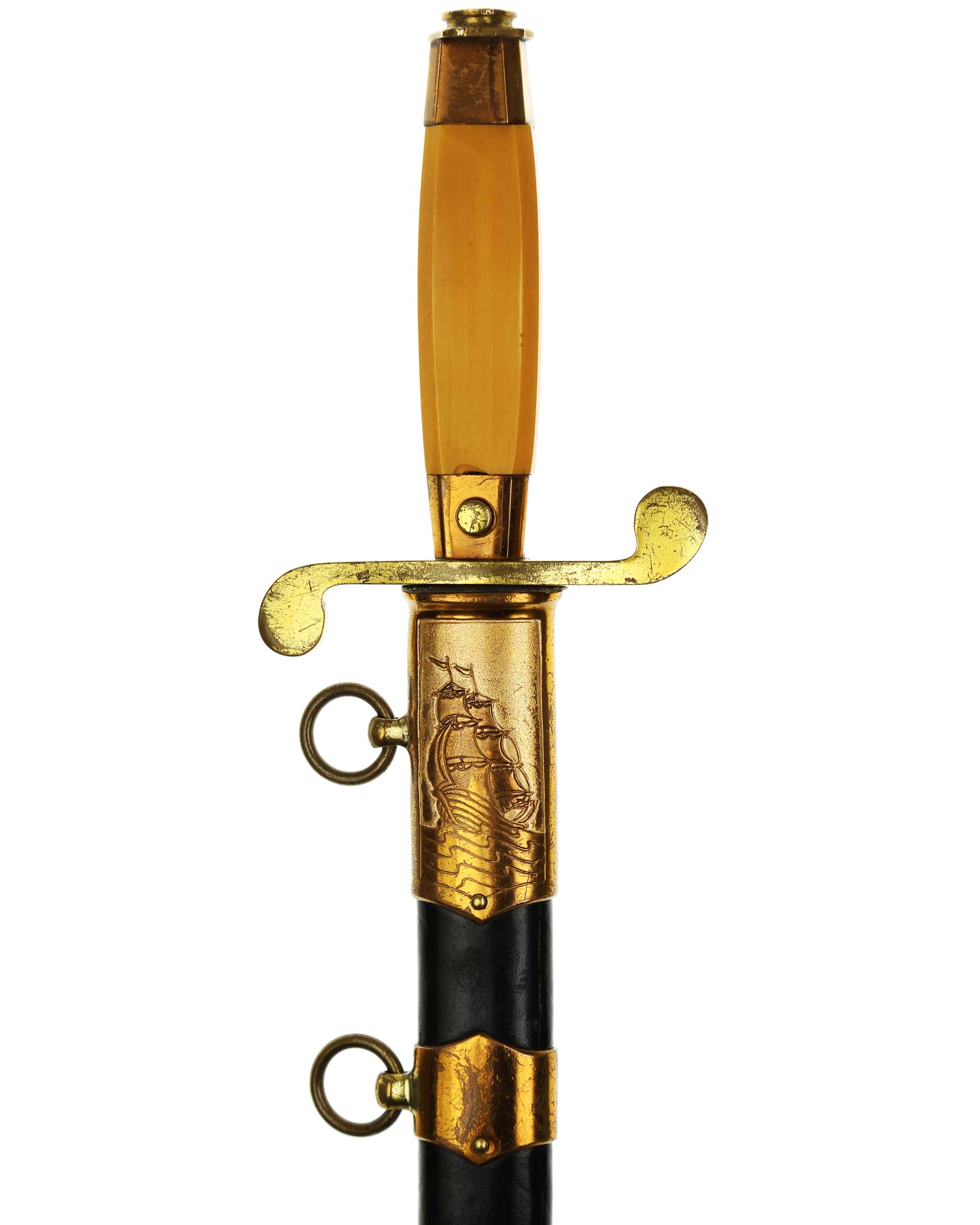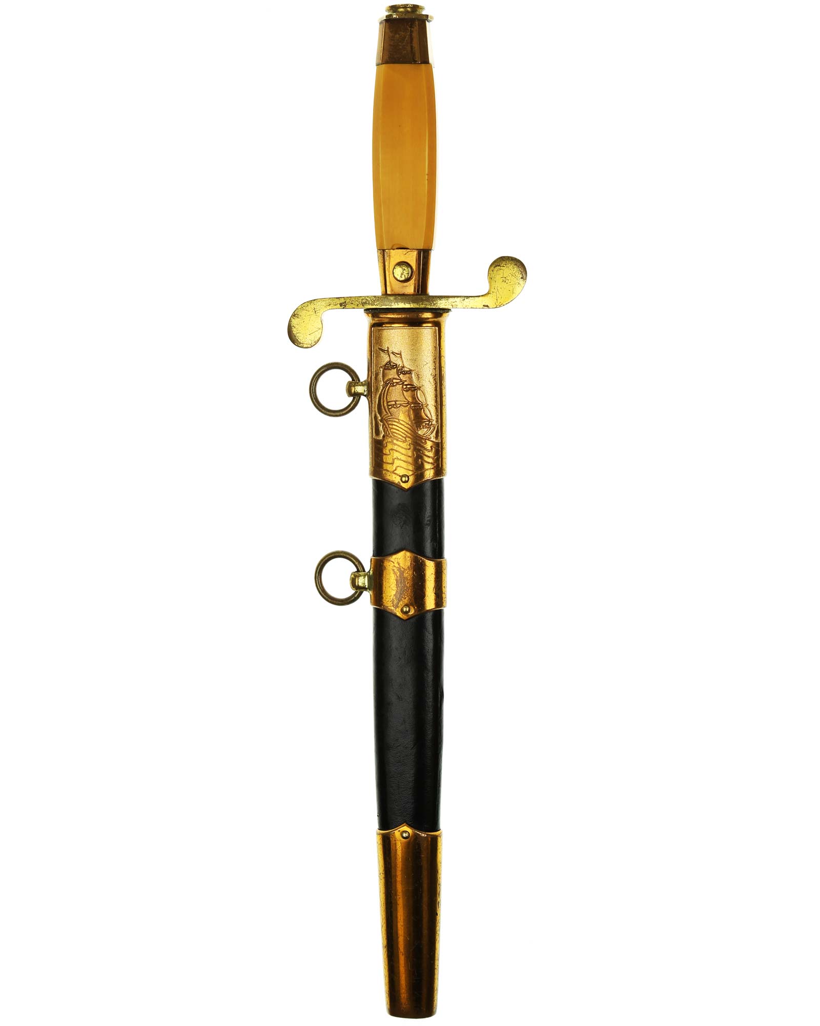 Ножны: Прибор ножен латунный, позолоченный, с зубчатыми краями, состоит из устья, обоймицы и наконечника. На устье с одной стороны нанесено изображение якоря, с другой стороны парусного корабля. На устье и гайке имеются подвижные кольца для ремней портупеи.