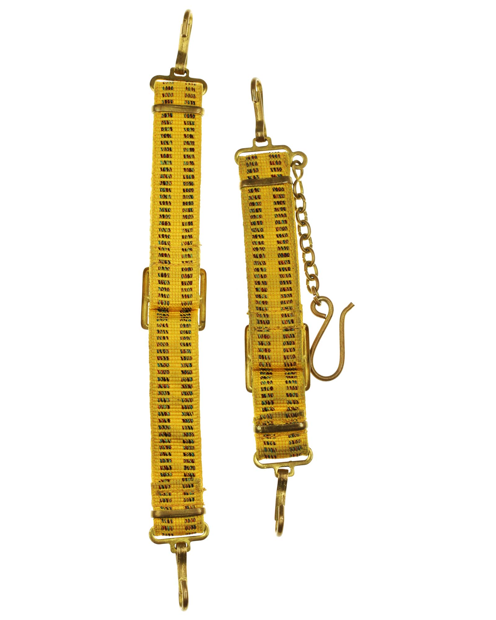 Ножны: Ножны деревянные, обтянутые черной кожей. Прибор ножен латунный, позолоченный, с зубчатыми краями, состоит из устья, обоймицы и наконечника. На устье с одной стороны нанесено изображение якоря, с другой стороны парусного корабля. На устье и гайке имеются подвижные кольца для ремней портупеи. Кортик комплектуется пасовыми ремнями подвеса.