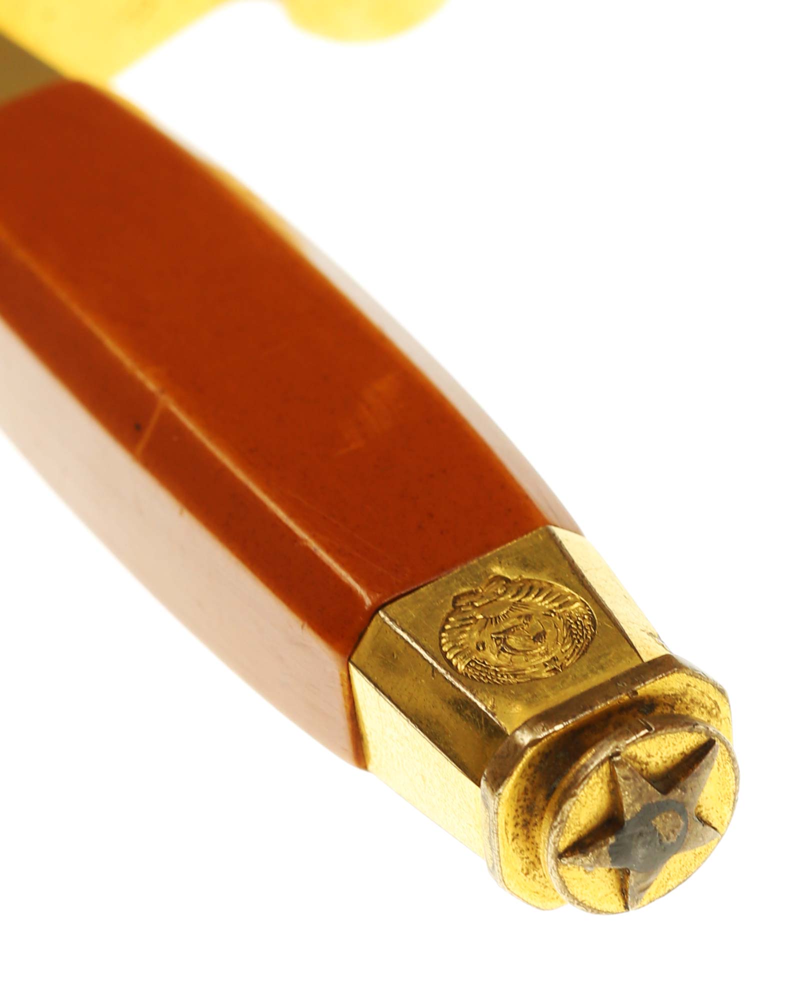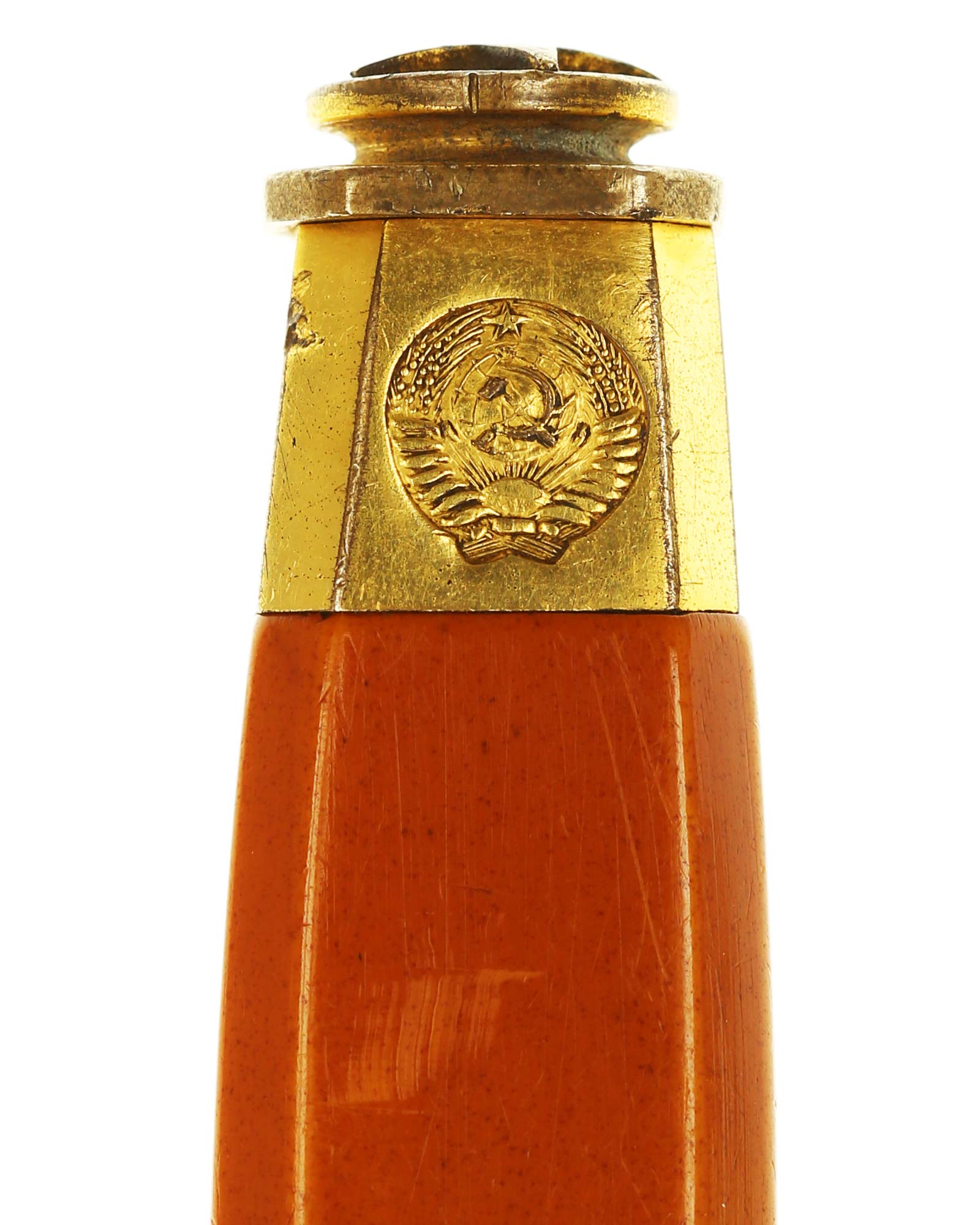 Рукоять: Рукоять выполнена из желтого пластика. Навершие рукояти латунное, винт крепления выполнен в виде шайбы с латунной пятиконечной звездой. На навершии рукояти стоит изображение советского герба. Крестовина рукояти латунная, S-образная. У основании рукояти коническая латунная втулка, в которой располагается кнопка, соединенная с двумя пружинами у пяты клинка, предназначенными для фиксации клинка в ножнах.