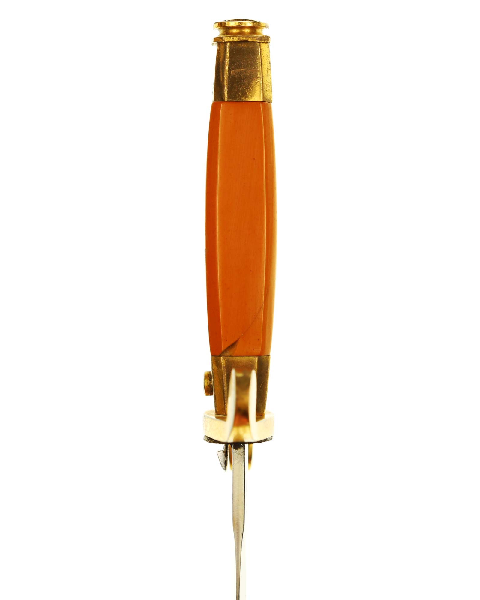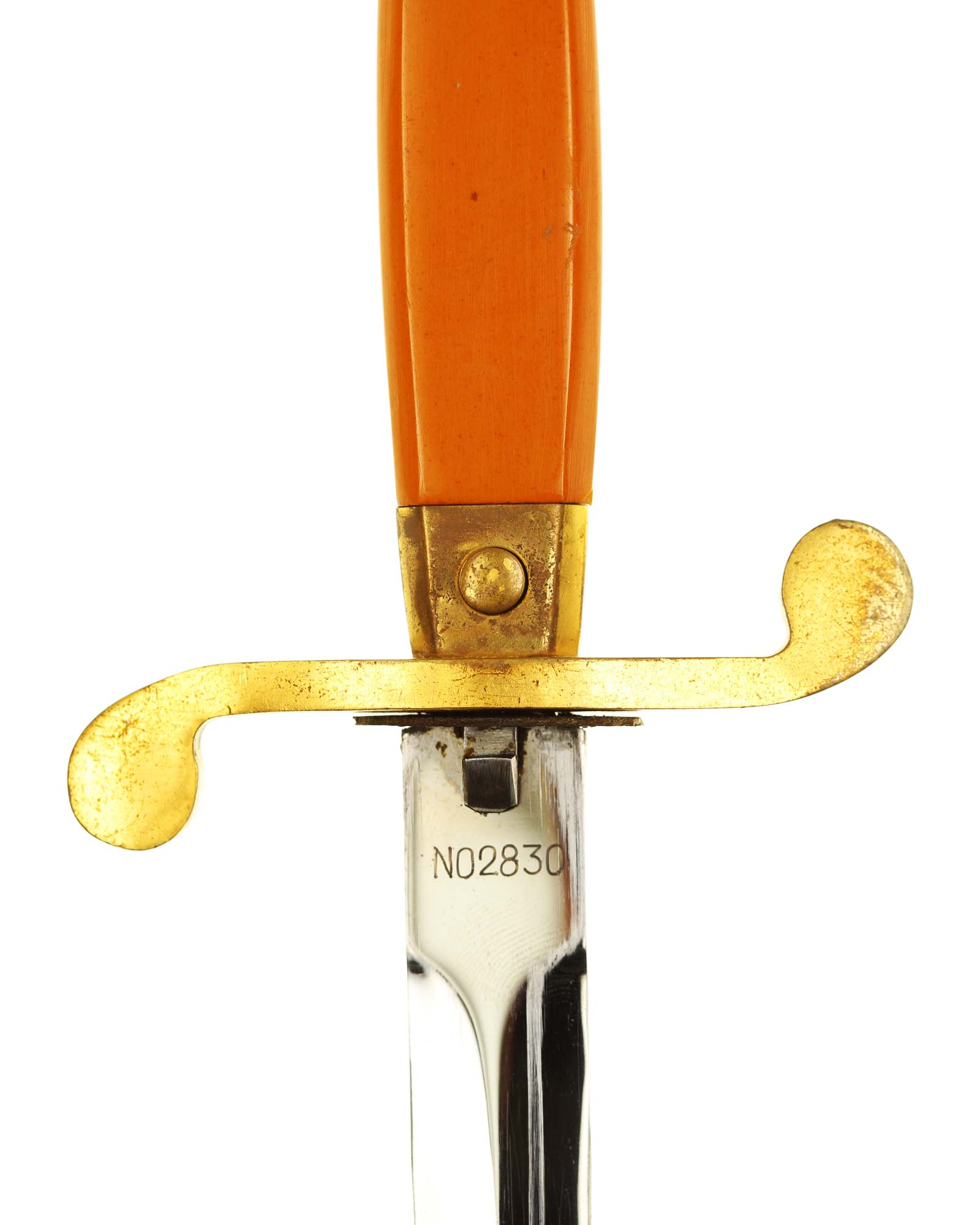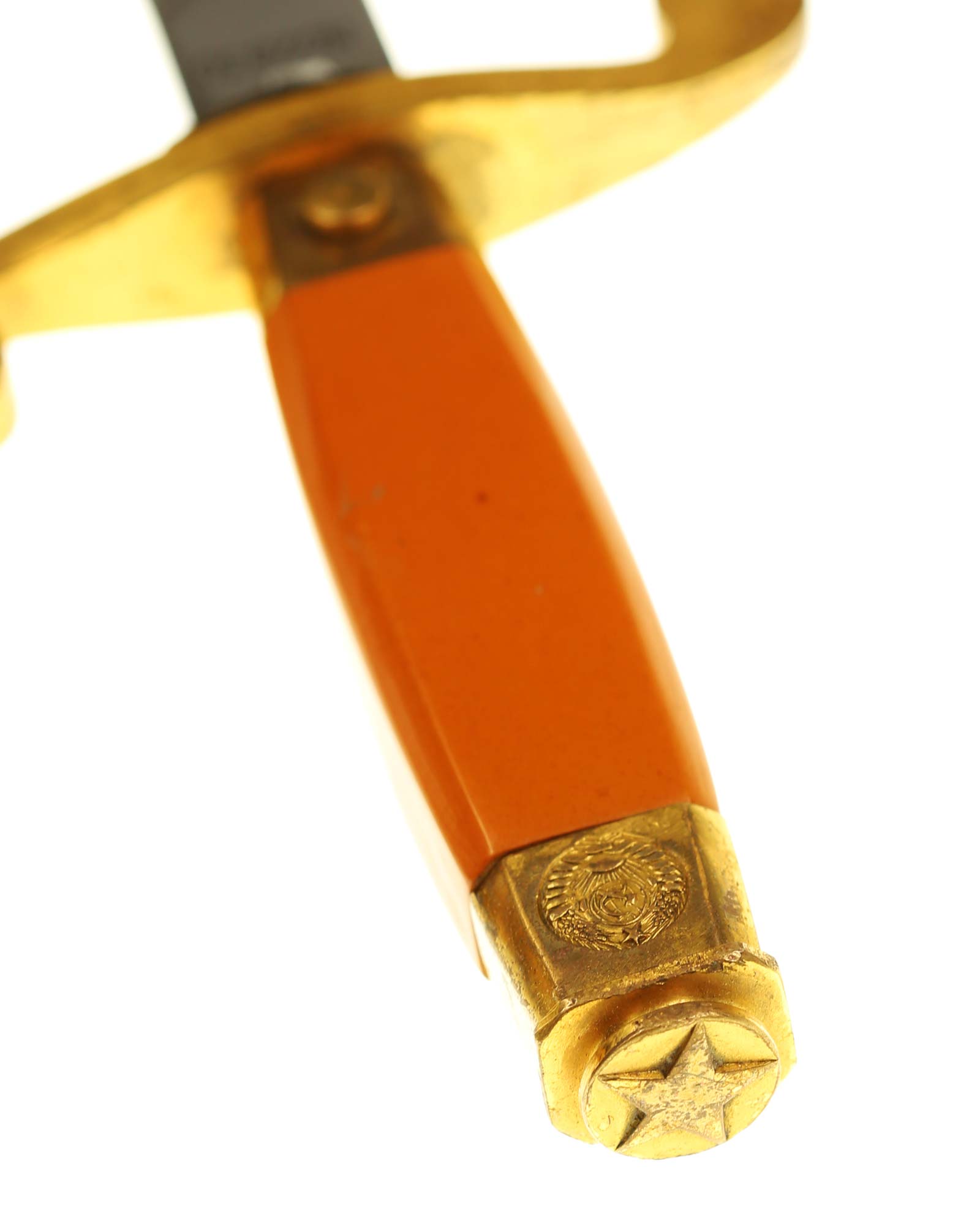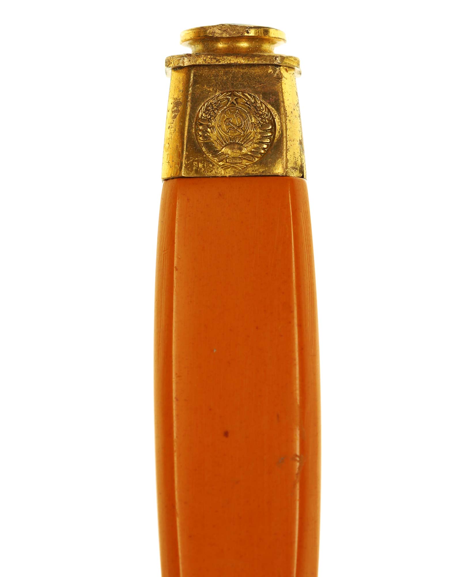 Рукоять: Рукоять выполнена из желтого пластика. Навершие рукояти латунное, винт крепления выполнен в виде шайбы с латунной пятиконечной звездой. На навершии рукояти стоит изображение советского герба. Крестовина рукояти латунная, S-образная. У основании рукояти коническая латунная втулка, в которой располагается кнопка, соединенная с двумя пружинами у пяты клинка, предназначенными для фиксации клинка в ножнах.