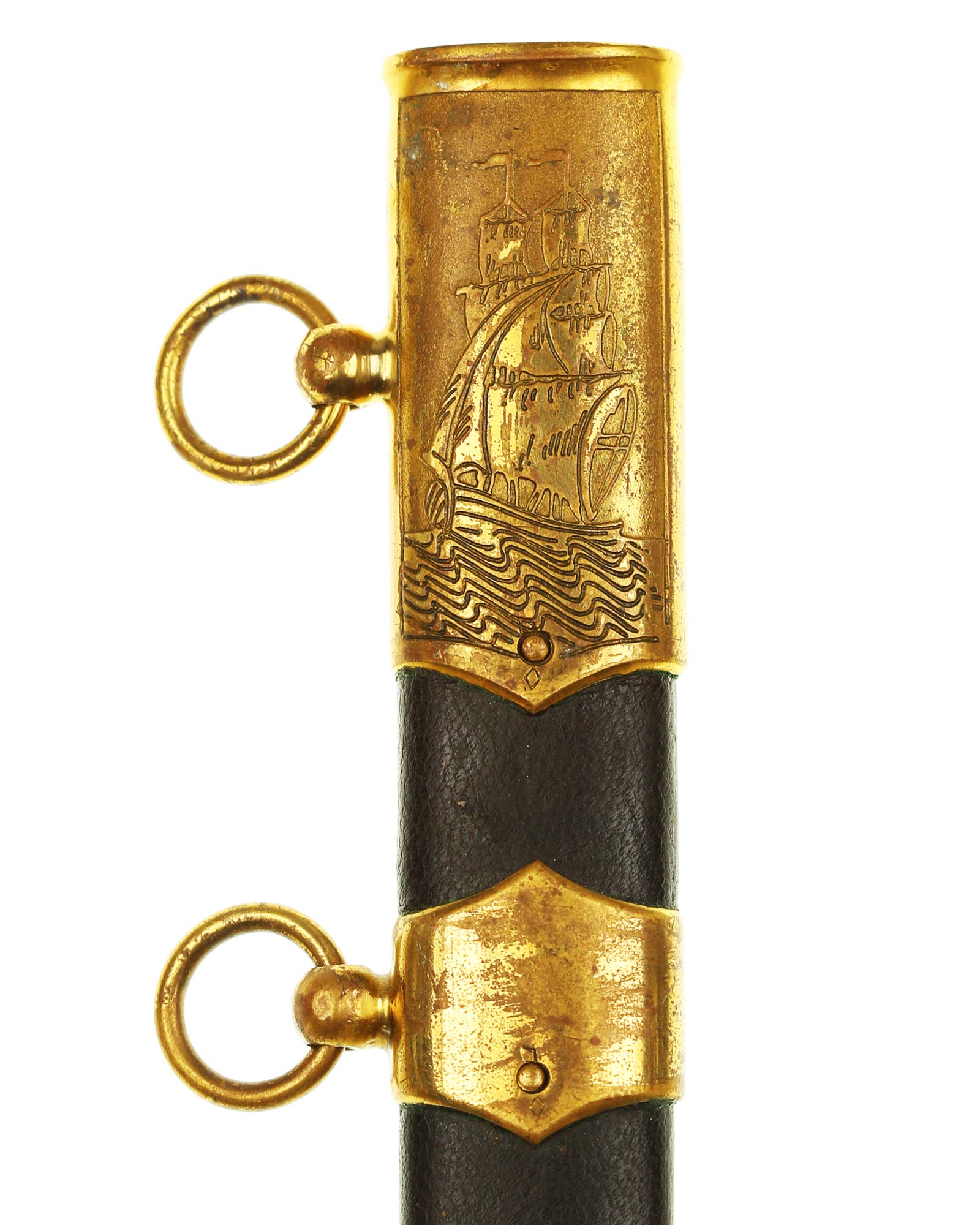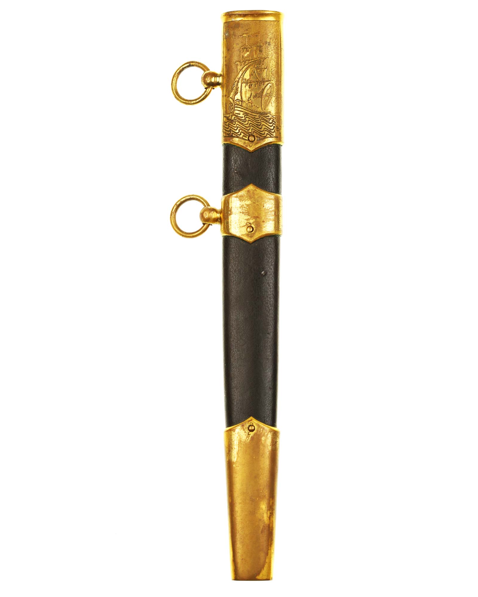 Ножны: Ножны деревянные, обтянутые черной кожей. Прибор ножен латунный, позолоченный, с зубчатыми краями, состоит из устья, обоймицы и наконечника. На устье с одной стороны нанесено изображение якоря, с другой стороны парусного корабля. На устье и гайке имеются подвижные кольца для ремней портупеи. Кортик комплектуется пасовыми ремнями подвеса.