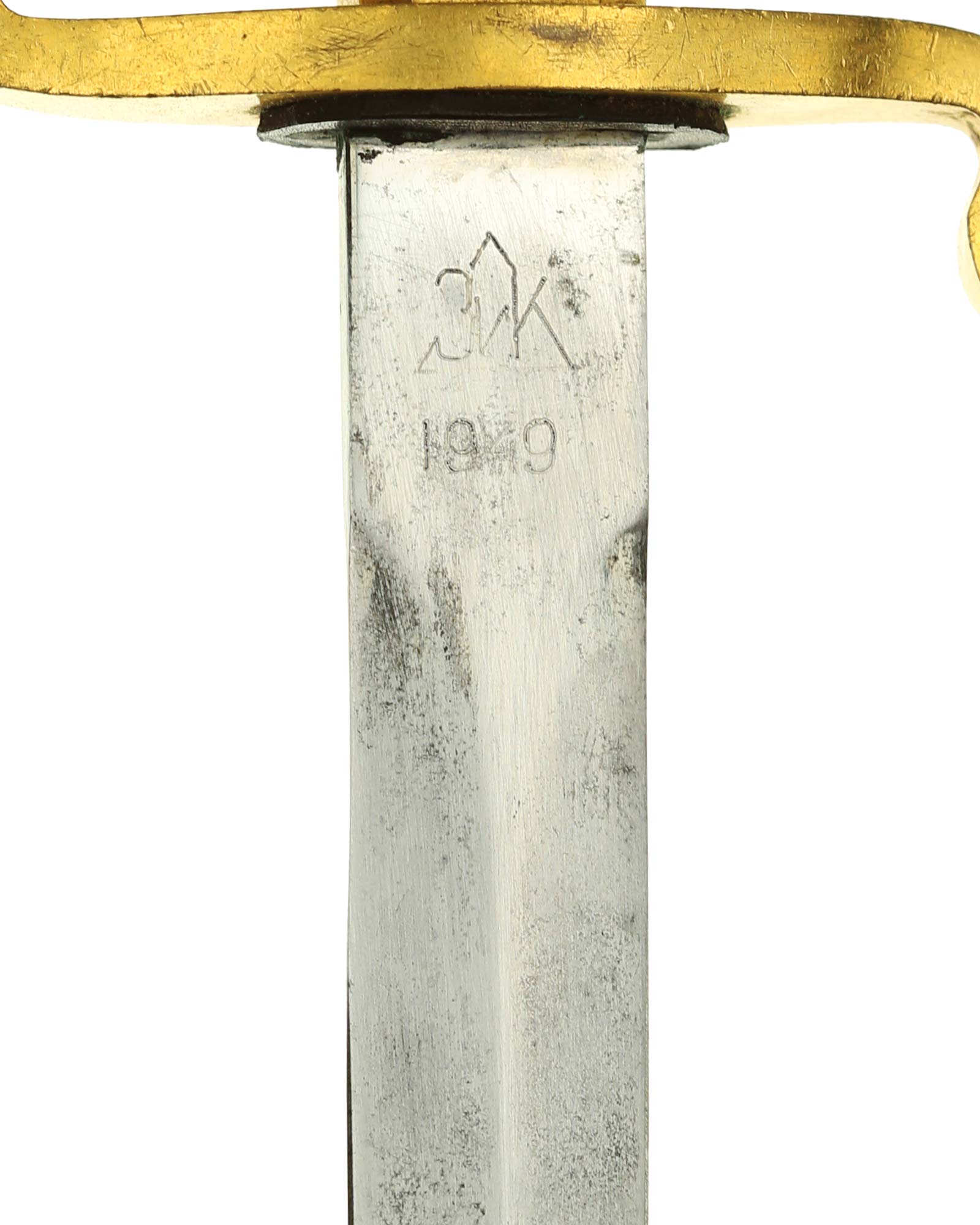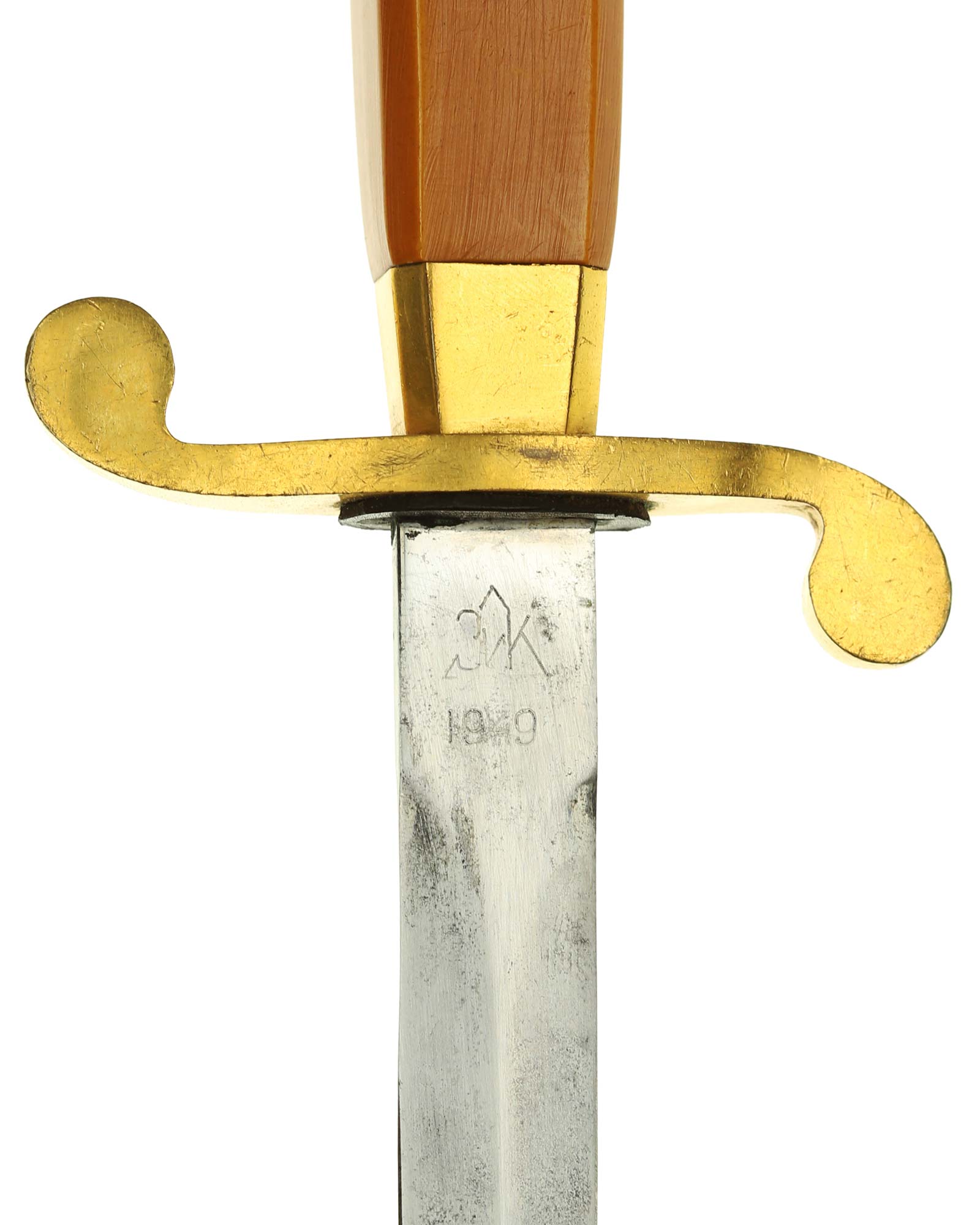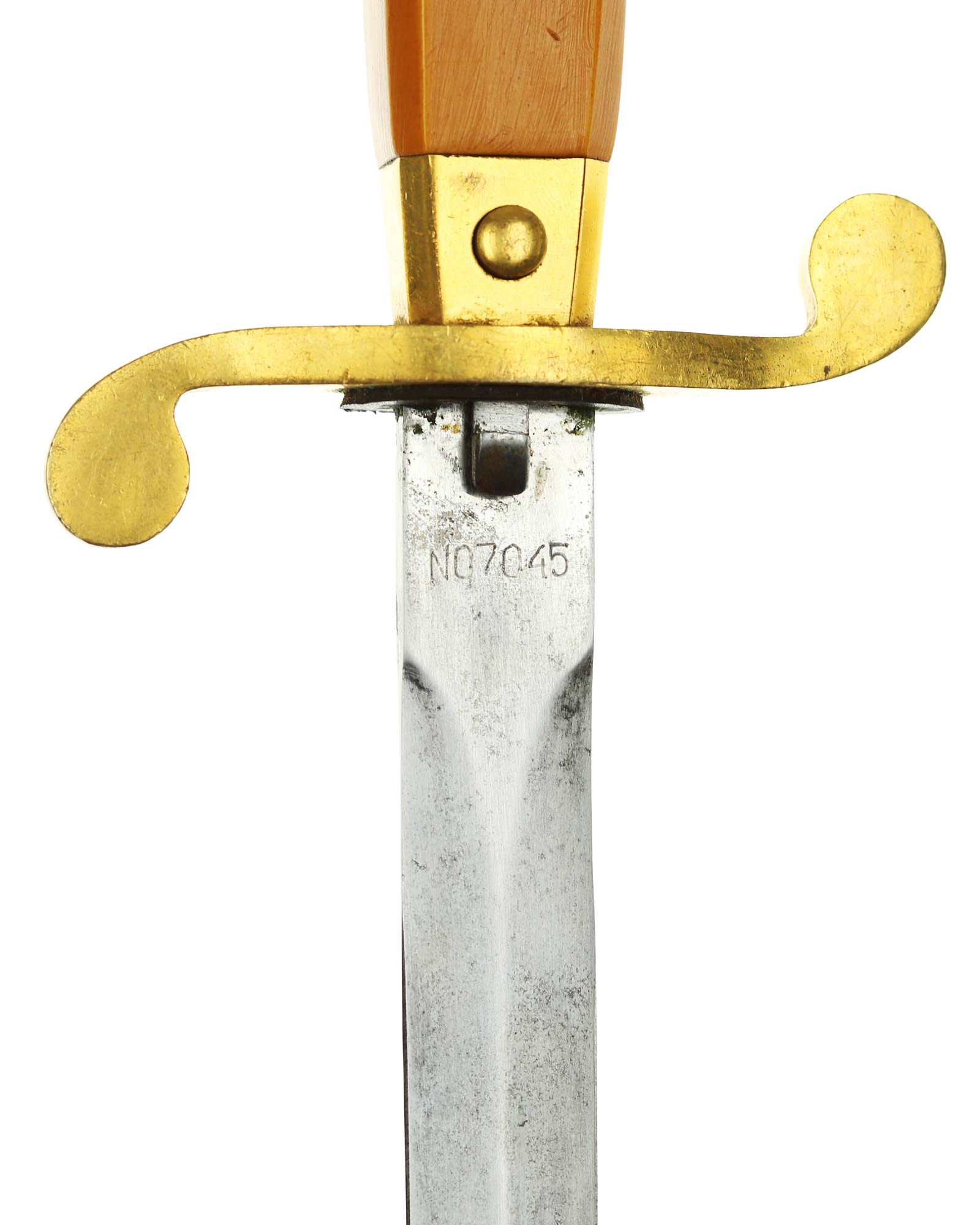 Клинок: Клинок прямой, стальной, двулезвийный, ромбического сечения, никелированный, без долов. На пяте клинка с одной стороны нанесена аббревиатура производителя и год выпуска изделия в виде надписи «ЗиК/1949», с оборотной стороны номер и серия оружия» №7045»