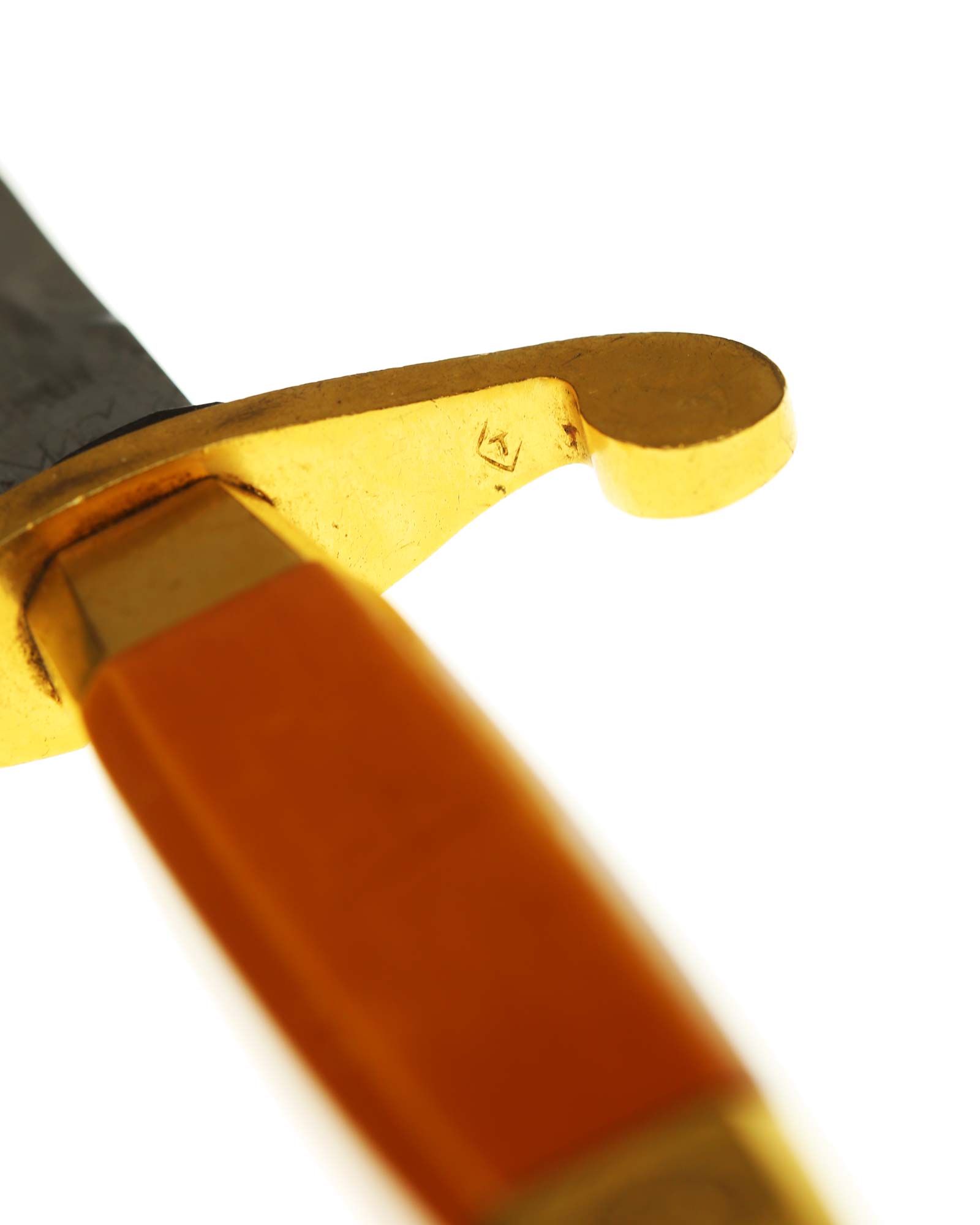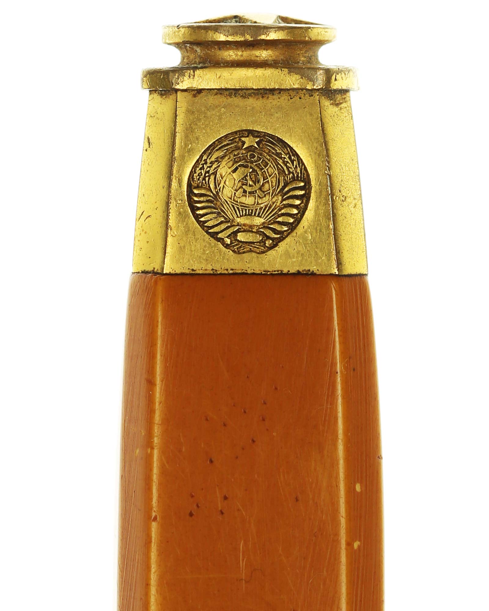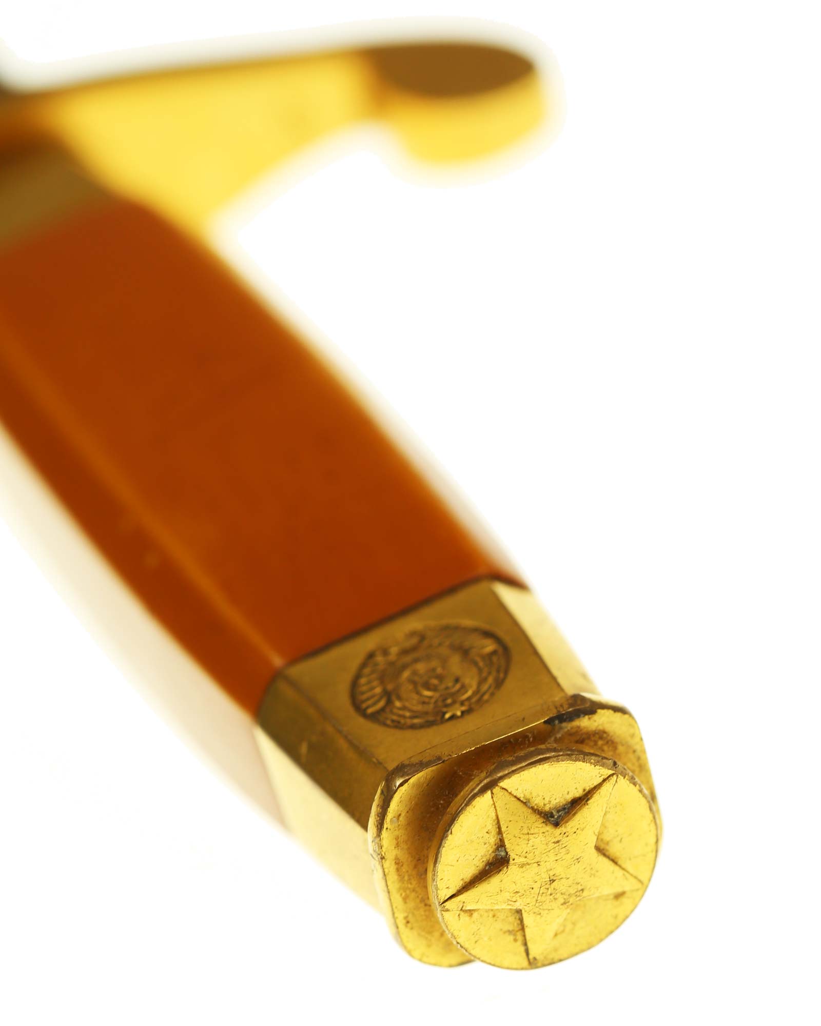 Рукоять: Рукоять выполнена из желтого пластика. Навершие рукояти латунное, винт крепления выполнен в виде шайбы с латунной пятиконечной звездой. На навершии рукояти стоит изображение советского герба. Крестовина рукояти латунная, S-образная. У основании рукояти коническая латунная втулка, в которой располагается кнопка, соединенная с двумя пружинами у пяты клинка, предназначенными для фиксации клинка в ножнах.