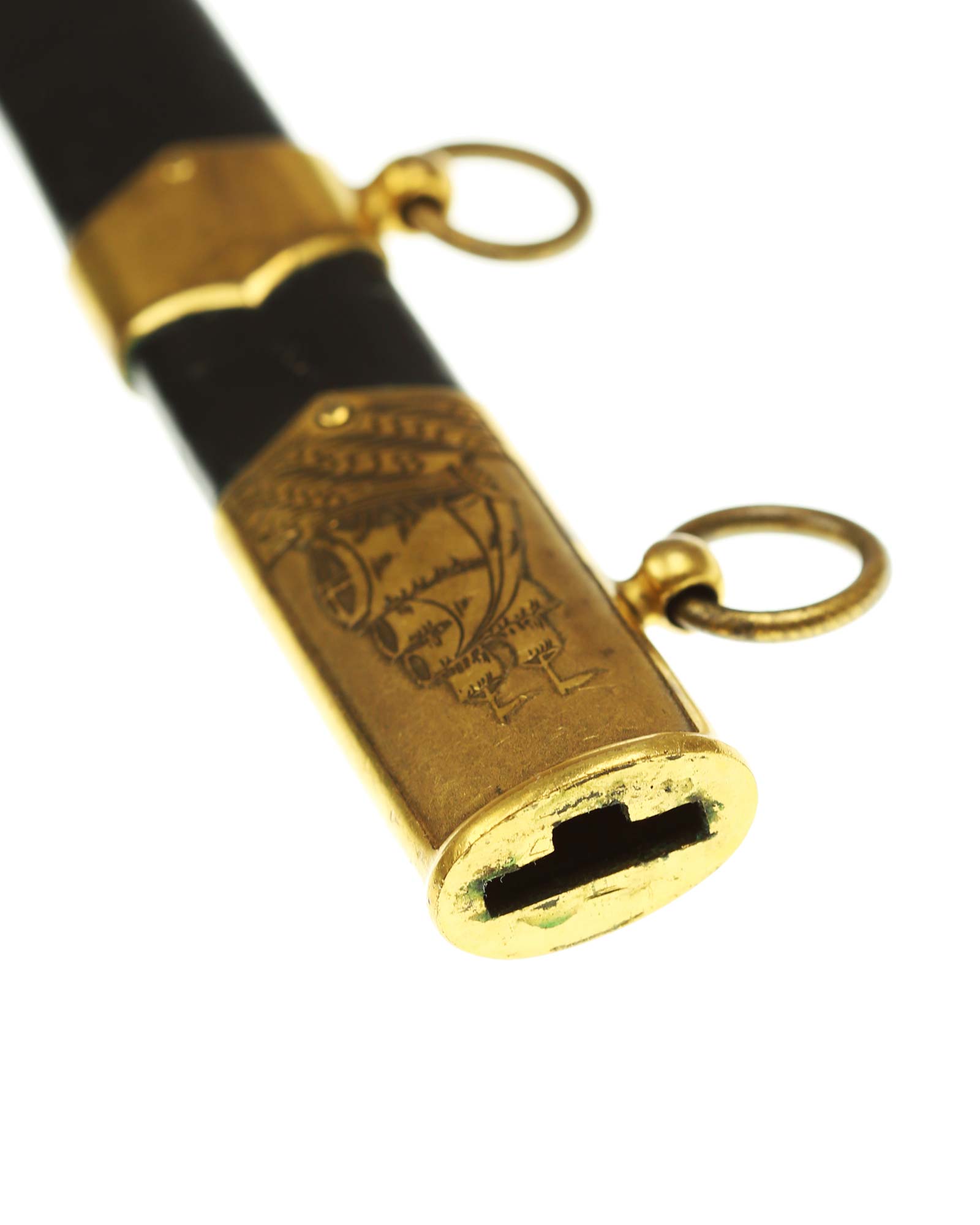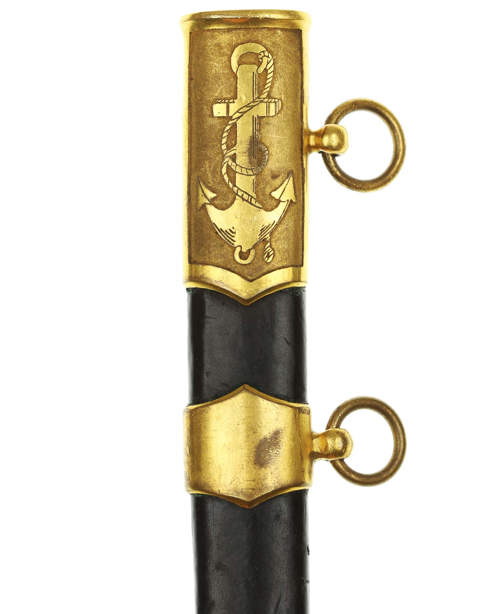Ножны: Ножны деревянные, обтянутые черной кожей. Прибор ножен латунный, позолоченный, с зубчатыми краями, состоит из устья, обоймицы и наконечника. На устье с одной стороны нанесено изображение якоря, с другой стороны парусного корабля. На устье и гайке имеются подвижные кольца для ремней портупеи. Кортик комплектуется пасовыми ремнями подвеса.