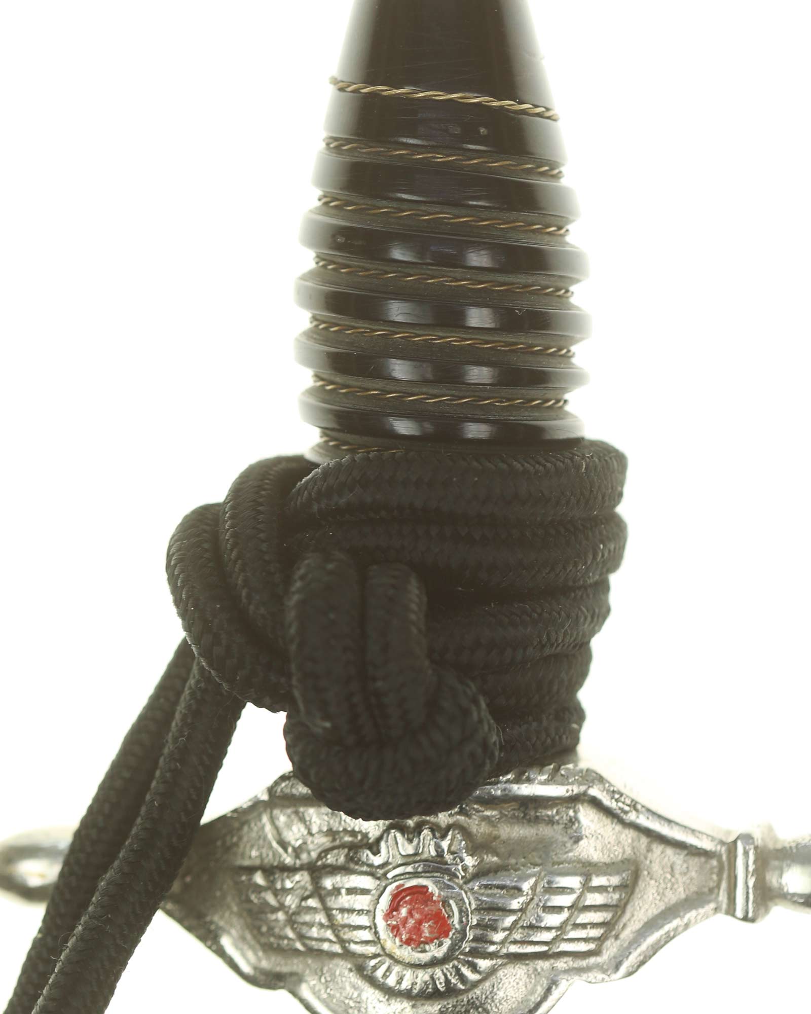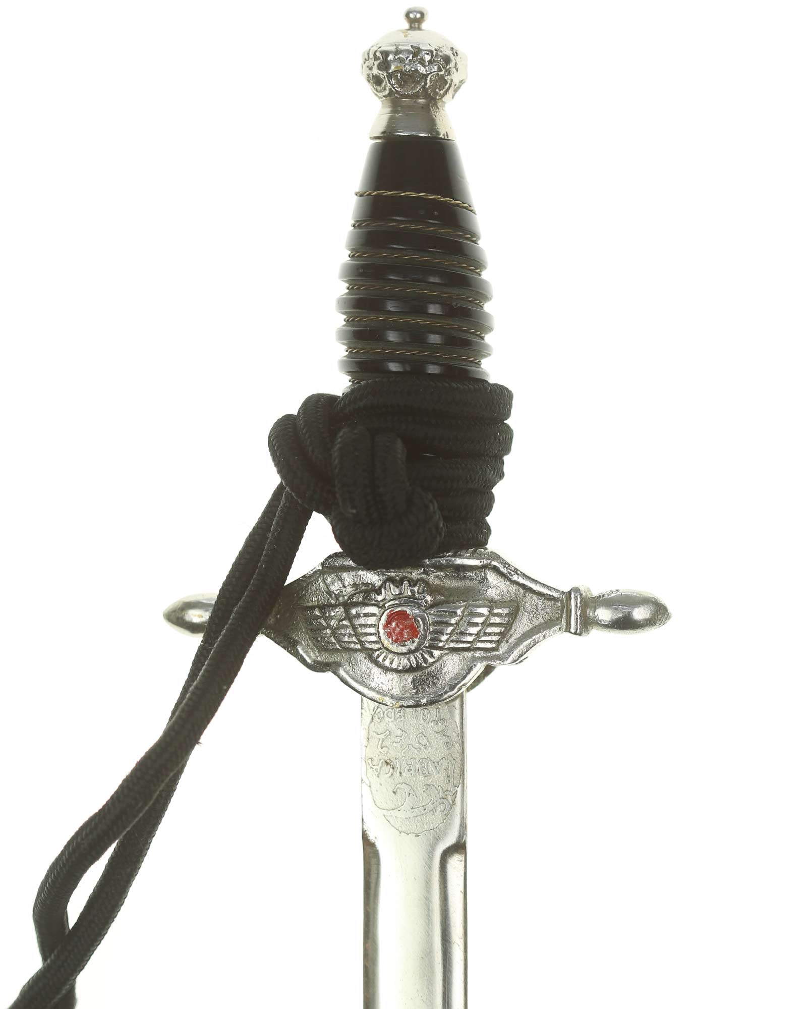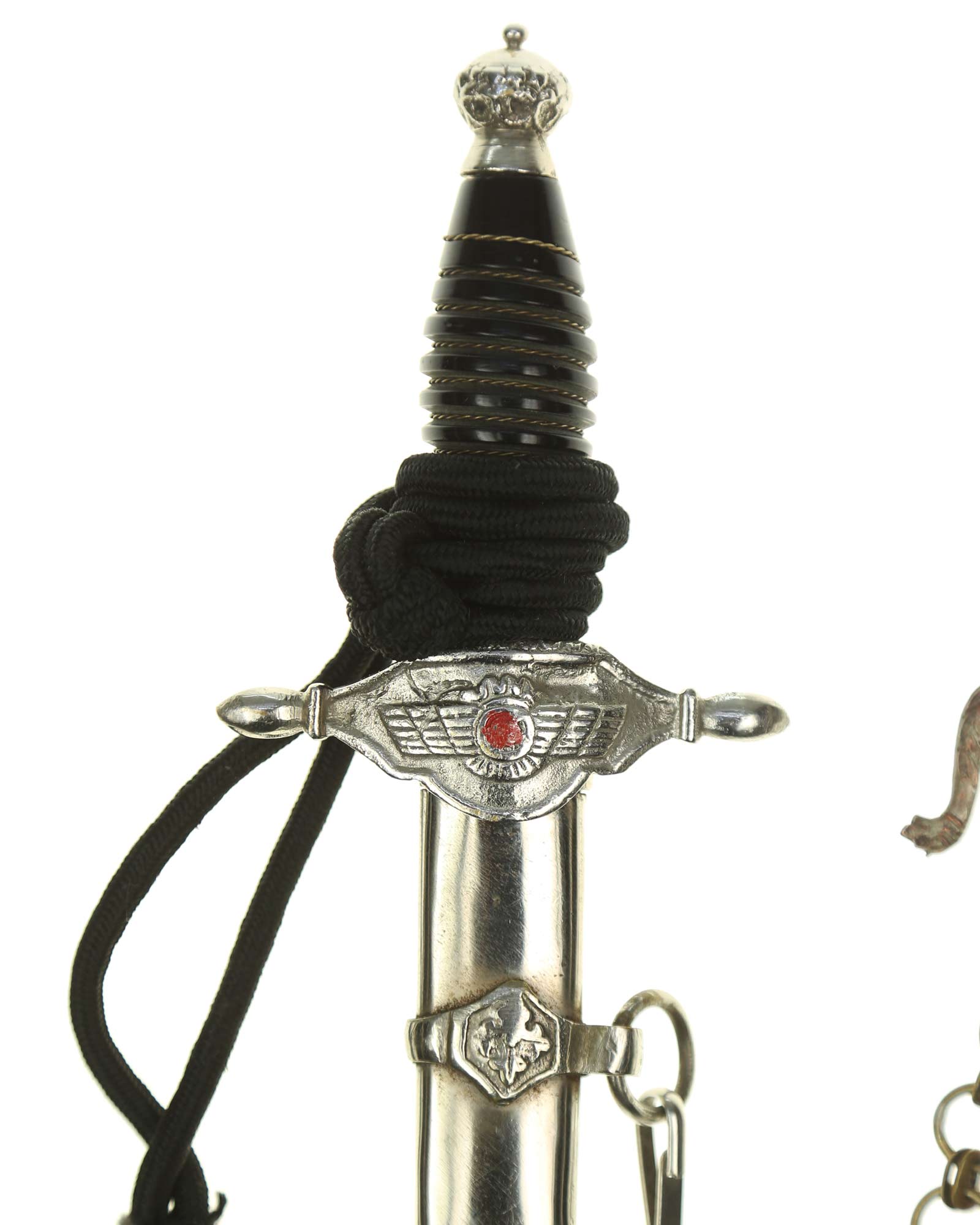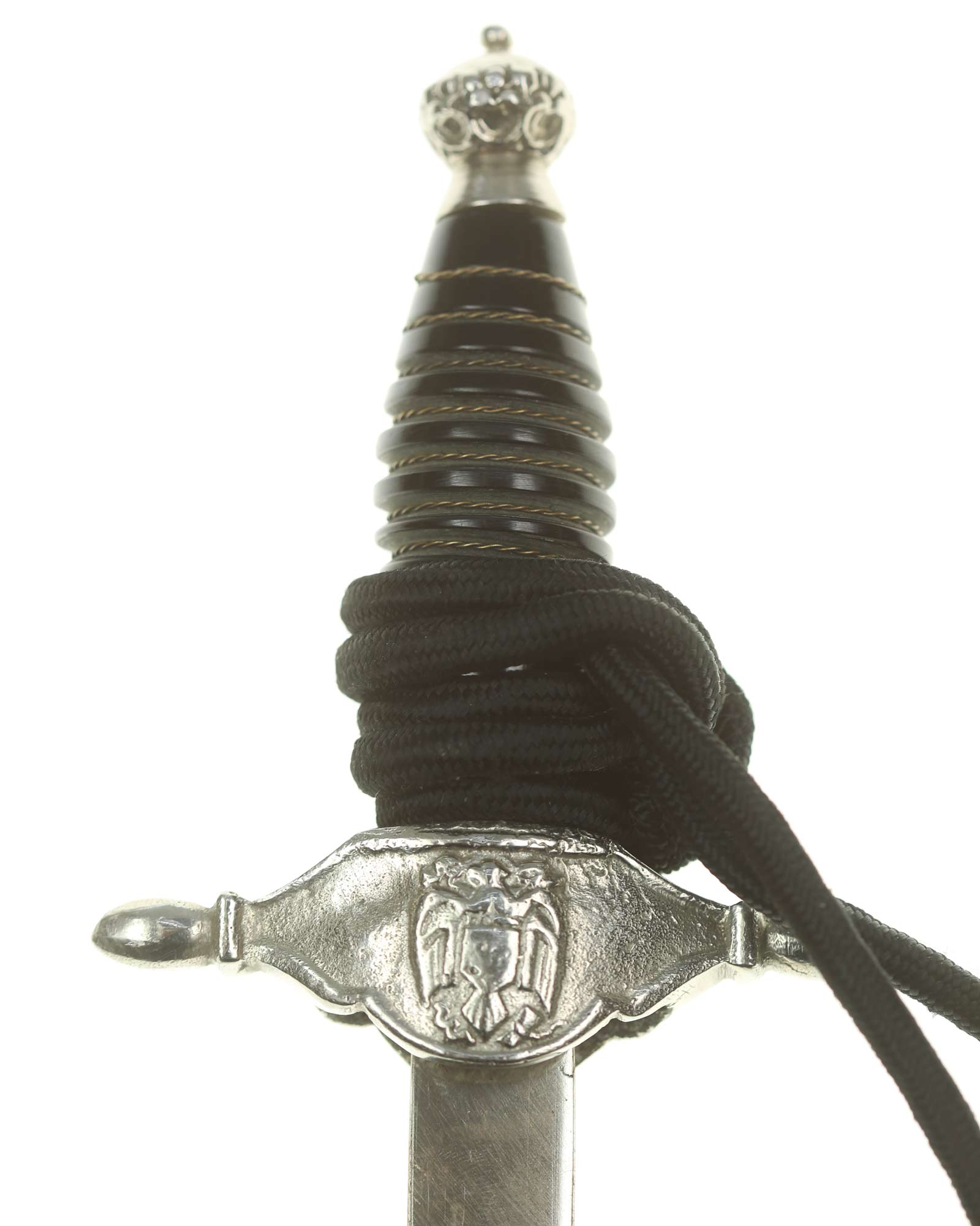 Офицерский кинжал ВВС с узлом, Испания. Рукоять из пластика с неповрежденной обмоткой. Общая длина составляет 51,2 см. Лезвие обоюдоострое с гравировкой производителя. Ножны с двумя кольцами для переноски, все внешние металлические детали из цветного металла, посеребренные.