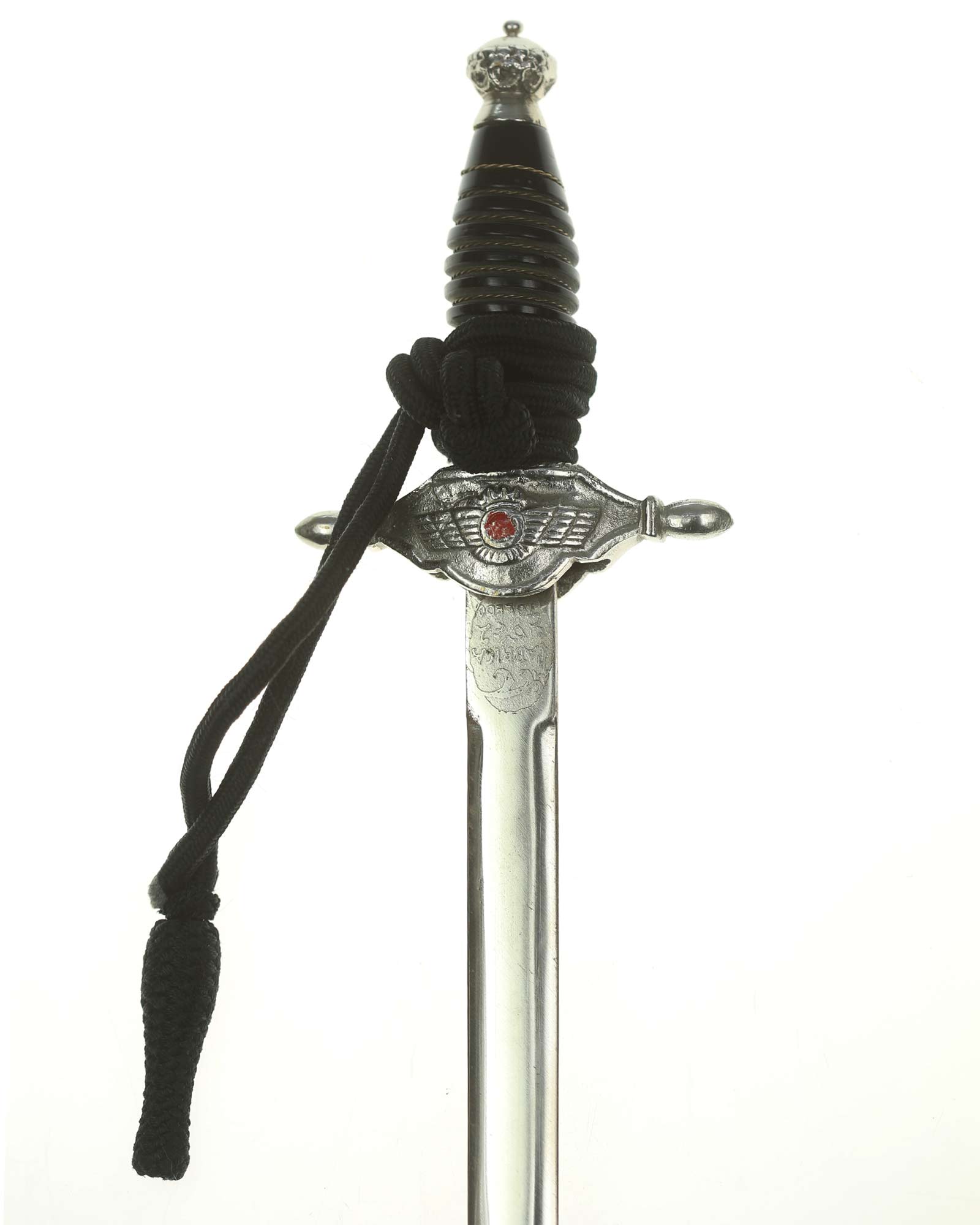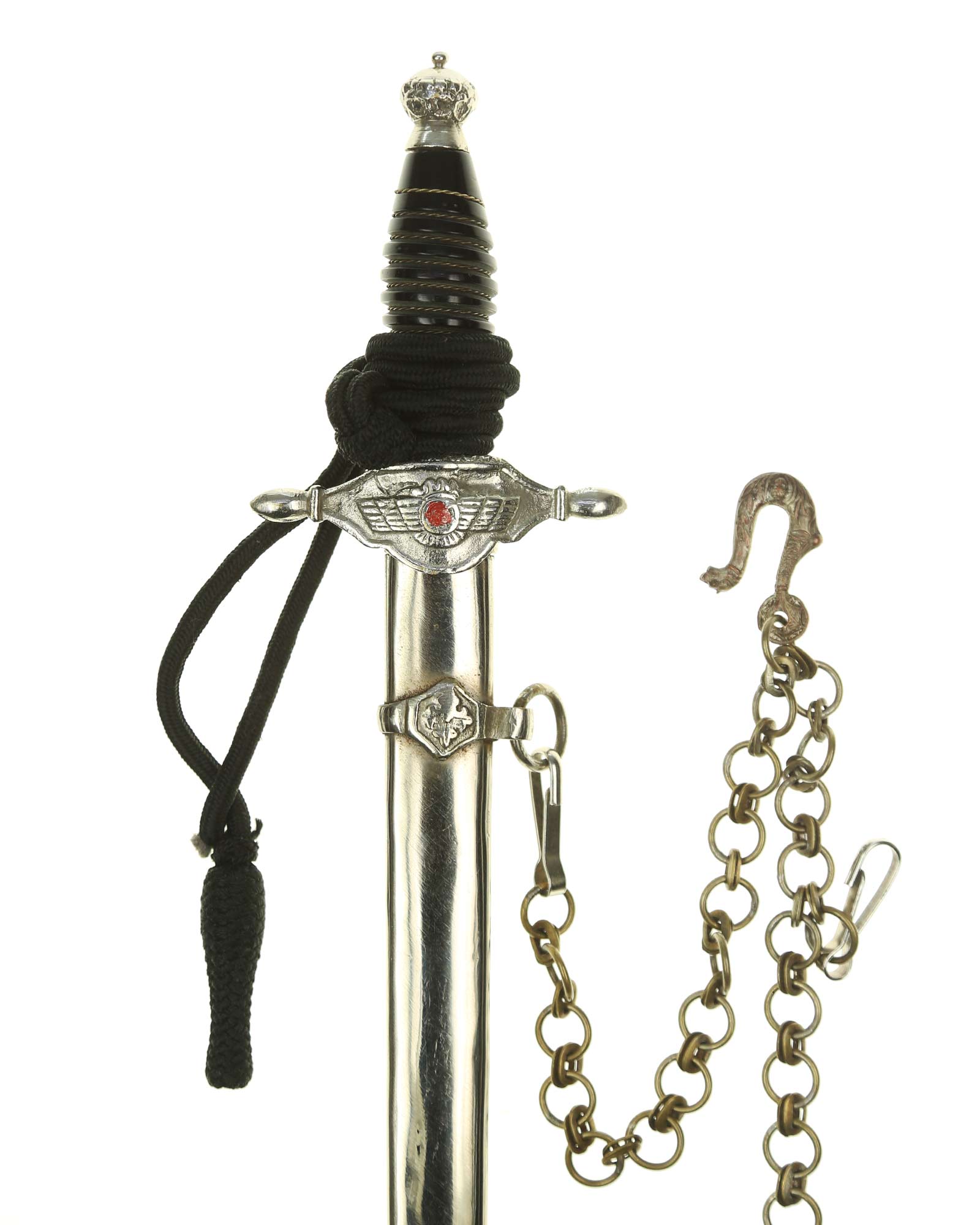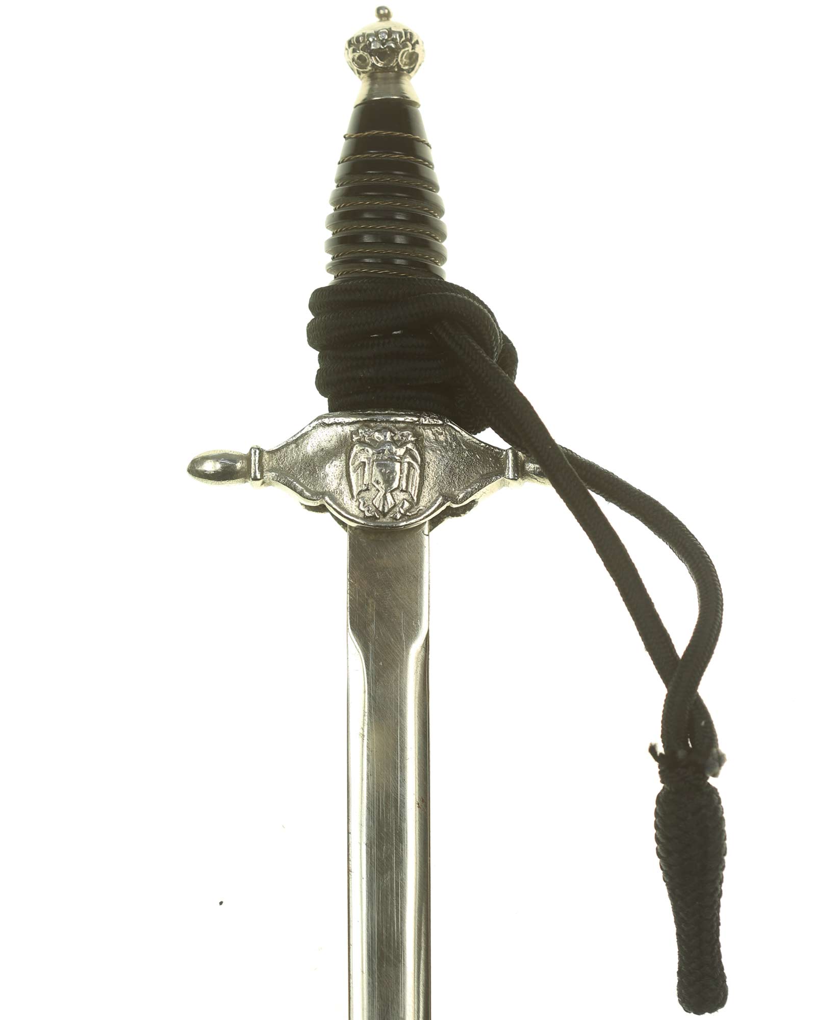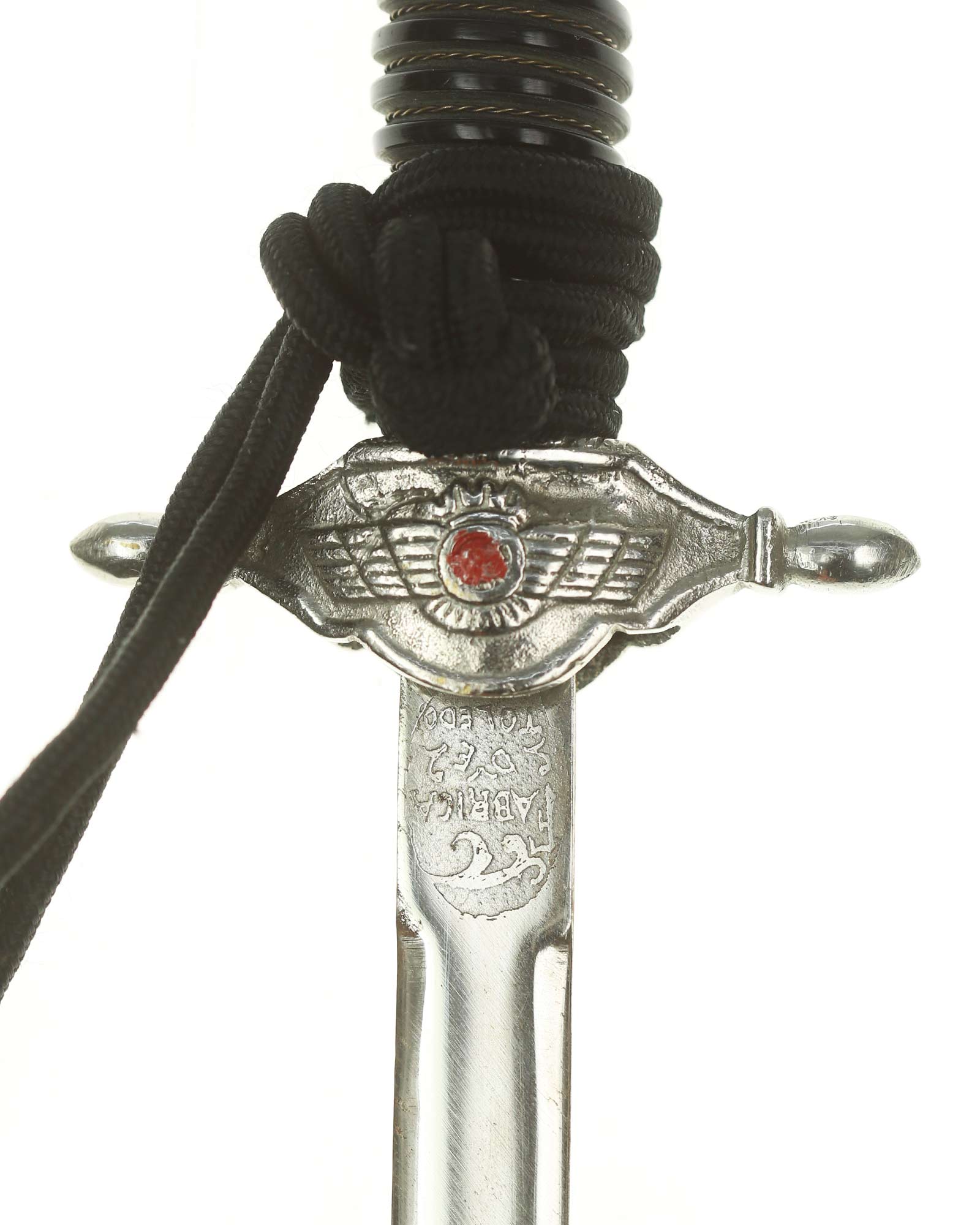 Офицерский кинжал ВВС с узлом, Испания. Рукоять из пластика с неповрежденной обмоткой. Общая длина составляет 51,2 см. Лезвие обоюдоострое с гравировкой производителя. Ножны с двумя кольцами для переноски, все внешние металлические детали из цветного металла, посеребренные.