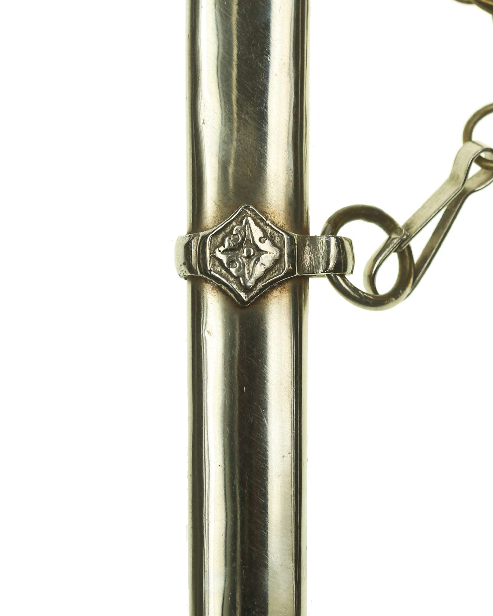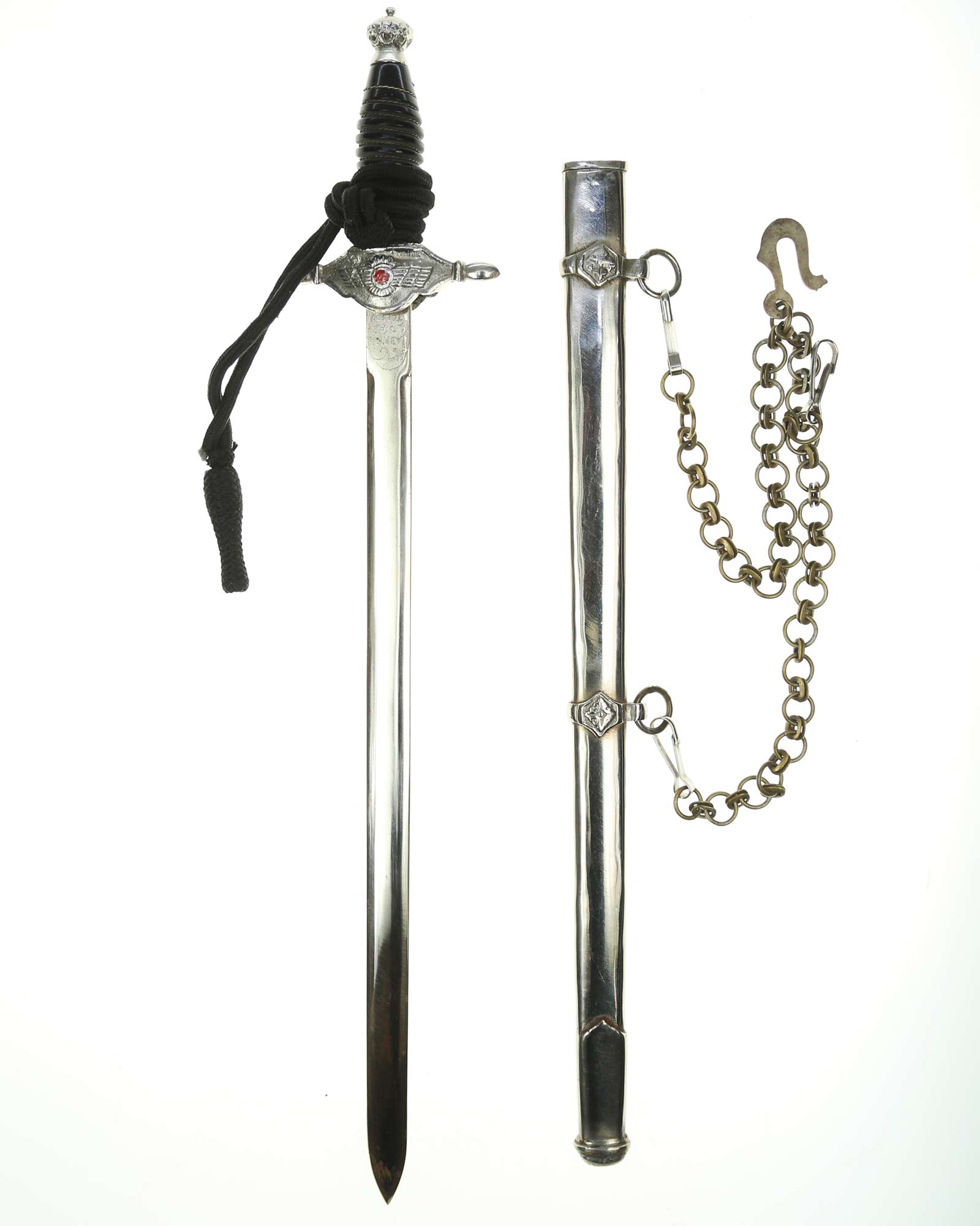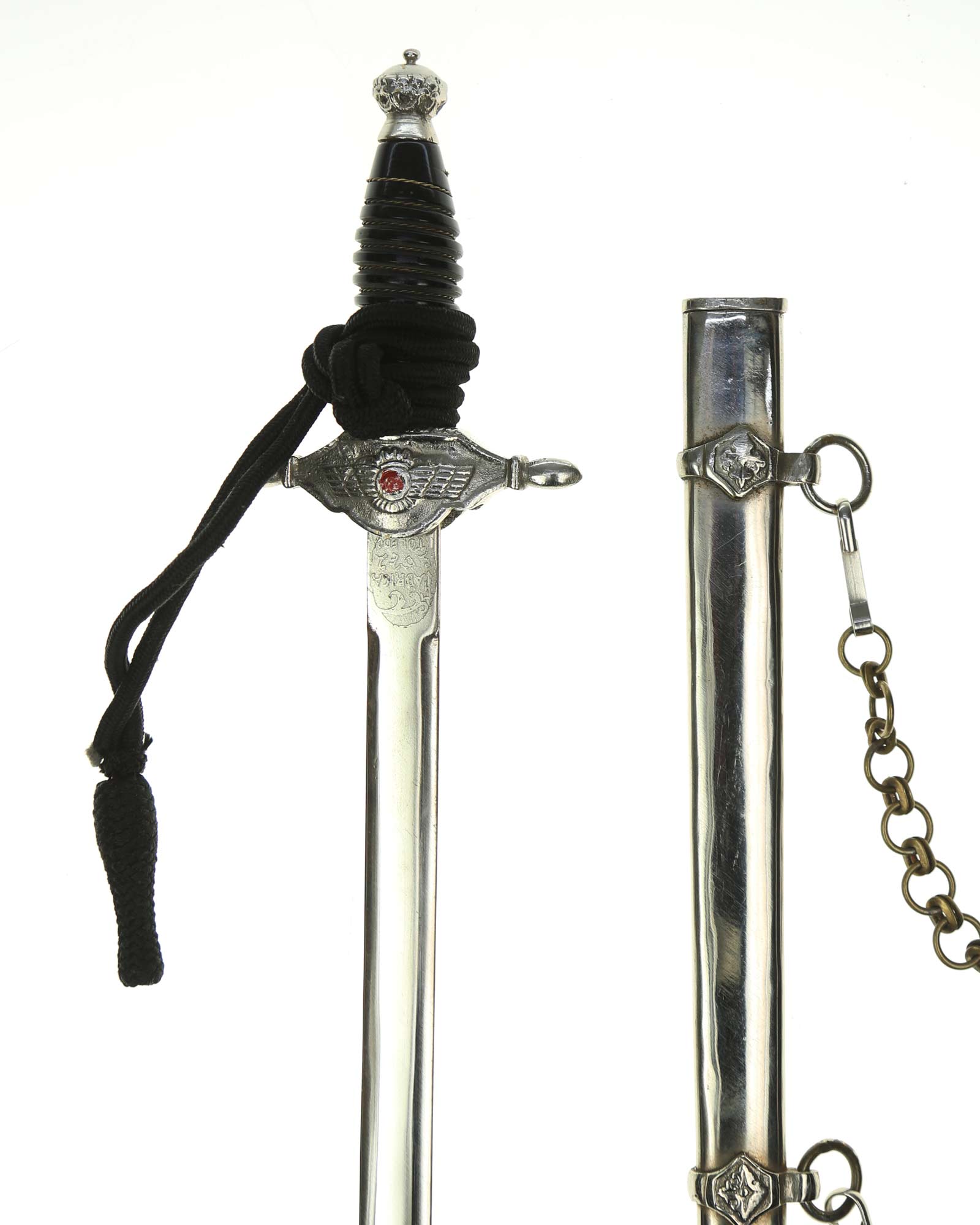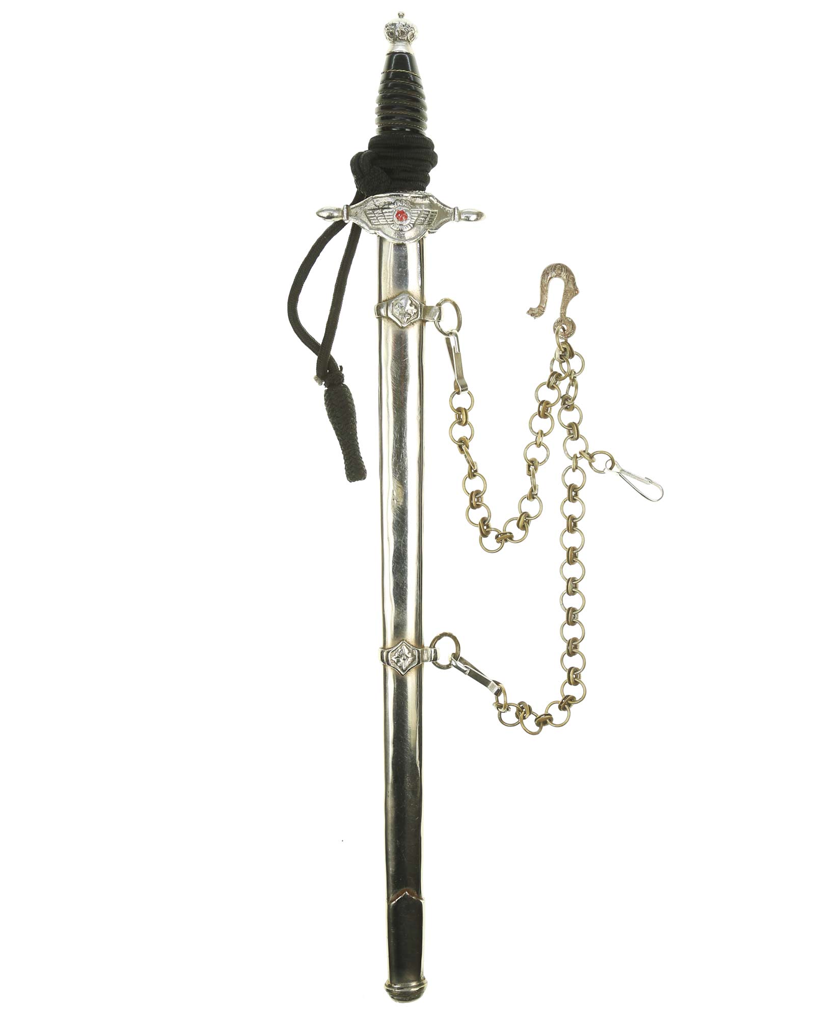 Офицерский кинжал ВВС с узлом, Испания. Рукоять из пластика с неповрежденной обмоткой. Общая длина составляет 51,2 см. Лезвие обоюдоострое с гравировкой производителя. Ножны с двумя кольцами для переноски, все внешние металлические детали из цветного металла, посеребренные.
