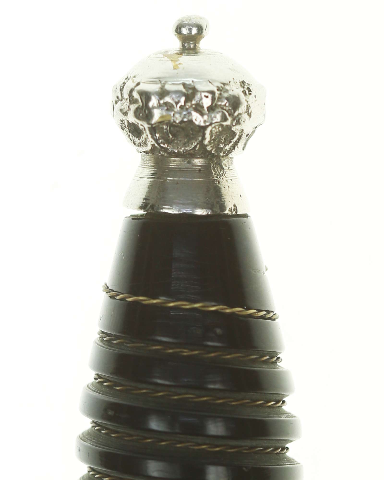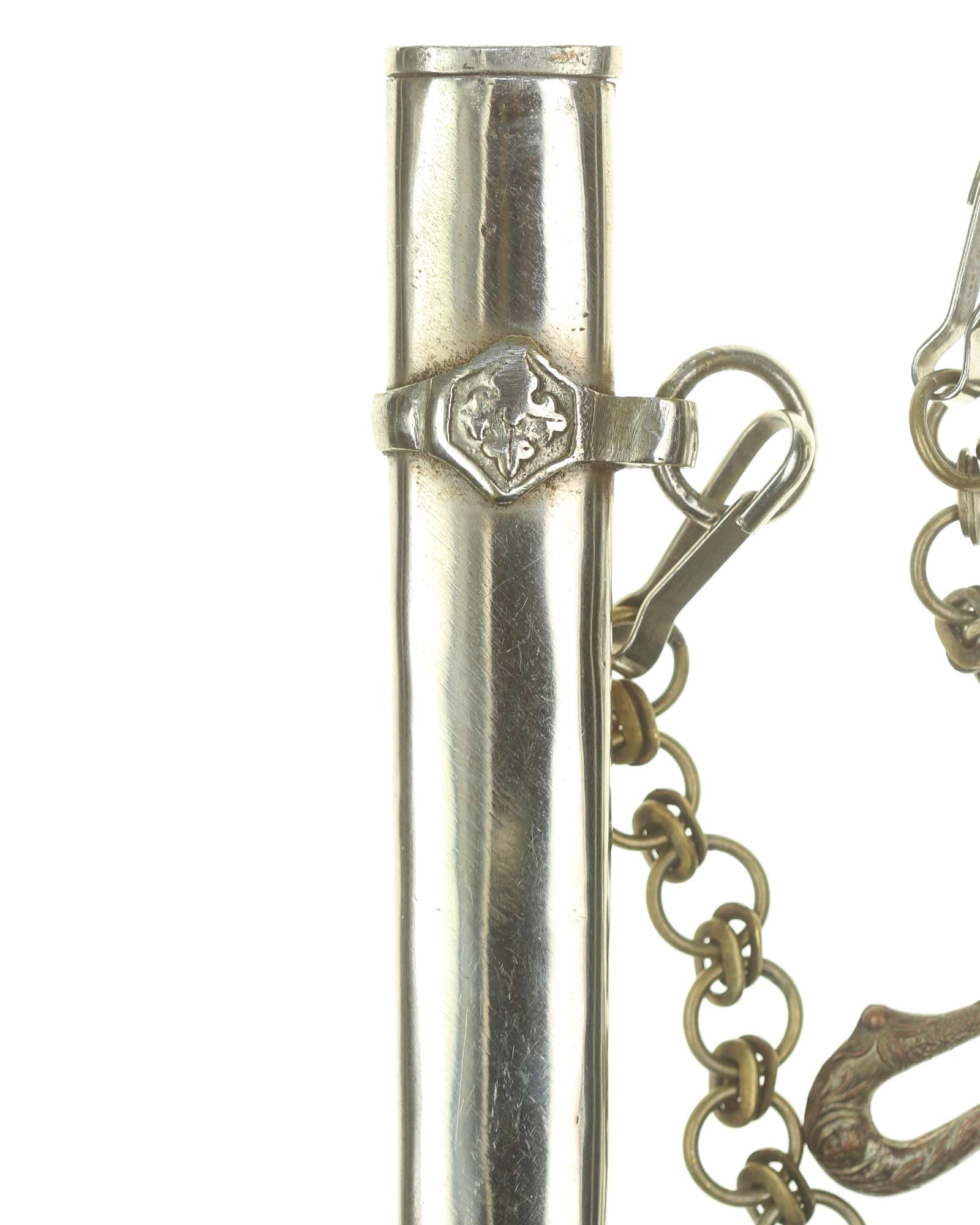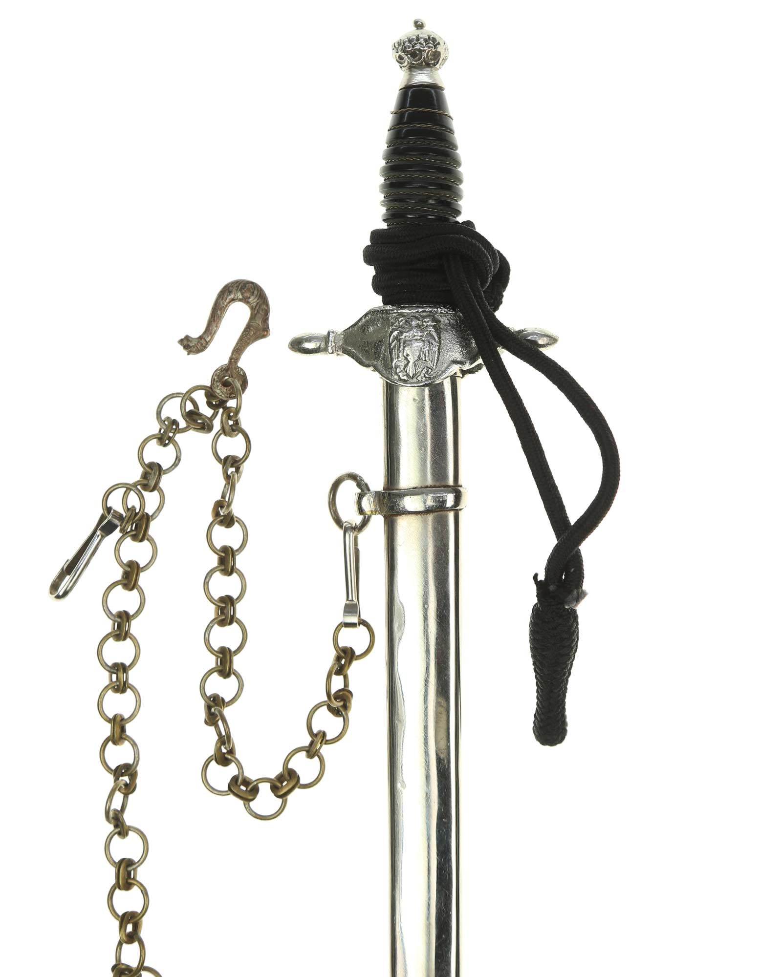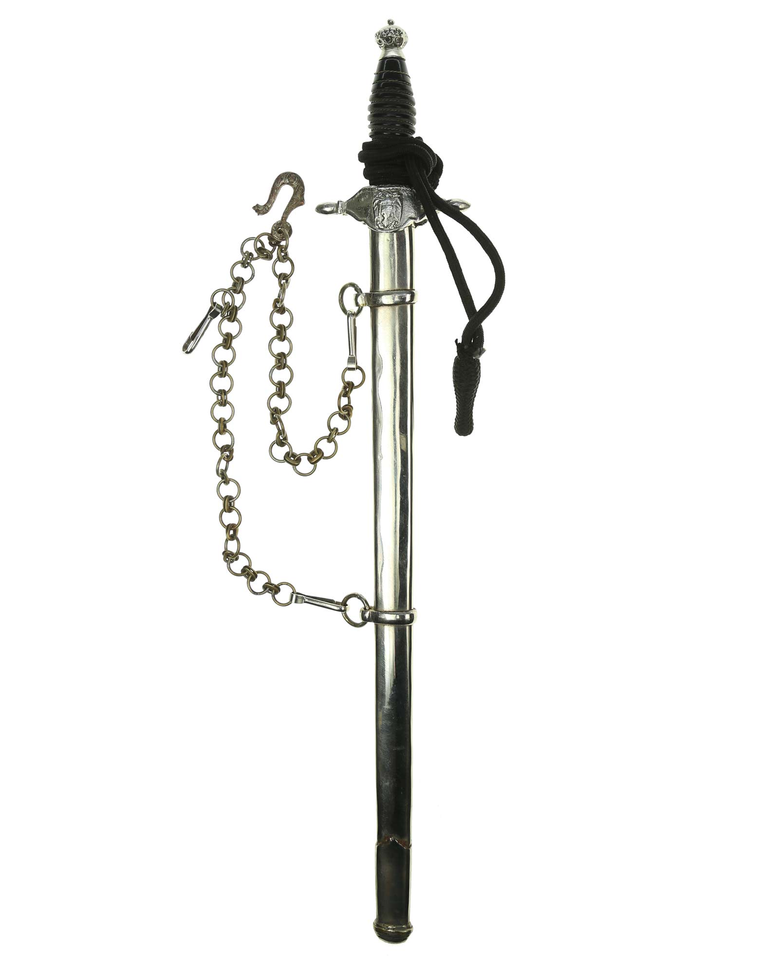 Офицерский кинжал ВВС с узлом, Испания. Рукоять из пластика с неповрежденной обмоткой. Общая длина составляет 51,2 см. Лезвие обоюдоострое с гравировкой производителя. Ножны с двумя кольцами для переноски, все внешние металлические детали из цветного металла, посеребренные.