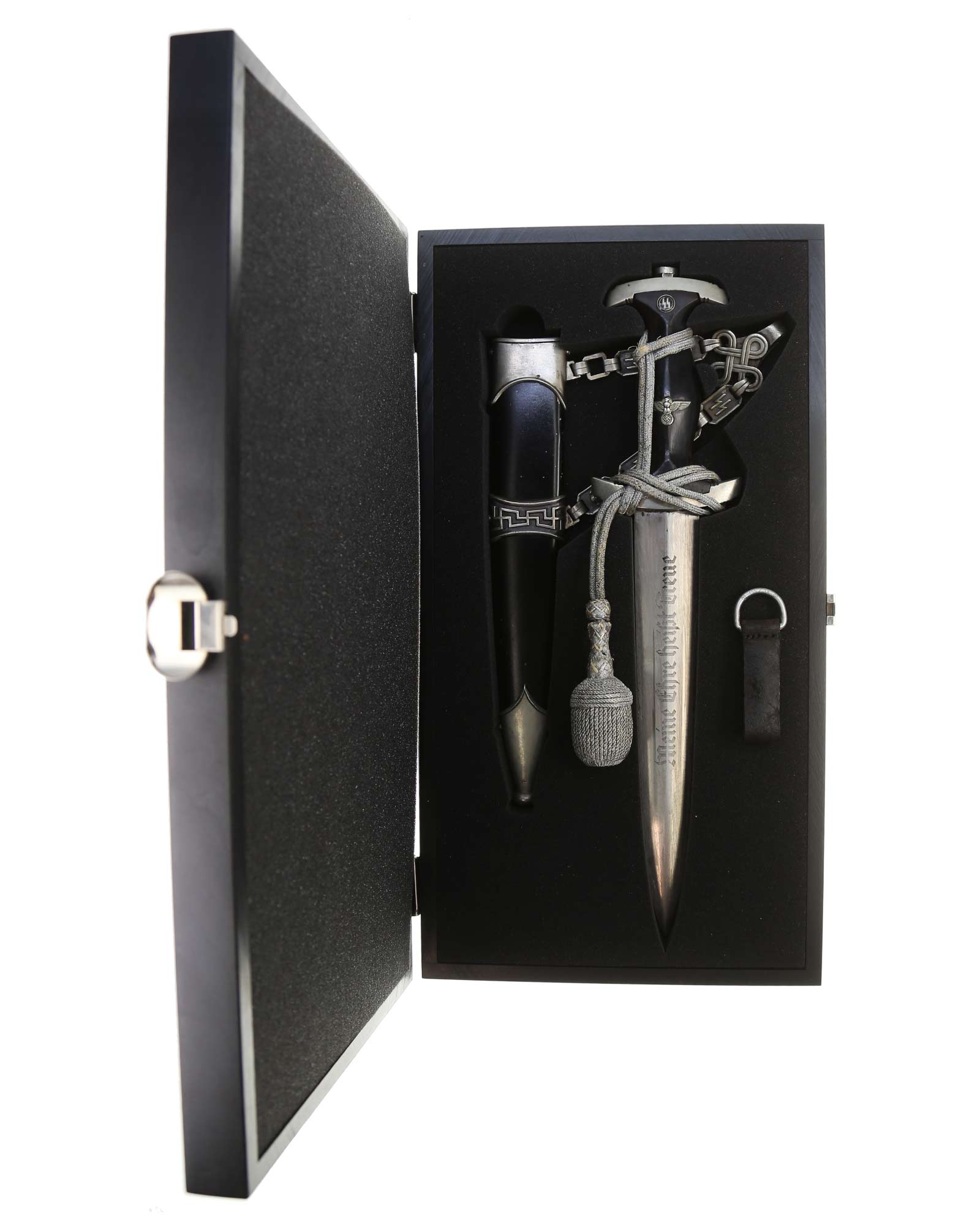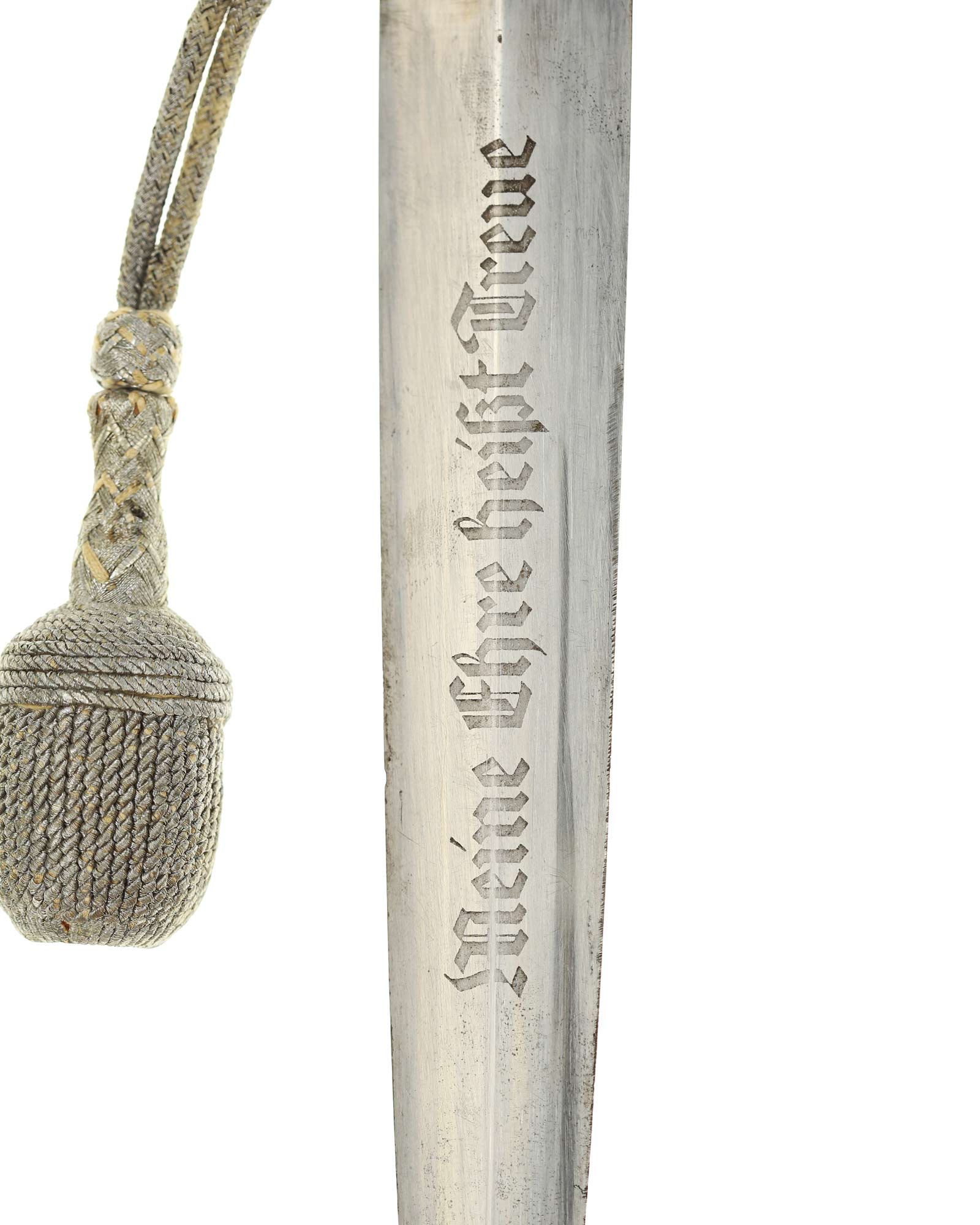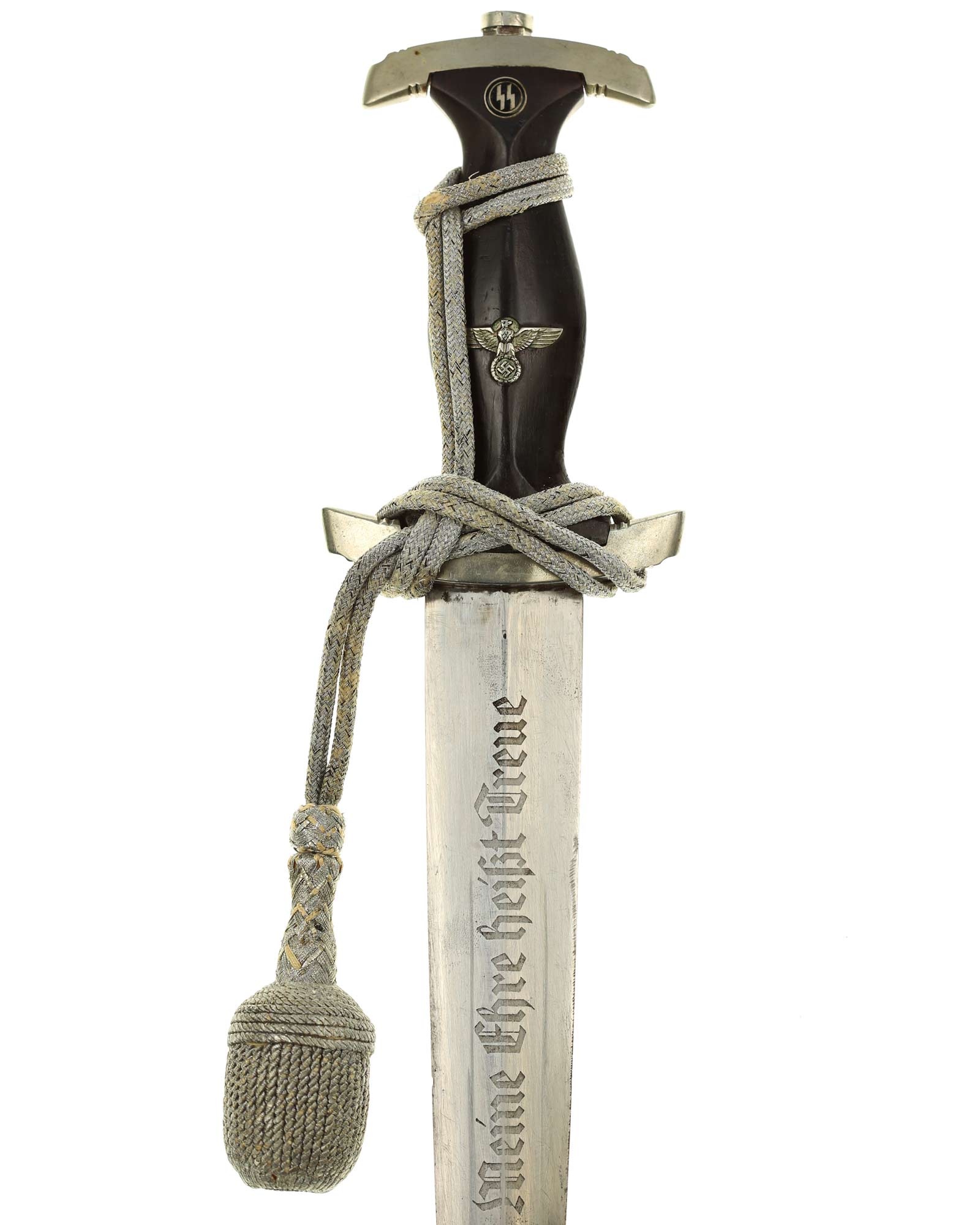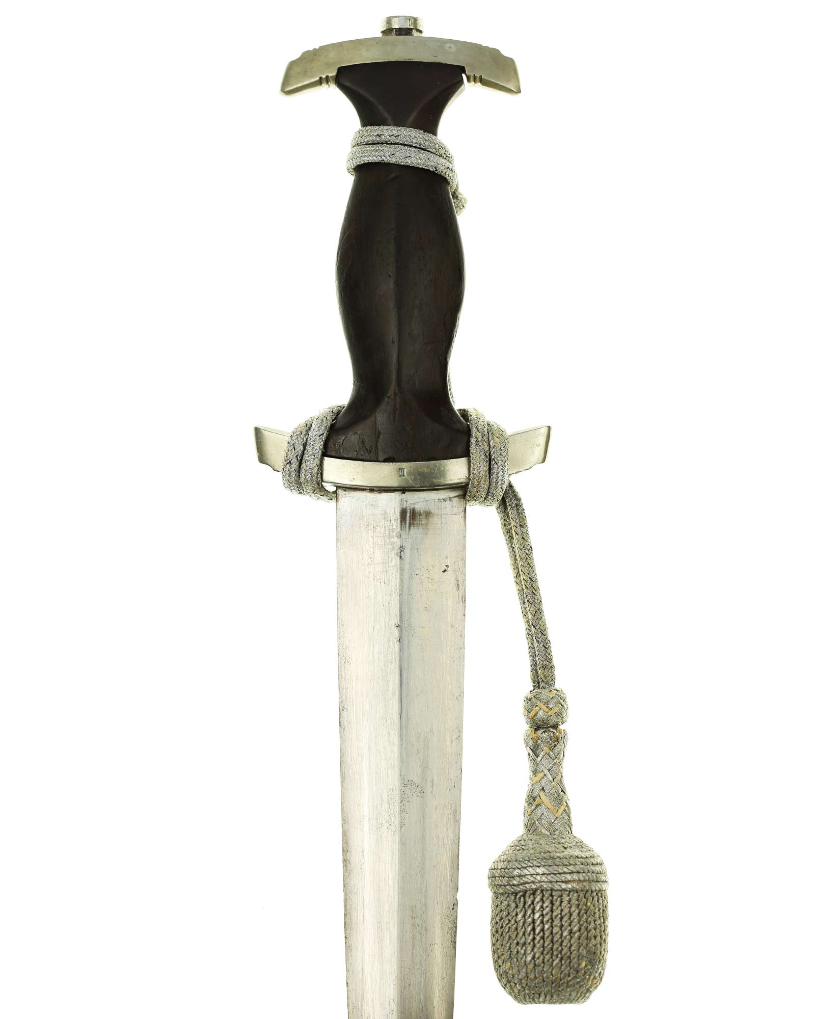 Клинок: Клинок кинжала прямой, стальной, двулезвийный, кинжального типа, с выраженным центральным ребром. На одной стороне клинка методом травления нанесен девиз СС «Meine Ehre heisst Treue» (Моя честь называется верностью). Клинок, как и положено без клейма производителя - только на кинжалах этого типа клеймо производителя не ставилось для конфиденциальности владельца.