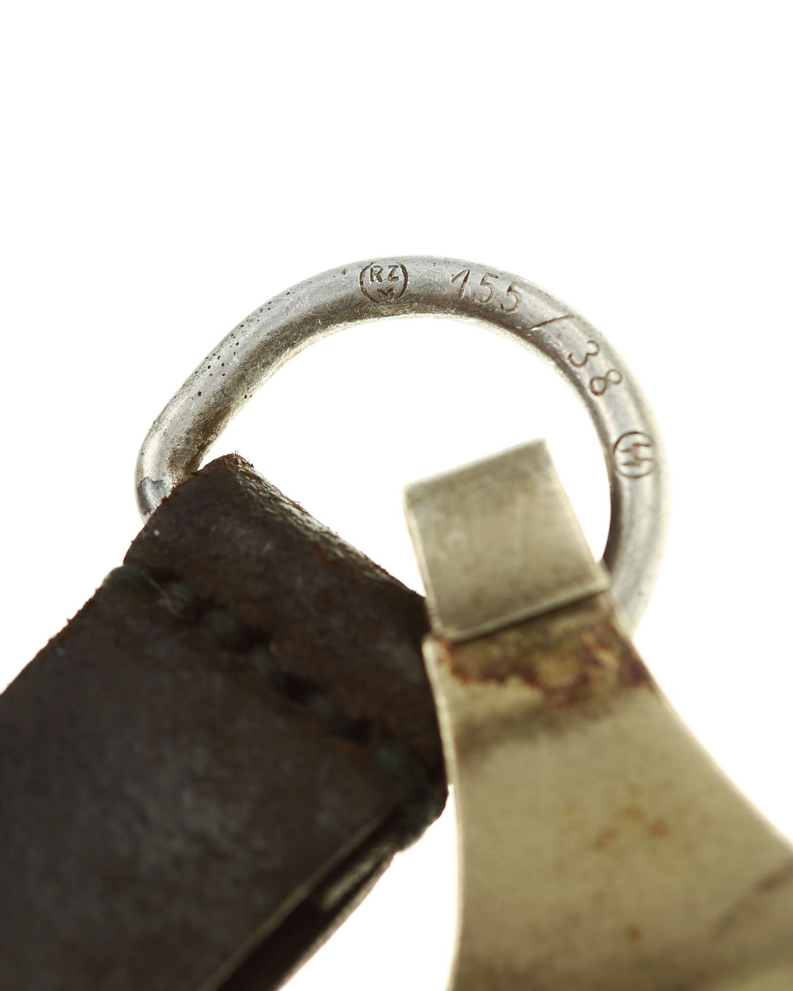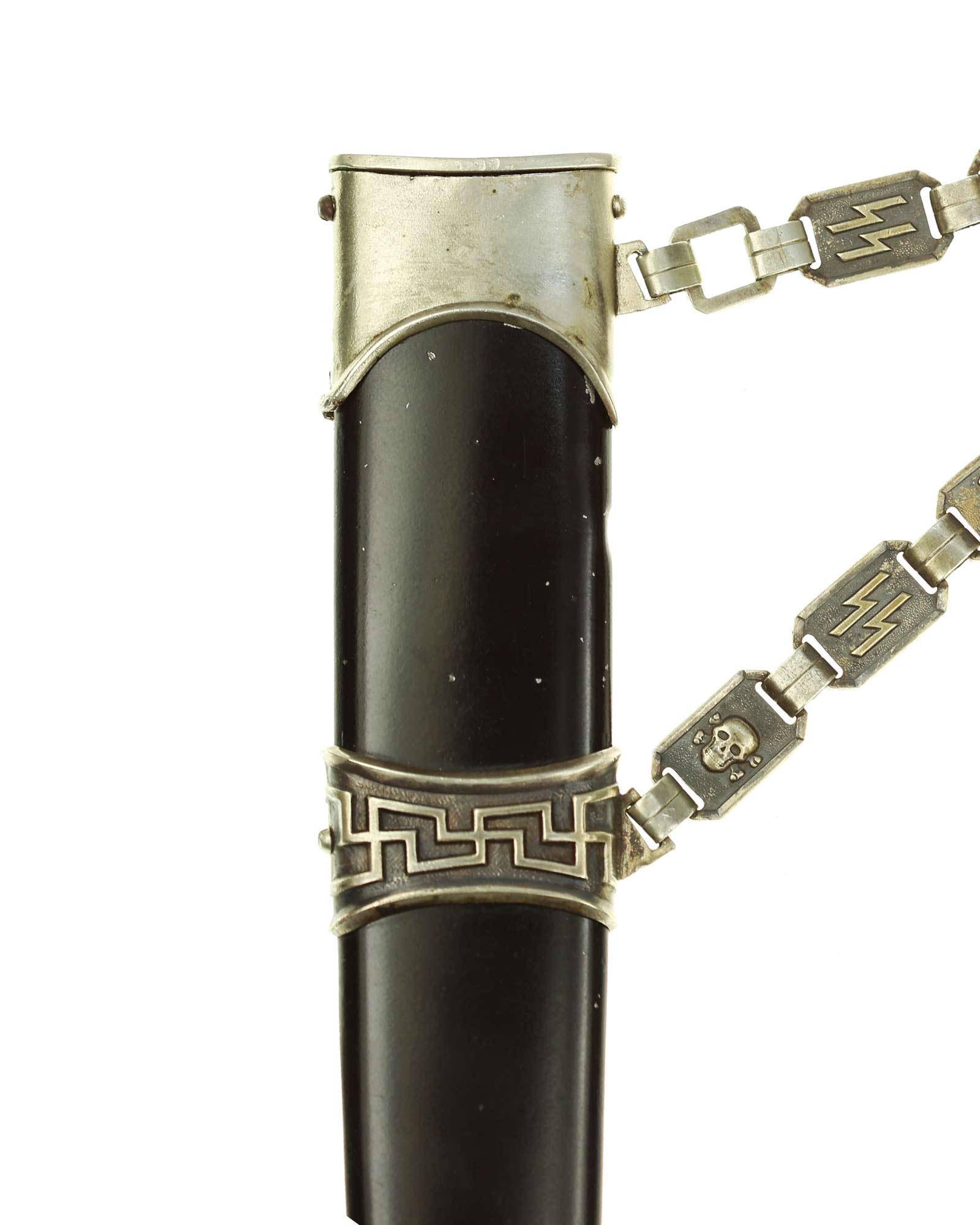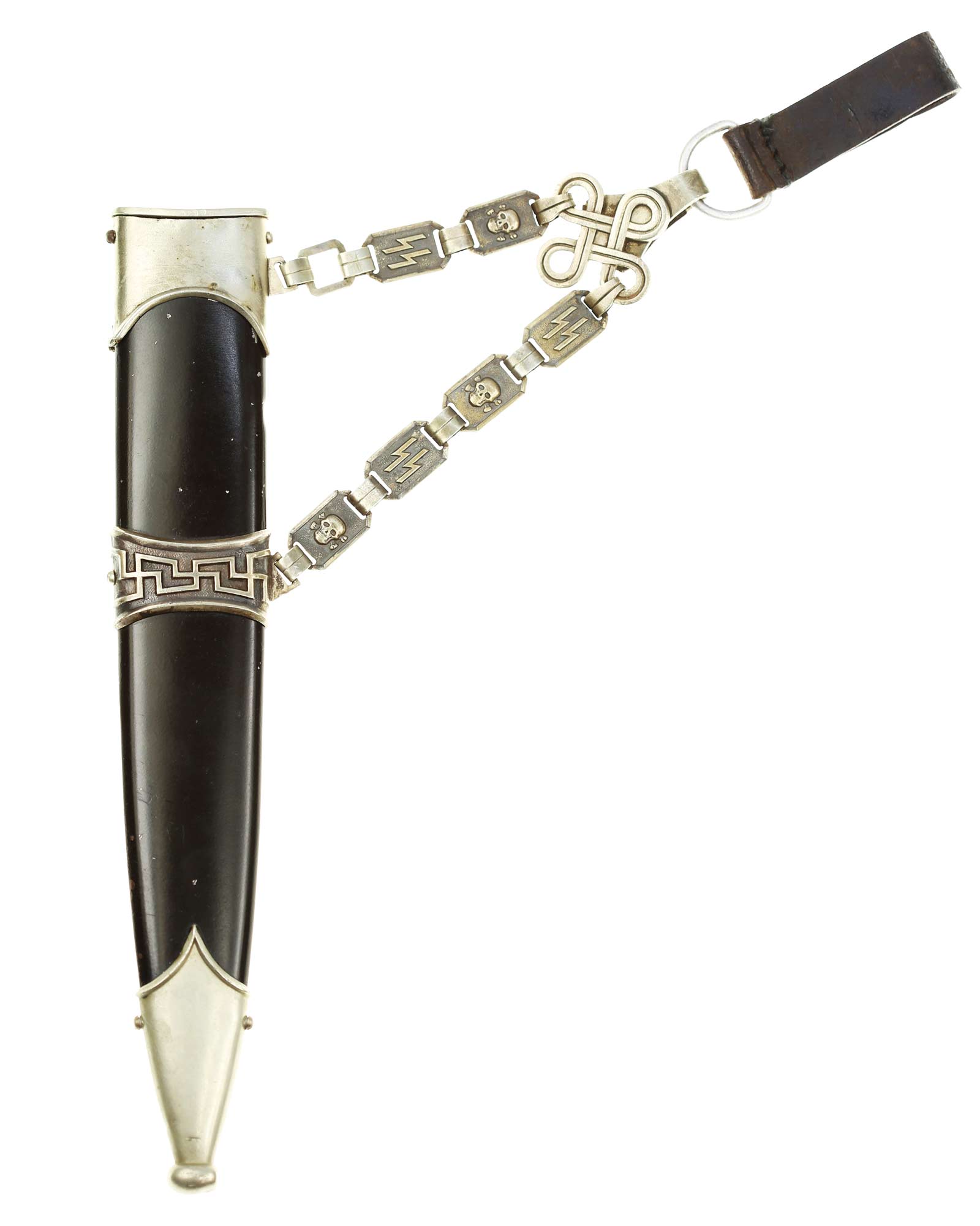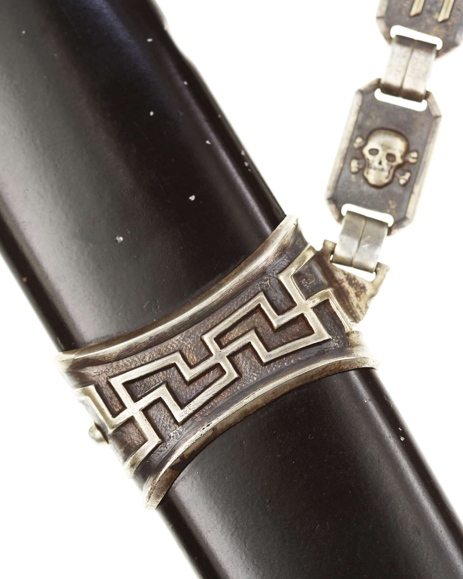 Ножны: Ножны металлические в оригинальном черном аннодировании. Прибор ножен состоит из устья и гайки с креплением для подвеса и наконечника с шариком. Сохранился оригинальный цепной подвес с символикой из черепов и символов SS. На оборотной стороне одного из звеньев стоит клеймо приемки Waffen-SS из двух переплетающихся молний. Детализация цепи типа-B1: Фоновая поверхность звеньев ссимволами без чернения. Сужающиеся верхние соединительные элементы подогнаны друг к другу. СС-штамп глубоко нанесен машинным способом с обратной стороны звена с символом. Соединительные элементы относительно плоские. Переходы узла Вотана часто крупнее окружающей рельефной полосы. Центральное и верхнее отверстия узла закрыты. Цепь покрыта красивой равномерной патиной.