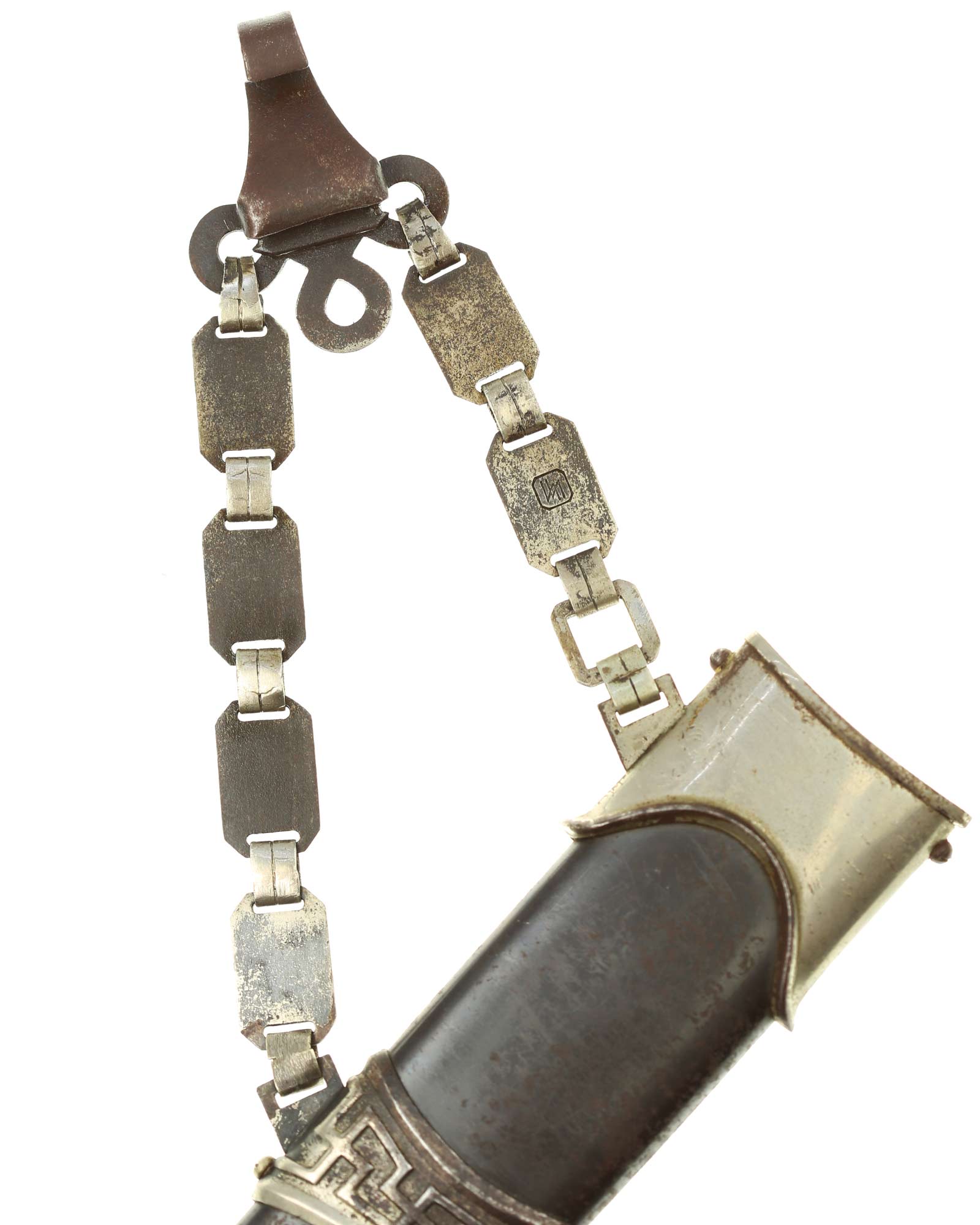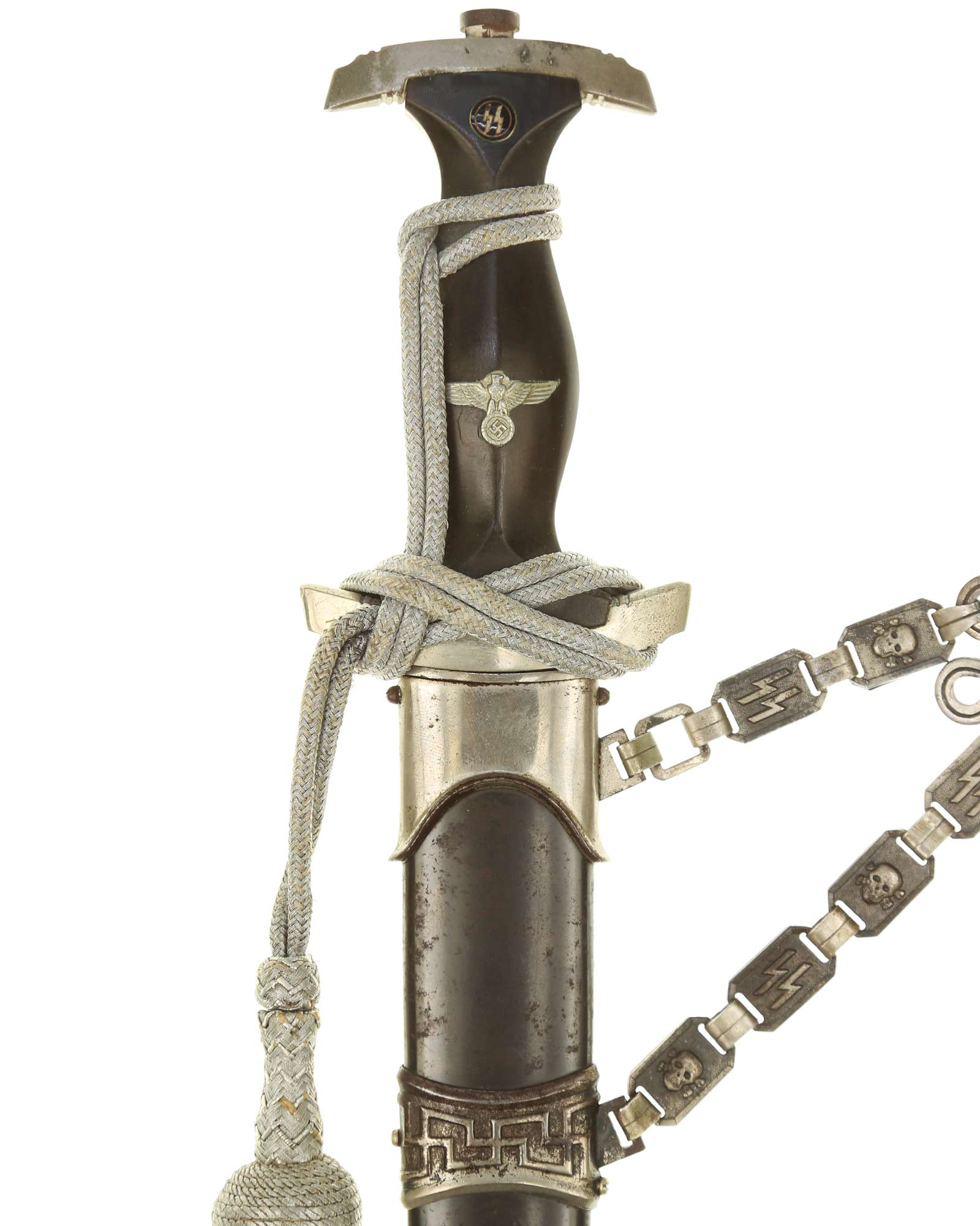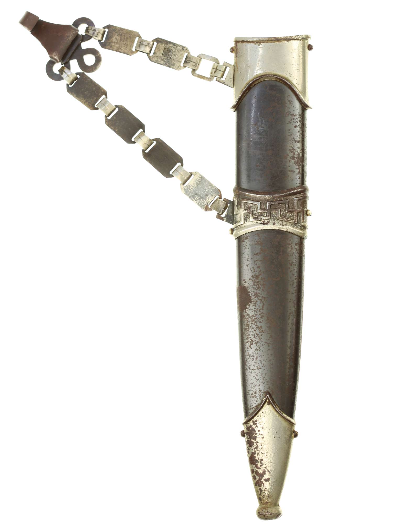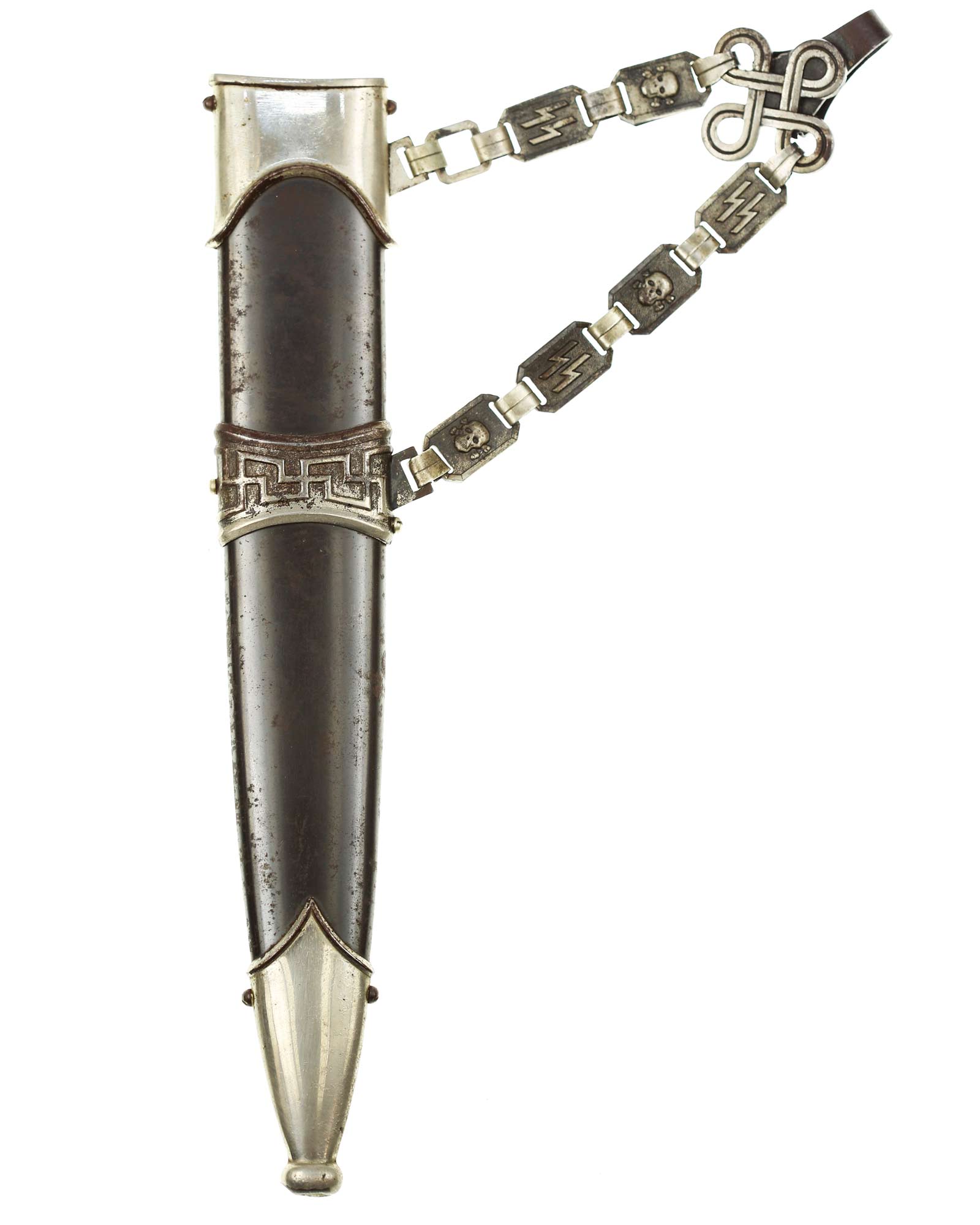 Ножны: Ножны металлические в оригинальном черном аннодировании. Прибор ножен состоит из устья и гайки с креплением для подвеса и наконечника с шариком. Сохранился оригинальный цепной подвес с символикой из черепов и символов SS. На оборотной стороне одного из звеньев стоит клеймо приемки Waffen-SS из двух переплетающихся молний. Детализация цепи типа-B2: Фоновая поверхность звеньев ссимволами без чернения. Сужающиеся верхние соединительные элементы подогнаны друг к другу. СС-штамп глубоко нанесен машинным способом с обратной стороны звена с символом. Соединительные элементы относительно плоские. Переходы узла Вотана часто крупнее окружающей рельефной полосы. Центральное и верхнее отверстия узла закрыты. Цепь покрыта красивой равномерной патиной.