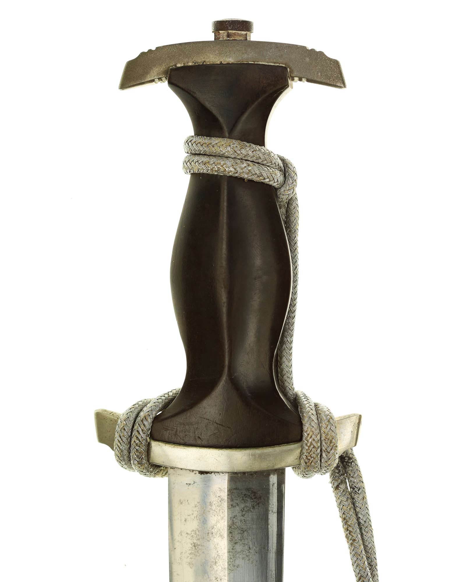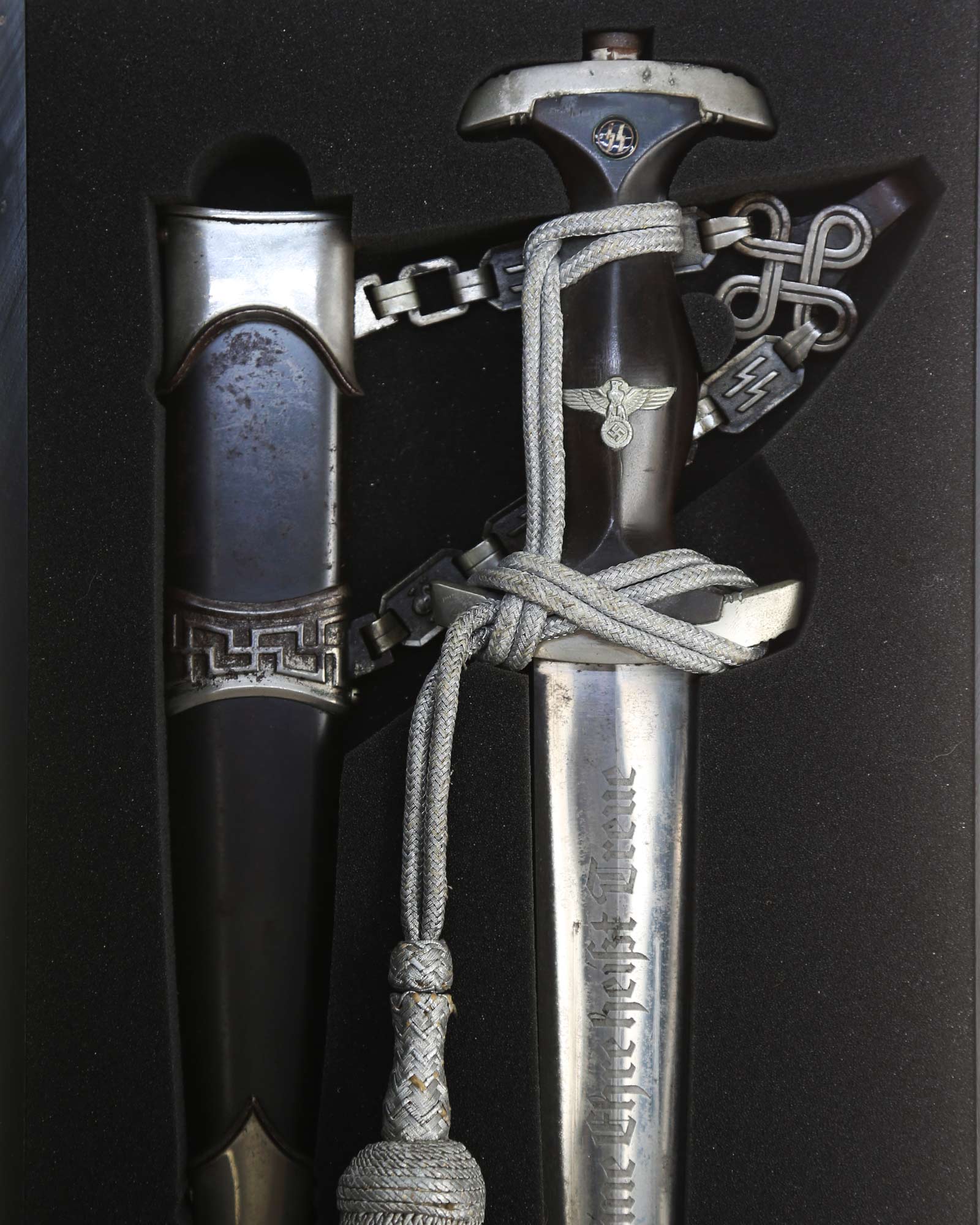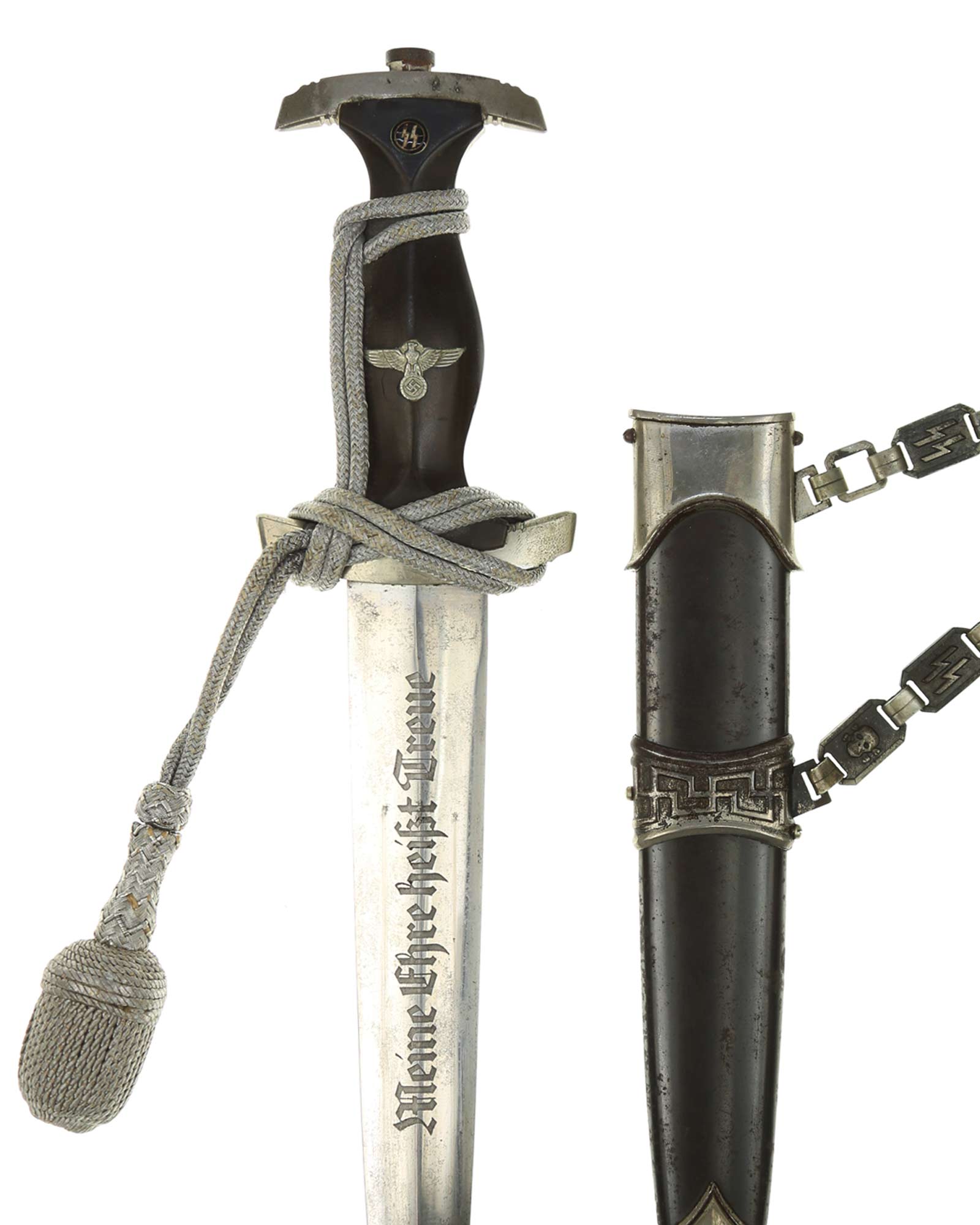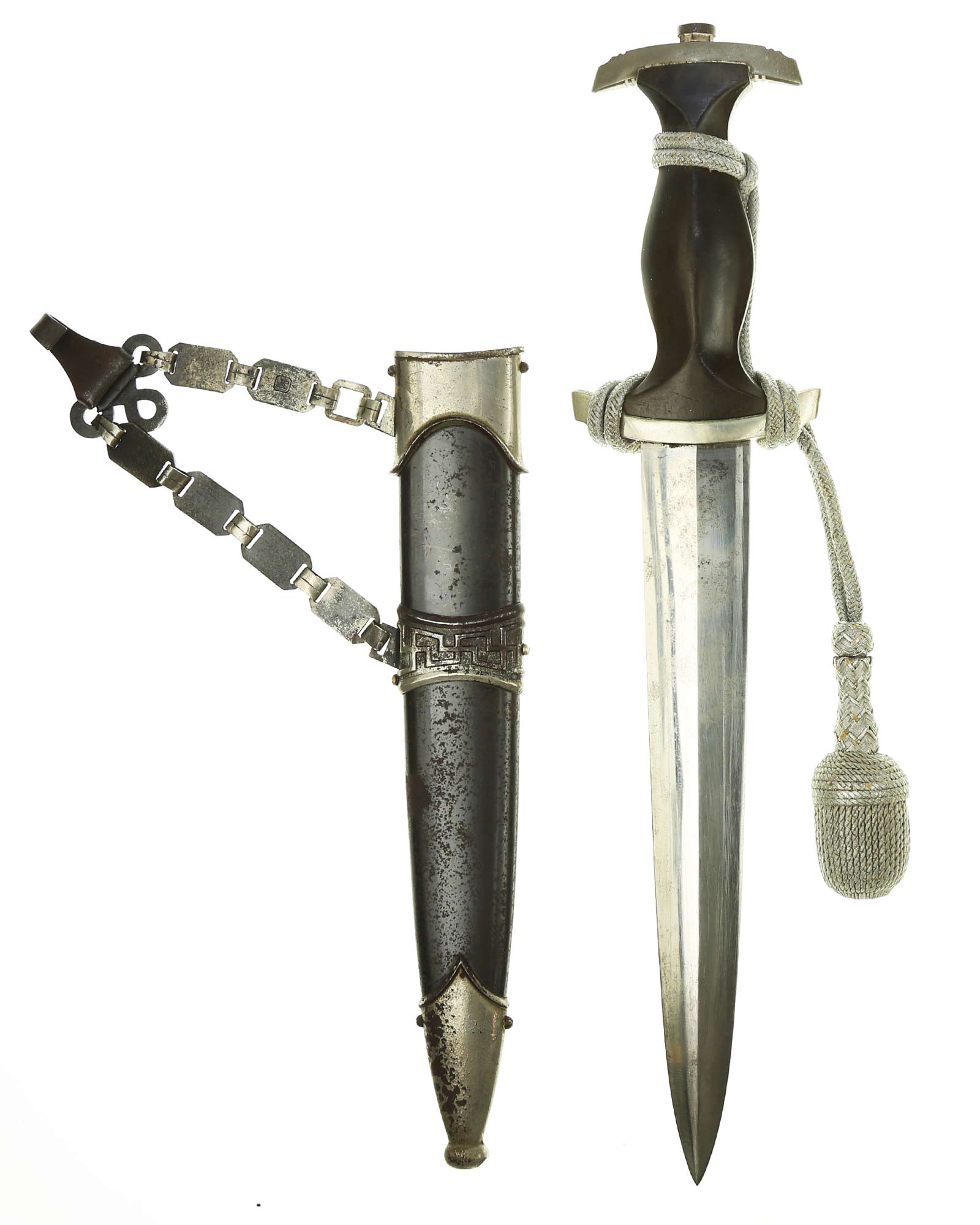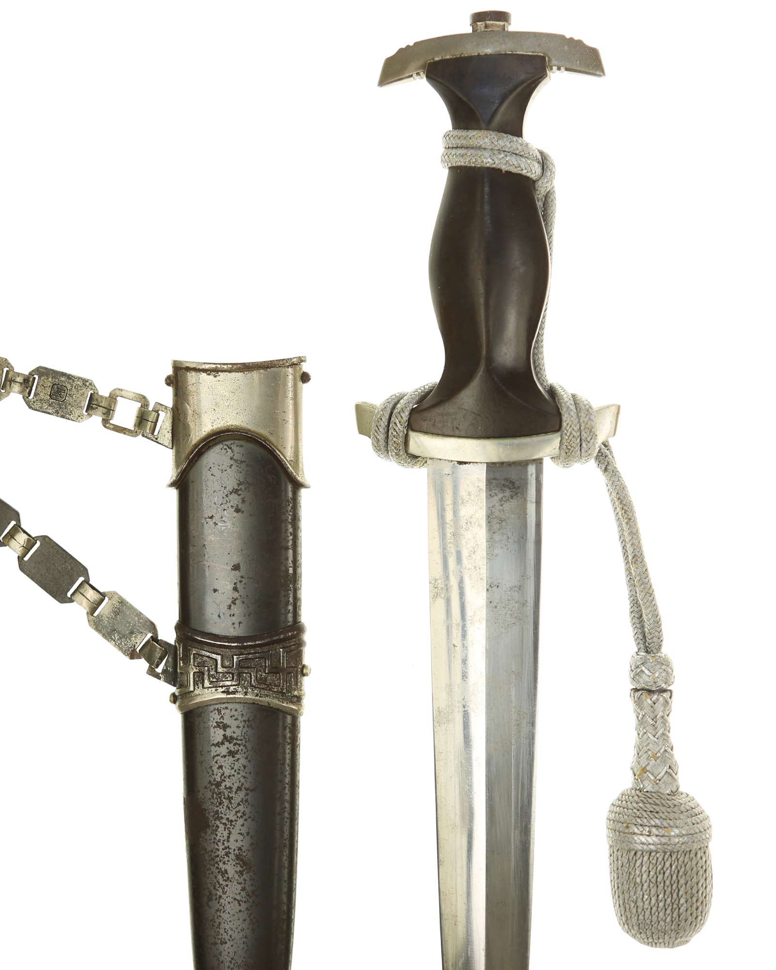 Ножны: Ножны металлические в оригинальном черном аннодировании. Прибор ножен состоит из устья и гайки с креплением для подвеса и наконечника с шариком. Сохранился оригинальный цепной подвес с символикой из черепов и символов SS. На оборотной стороне одного из звеньев стоит клеймо приемки Waffen-SS из двух переплетающихся молний. Детализация цепи типа-B2: Фоновая поверхность звеньев ссимволами без чернения. Сужающиеся верхние соединительные элементы подогнаны друг к другу. СС-штамп глубоко нанесен машинным способом с обратной стороны звена с символом. Соединительные элементы относительно плоские. Переходы узла Вотана часто крупнее окружающей рельефной полосы. Центральное и верхнее отверстия узла закрыты. Цепь покрыта красивой равномерной патиной.