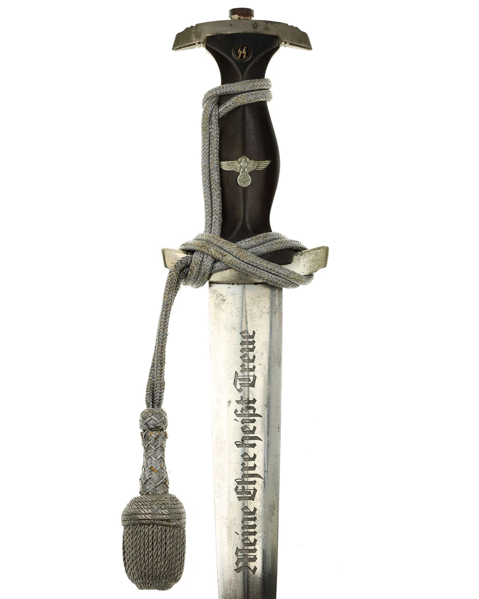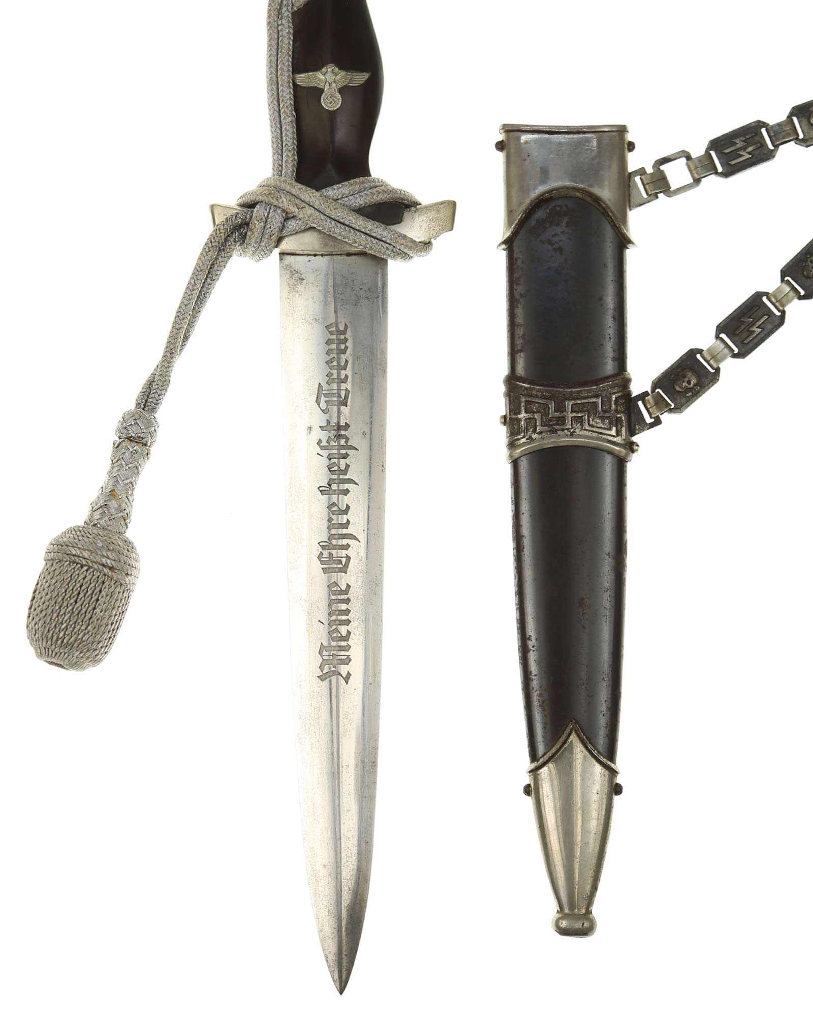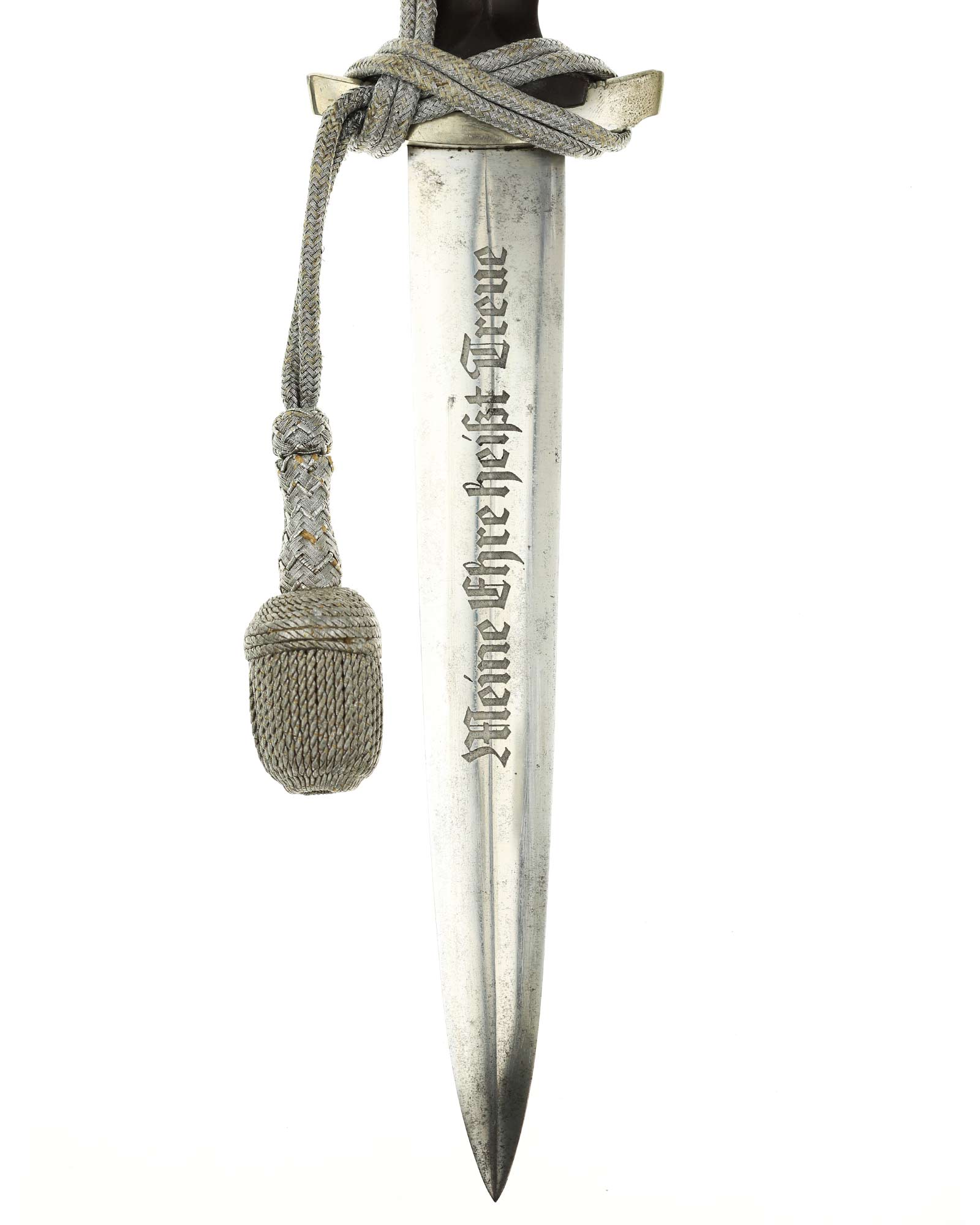 Клинок: Клинок кинжала прямой, стальной, двулезвийный, кинжального типа, с выраженным центральным ребром. На одной стороне клинка методом травления нанесен девиз СС «Meine Ehre heisst Treue» (Моя честь называется верностью). Клинок, как и положено без клейма производителя - только на кинжалах этого типа клеймо производителя не ставилось для конфиденциальности владельца.