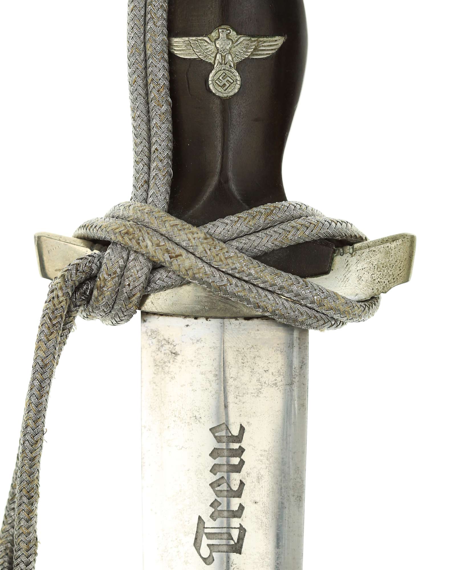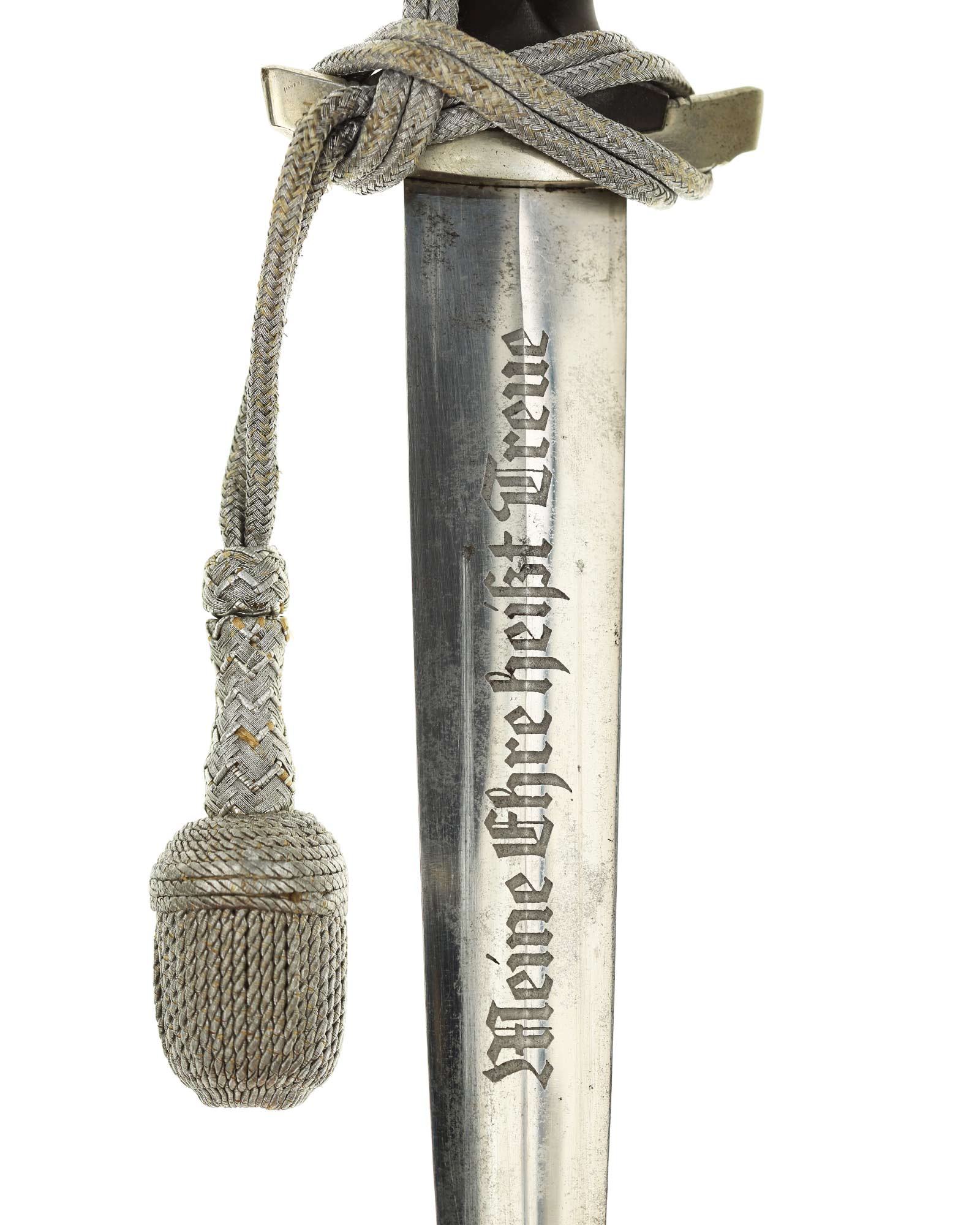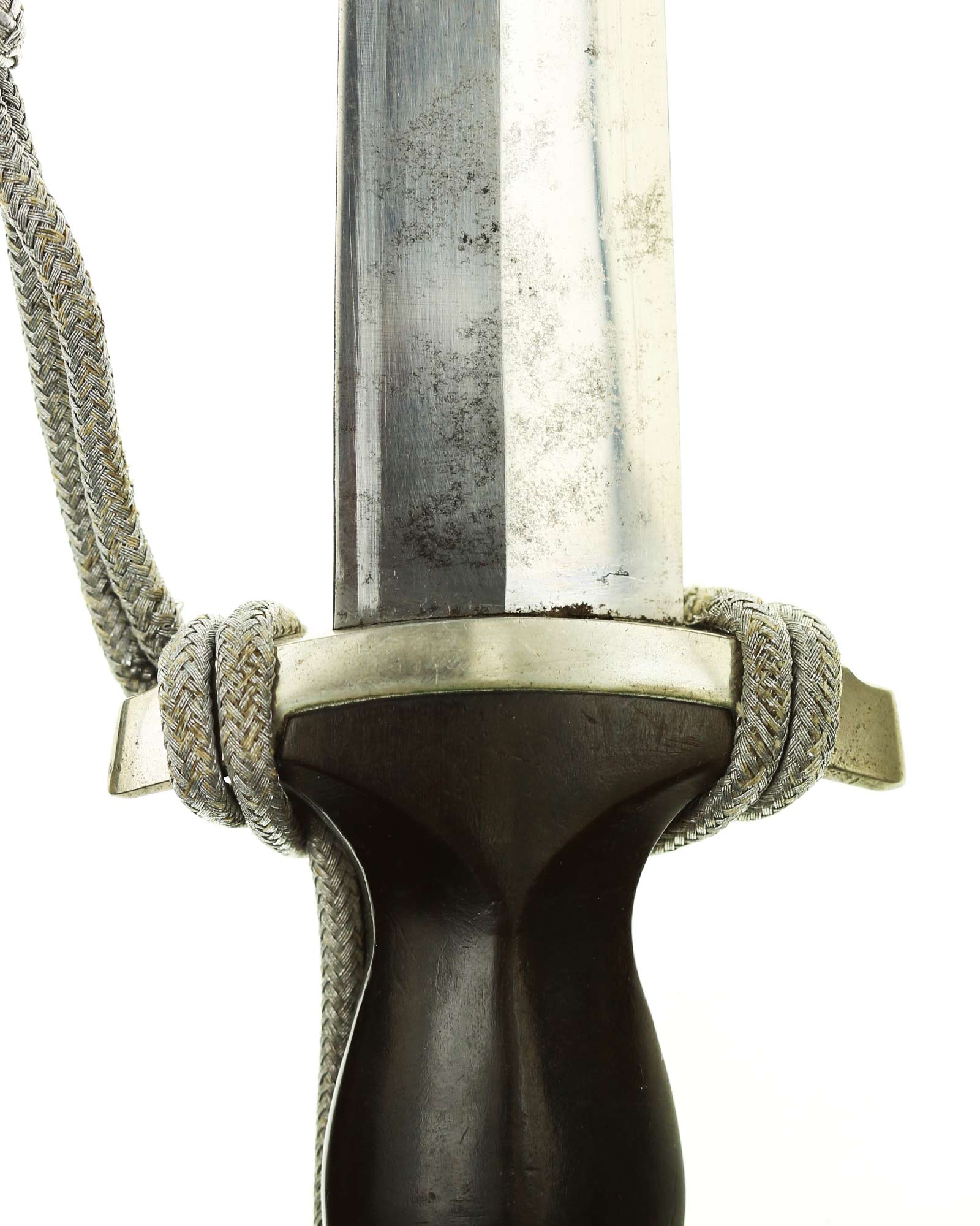 Клинок: Клинок кинжала прямой, стальной, двулезвийный, кинжального типа, с выраженным центральным ребром. На одной стороне клинка методом травления нанесен девиз СС «Meine Ehre heisst Treue» (Моя честь называется верностью). Клинок, как и положено без клейма производителя - только на кинжалах этого типа клеймо производителя не ставилось для конфиденциальности владельца.