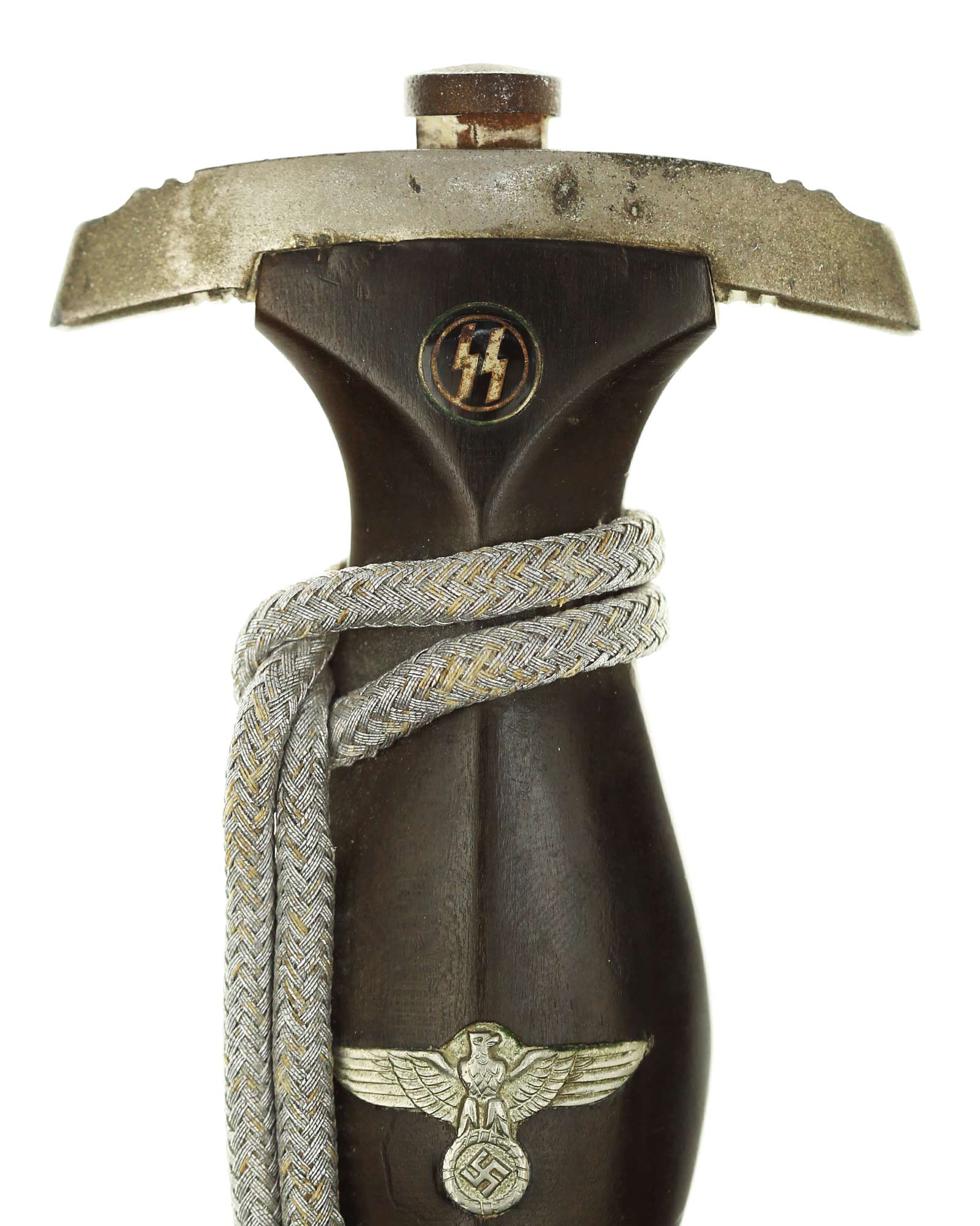 Рукоять: Рукоять из мореного в черный цвет дерева. Рукоять в верхней части имеет вставку в виде черного эмалевого глазка с рунами, в средней части – вставка в виде орла СС. Металлические элементы гарды изготовлены из мельхиора.