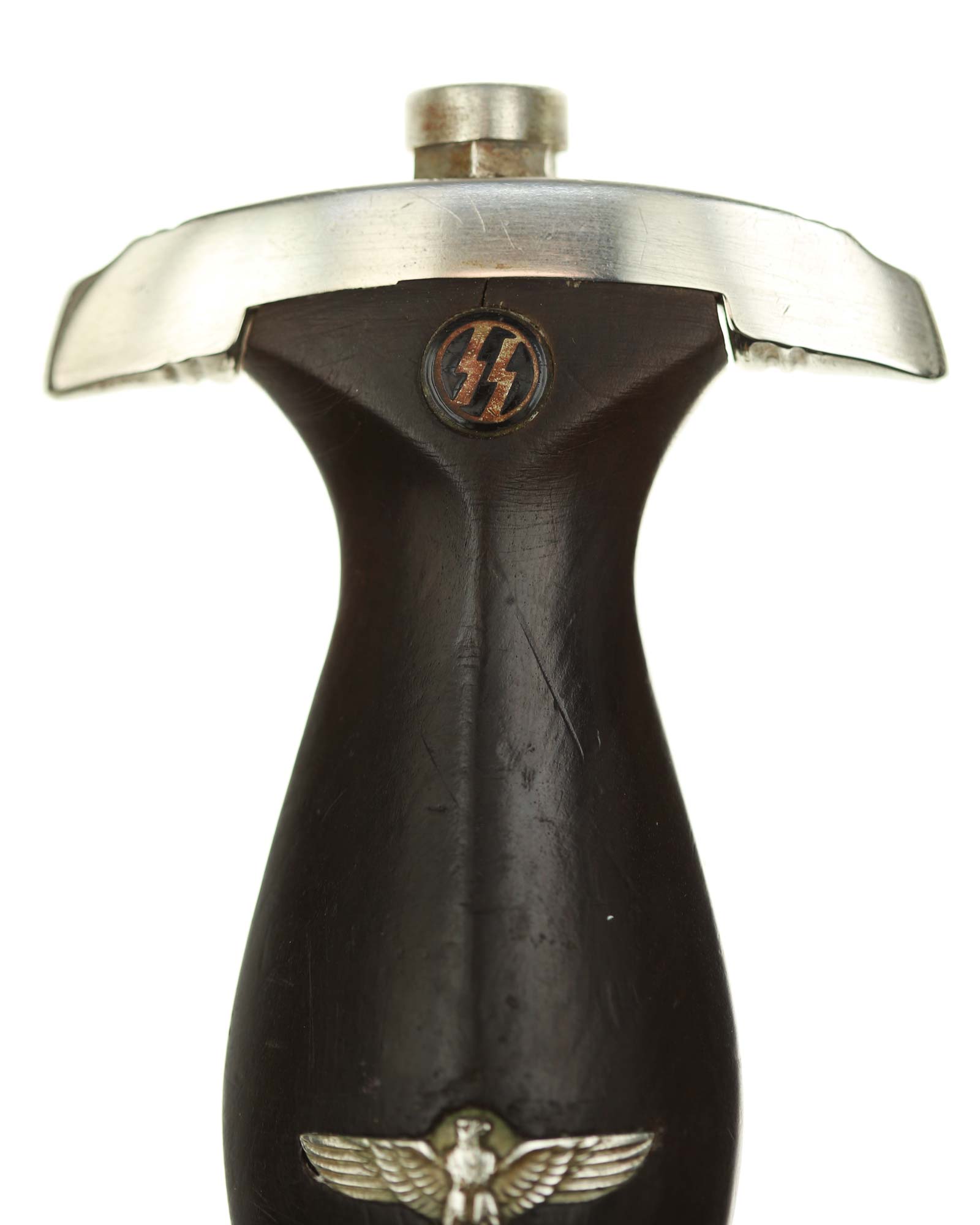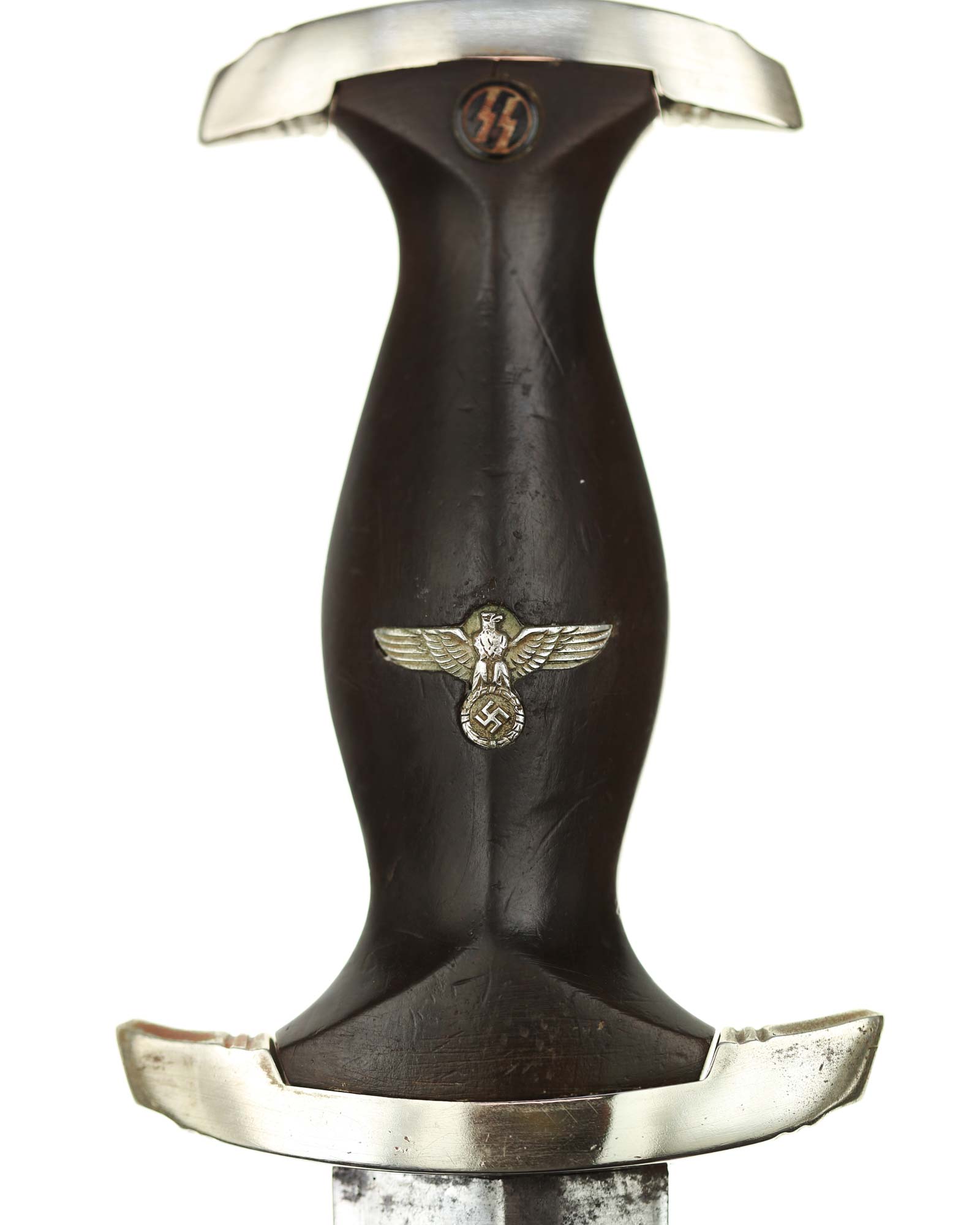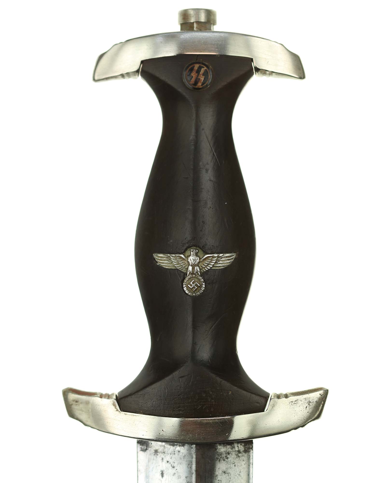 Рукоять: Рукоять из мореного в черный цвет дерева. Рукоять в верхней части имеет вставку в виде черного эмалевого глазка с рунами, в средней части рукояти – металлический знак в виде стилизованного изображения раскинувшего крылья орла, держащего в когтях венок со свастикой. Металлические элементы гарды изготовлены из мельхиора. Крестовина С-образная, белого металла, с концами, чуть загнутыми вверх, в несколько увеличенном и перевернутом виде копирует навершие рукояти.