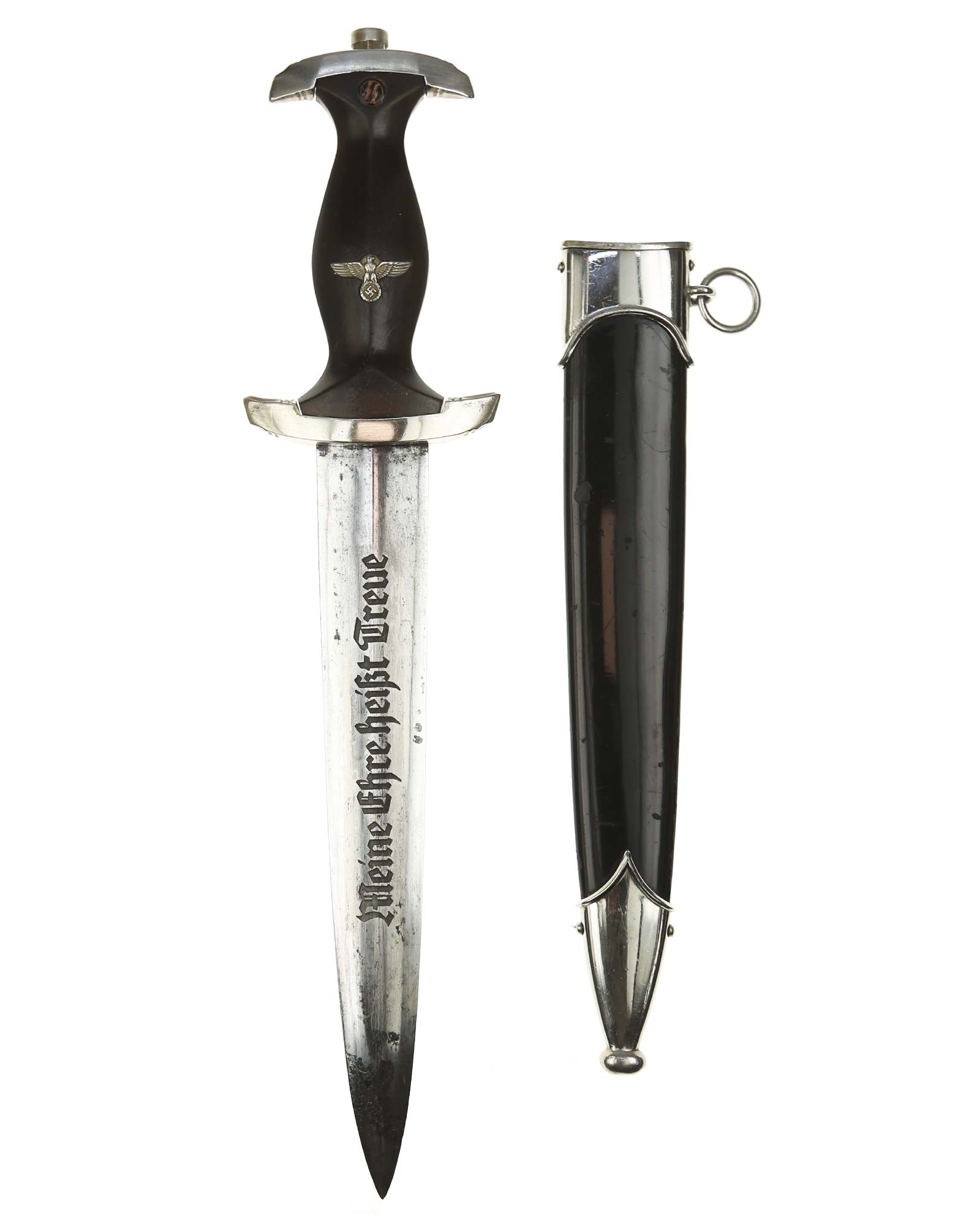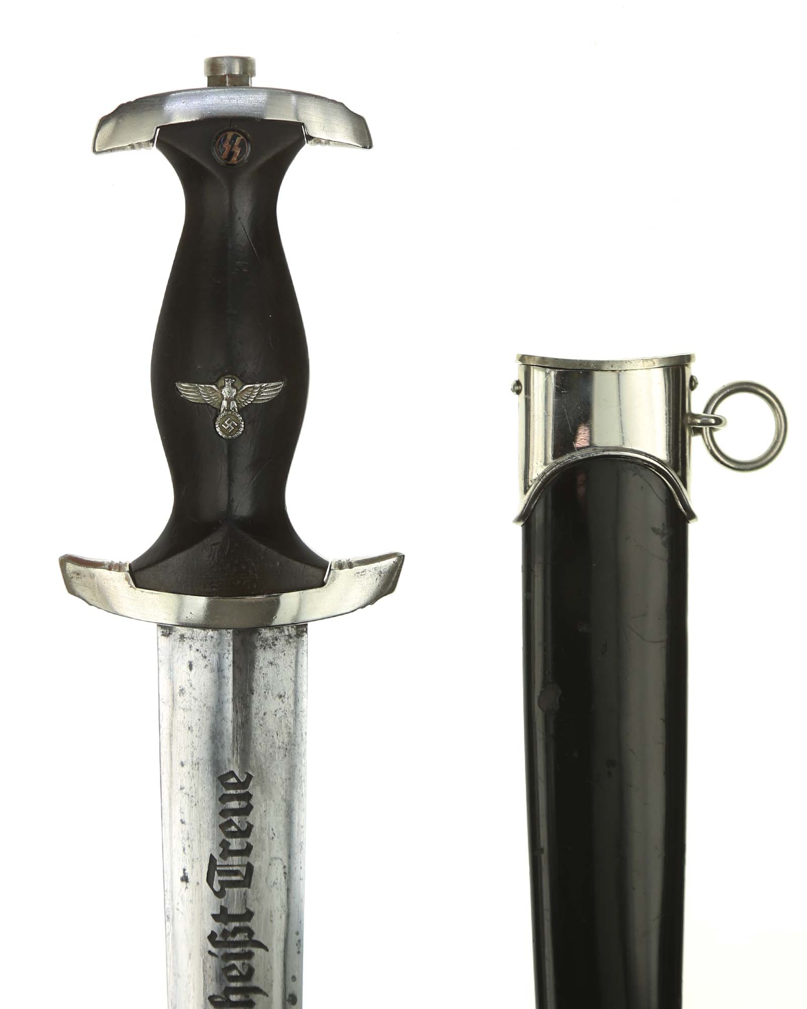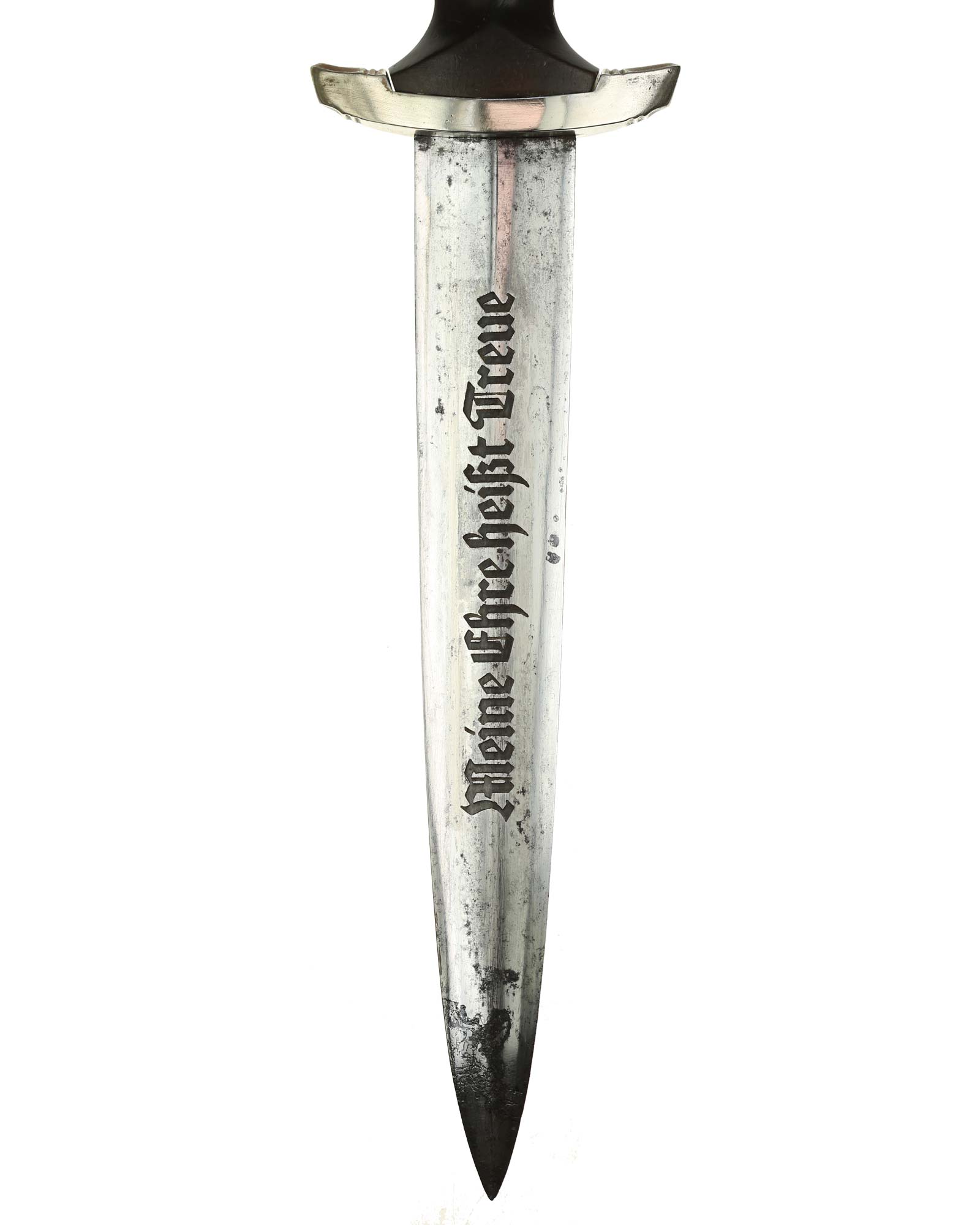 Клинок: Клинок кинжала прямой, стальной, двулезвийный, кинжального типа, с выраженным центральным ребром. На одной стороне клинка методом травления нанесен девиз СС «Meine Ehre heisst Treue» (Моя честь называется верностью). Клинок на оборотной стороне у основания стоит клеймо производителя Хайнрих Беккер, Золинген (Heinrich Böker, Solingen).