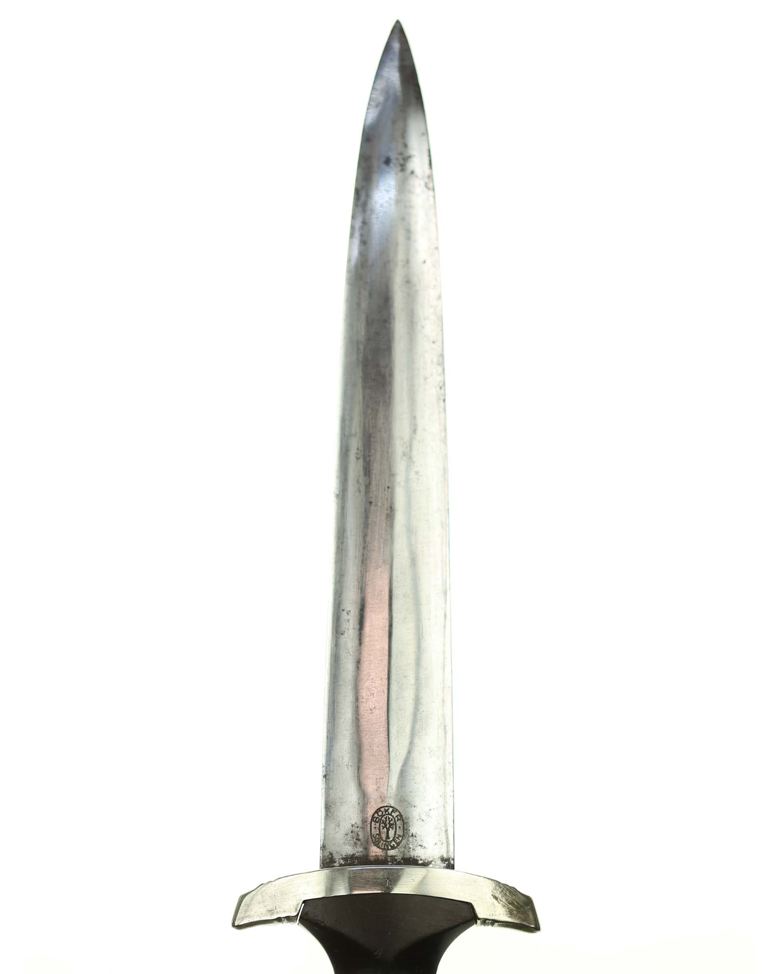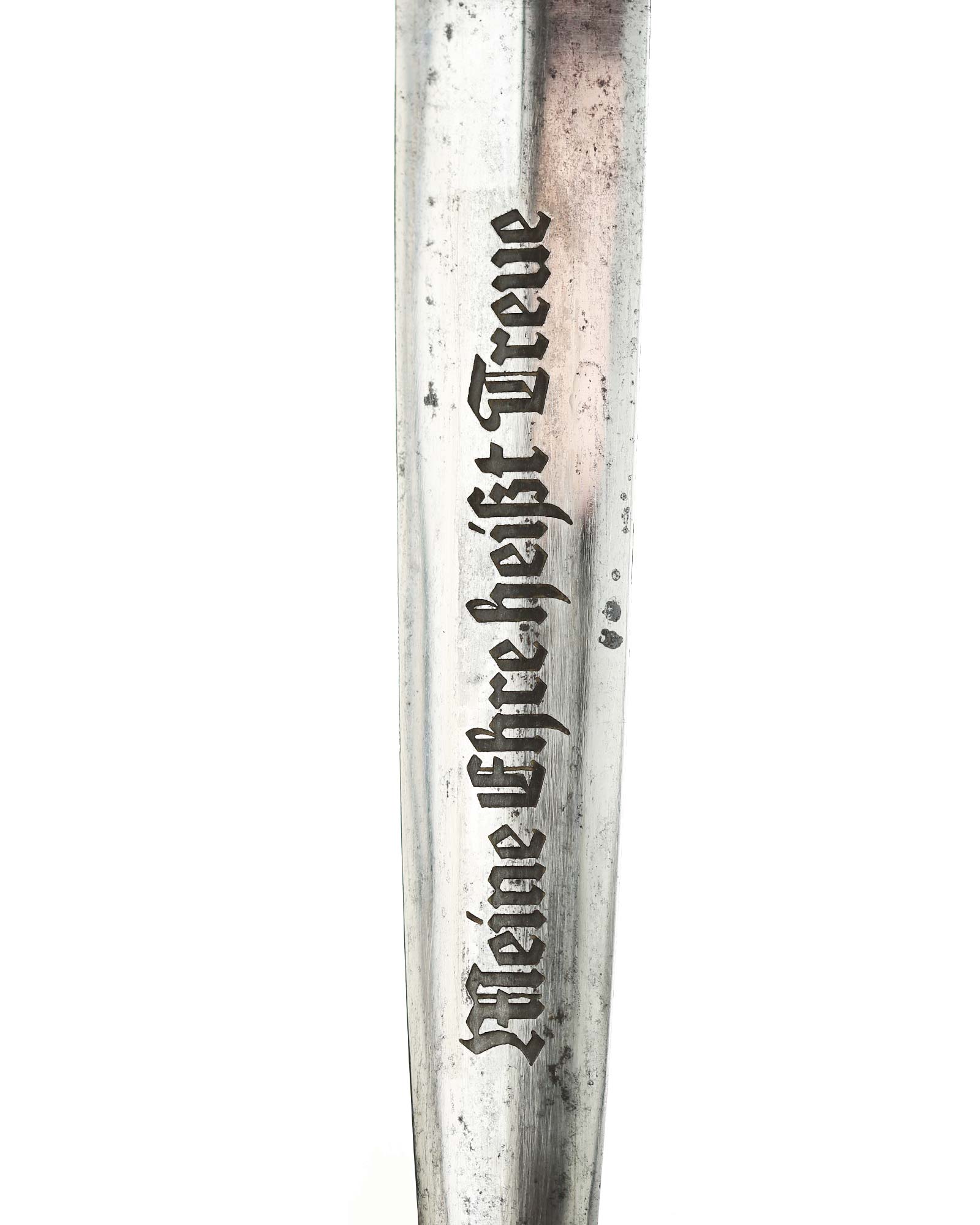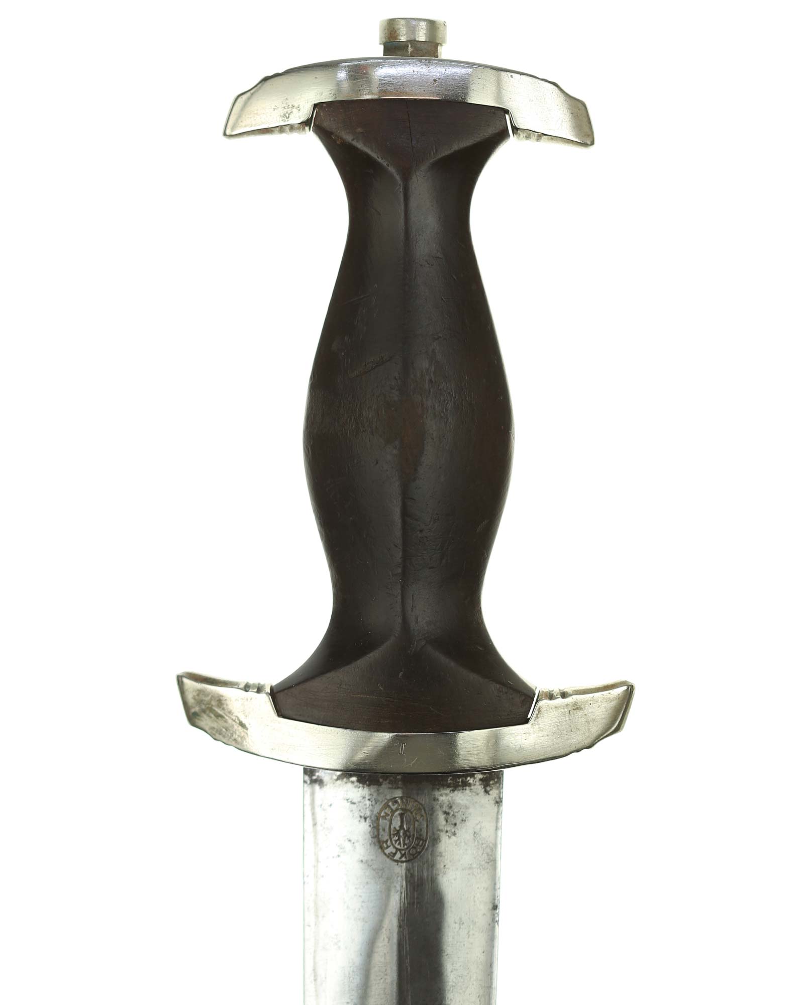 Клинок: Клинок кинжала прямой, стальной, двулезвийный, кинжального типа, с выраженным центральным ребром. На одной стороне клинка методом травления нанесен девиз СС «Meine Ehre heisst Treue» (Моя честь называется верностью). Клинок на оборотной стороне у основания стоит клеймо производителя Хайнрих Беккер, Золинген (Heinrich Böker, Solingen).