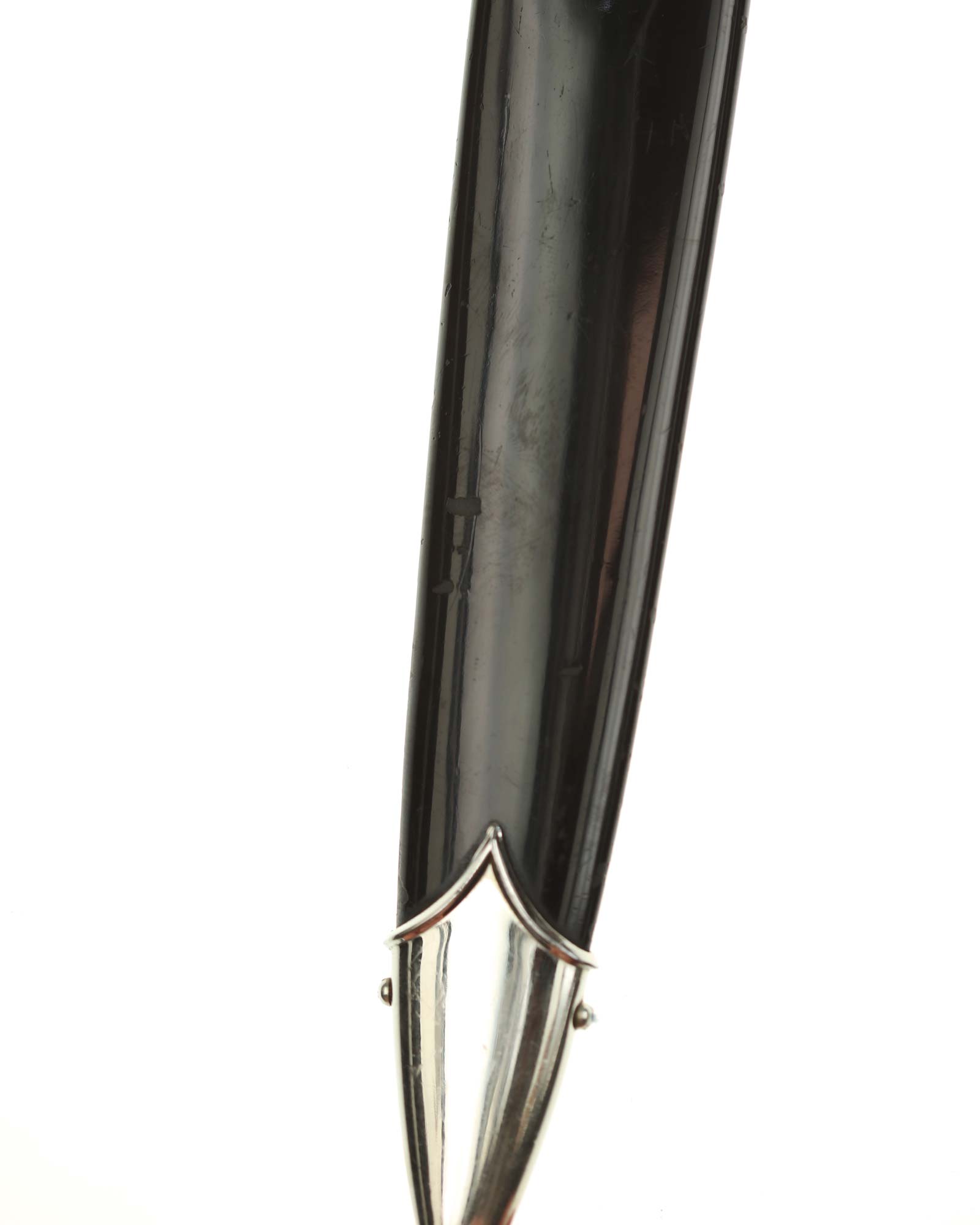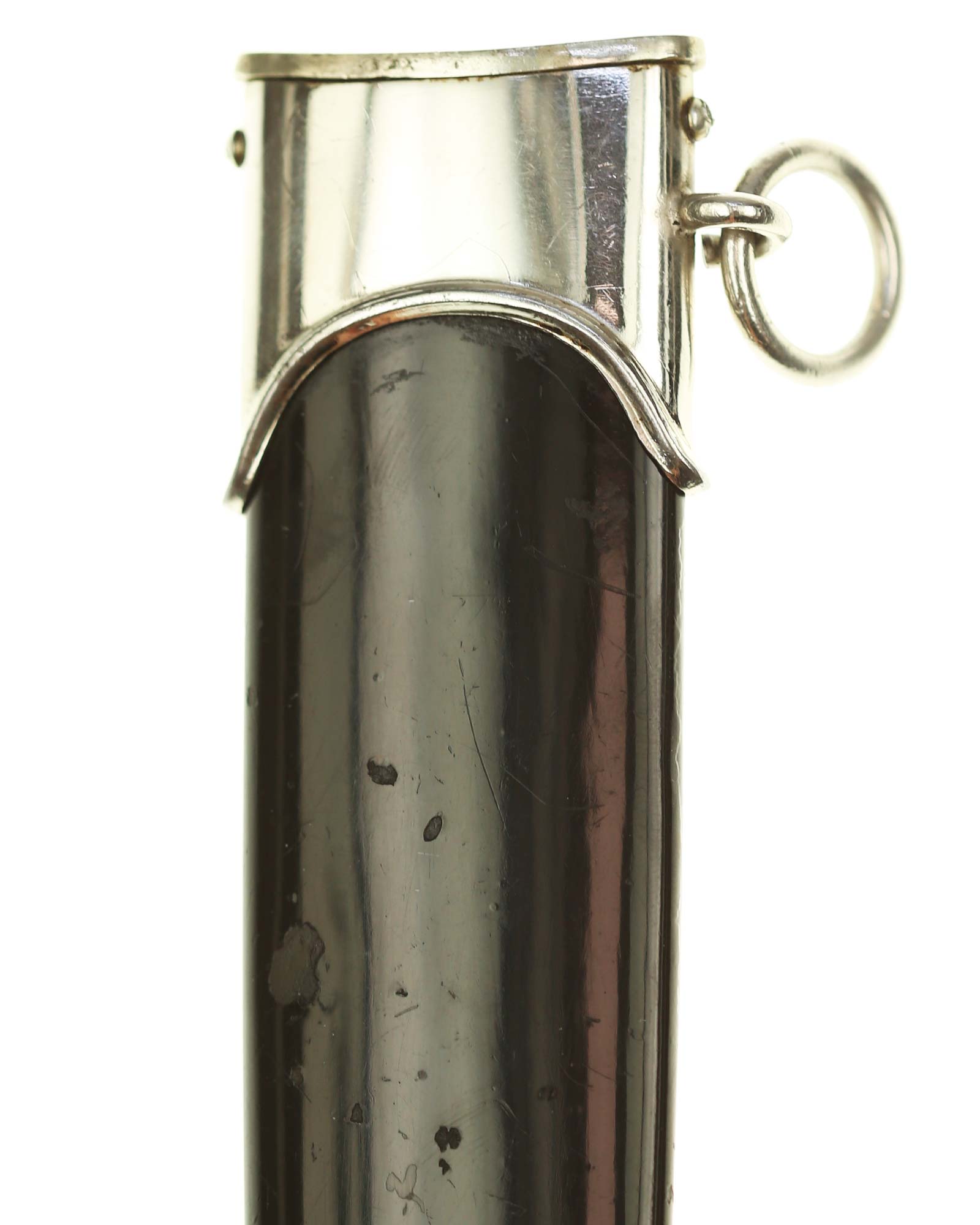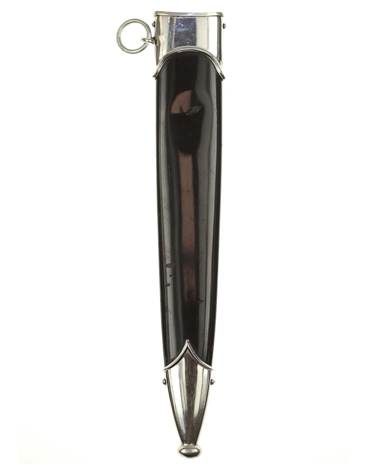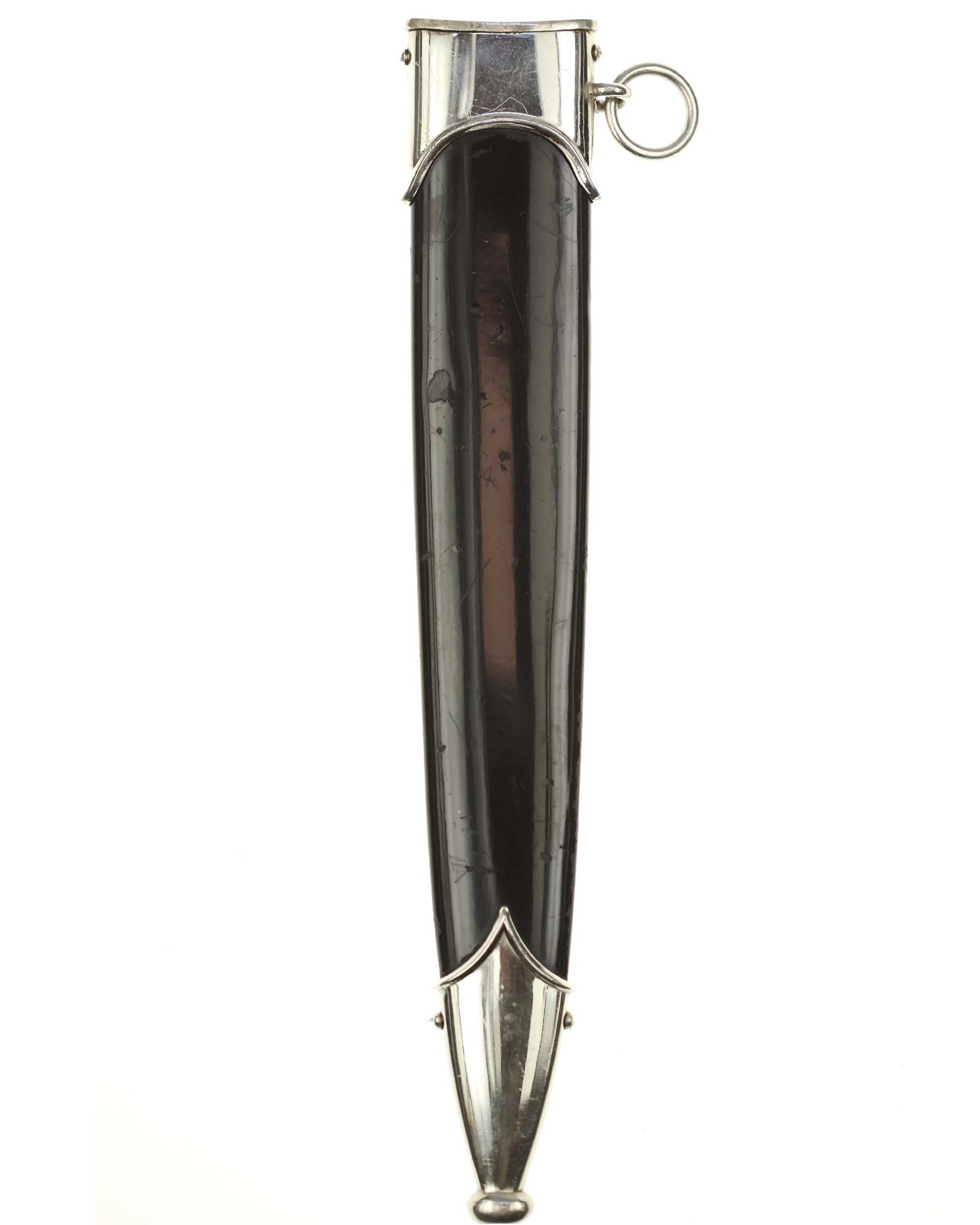 Ножны: Ножны металлические. Черные ножны с посеребренным прибором и одним подвижным кольцом для крепления к подвесу.
