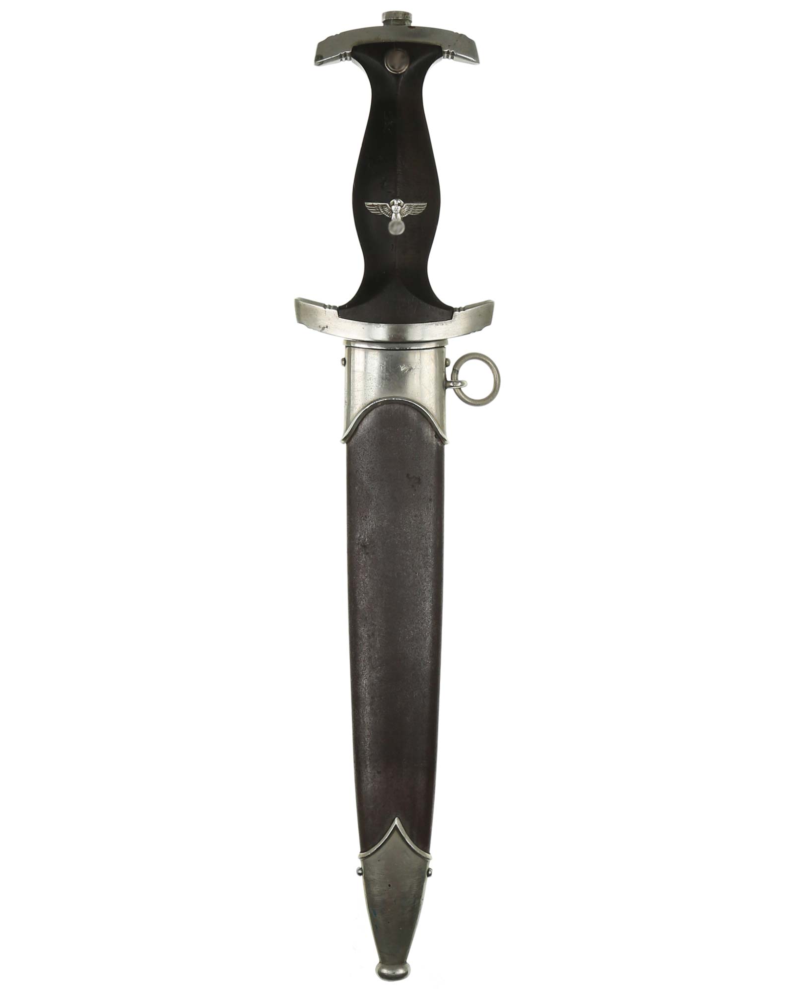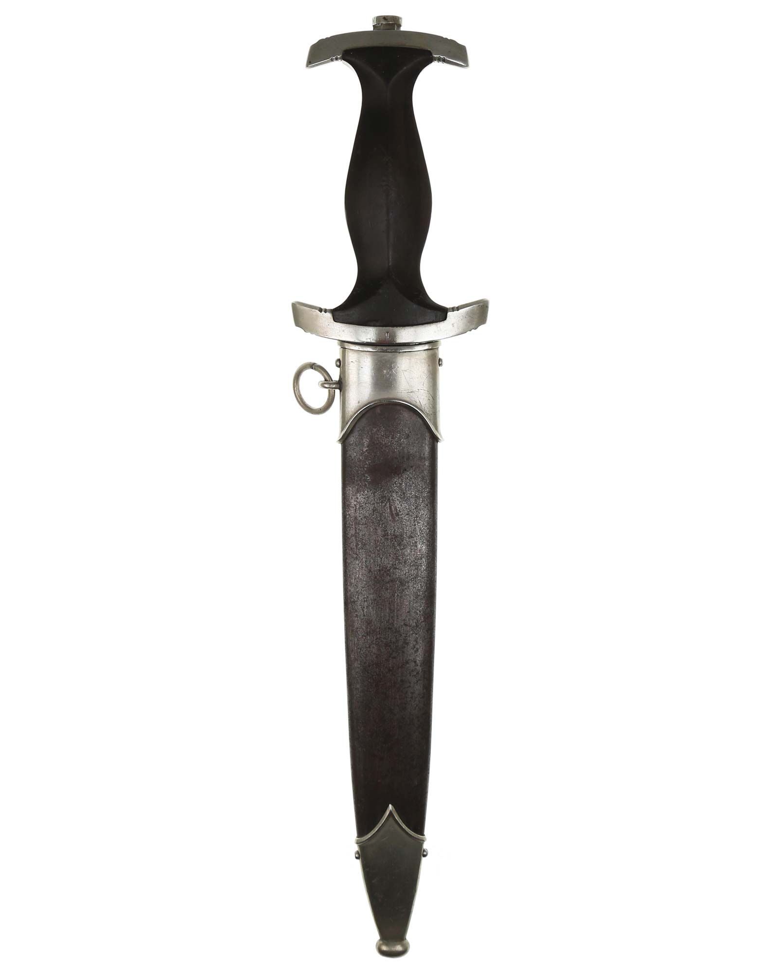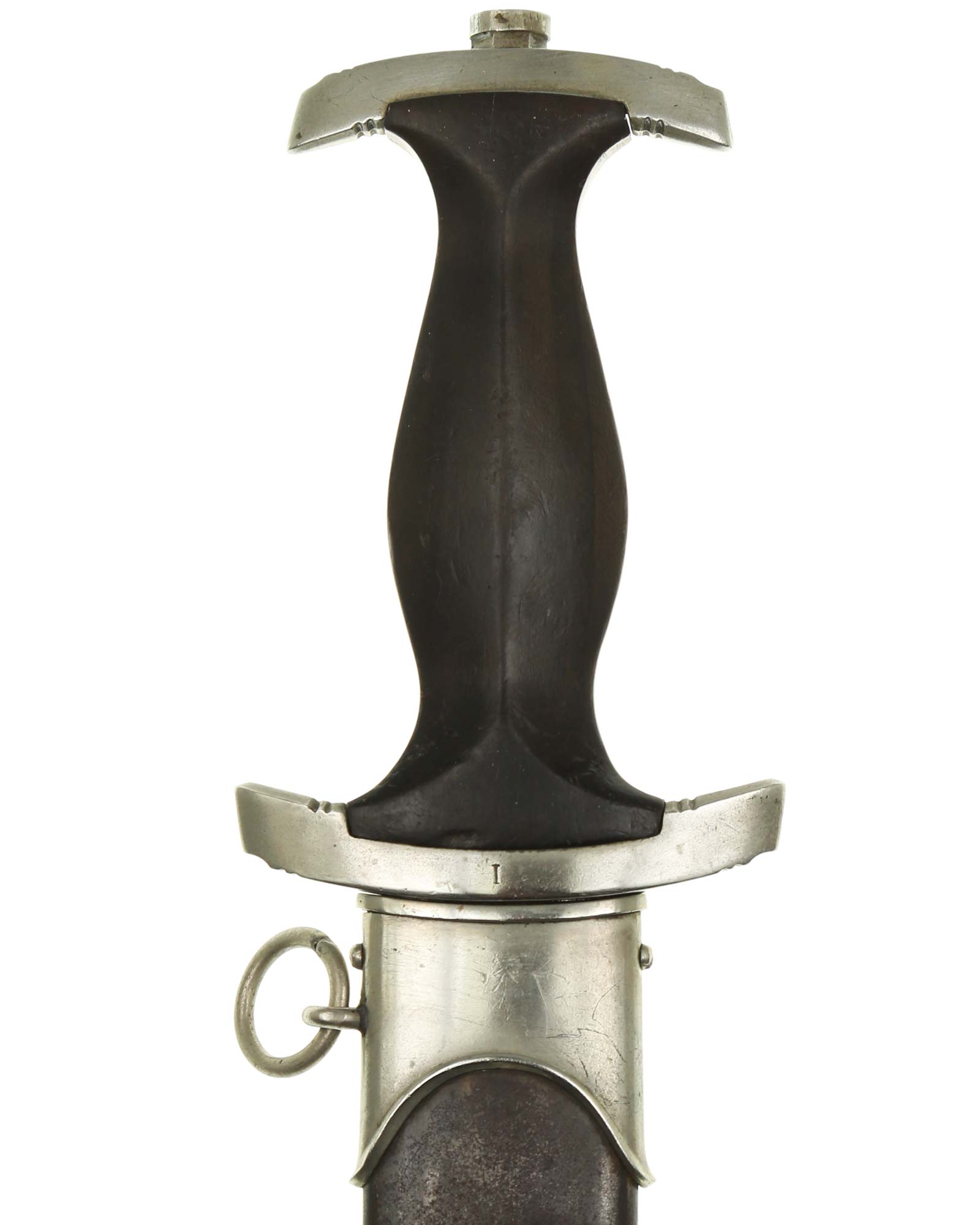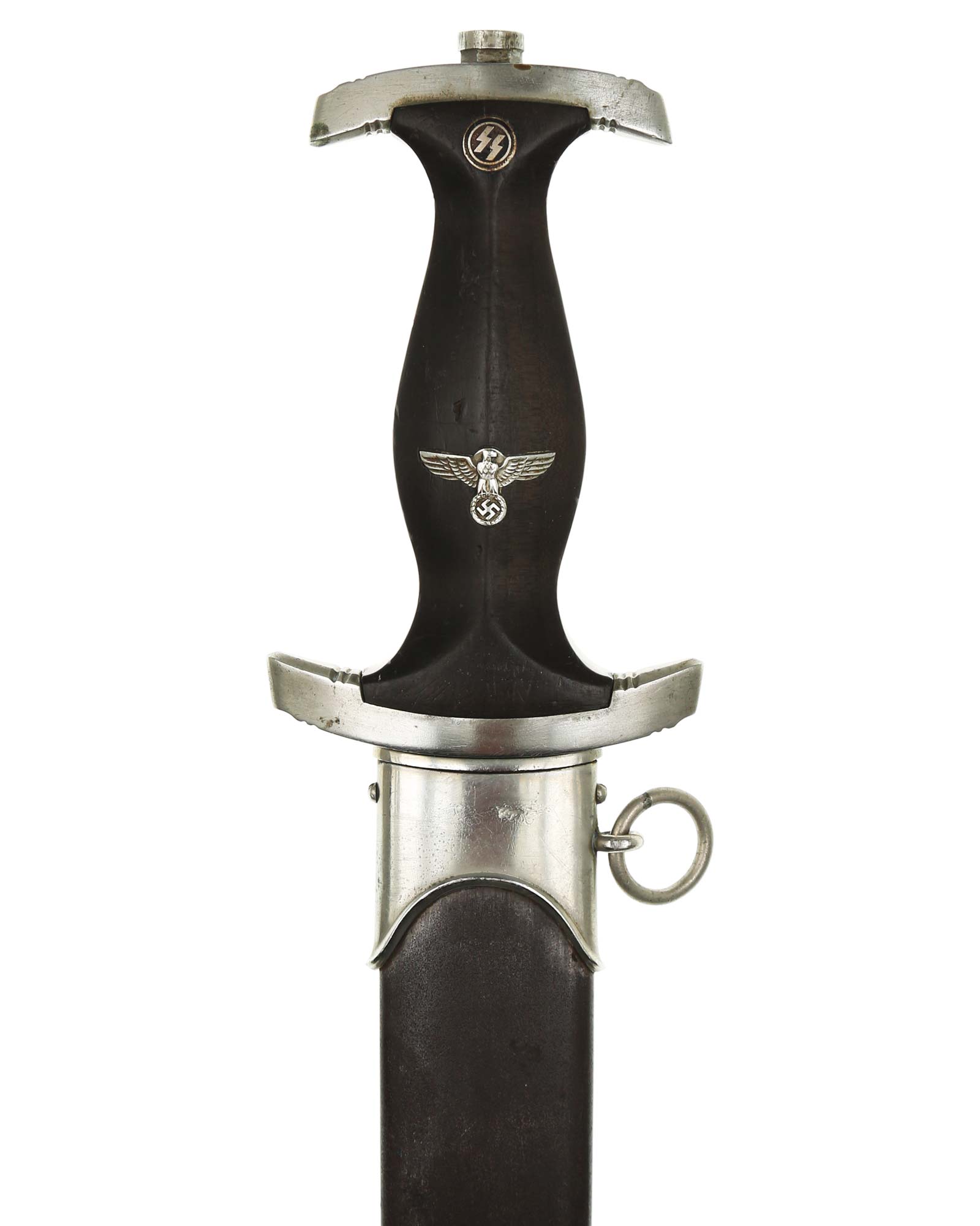 Рукоять: Рукоять из мореного в черный цвет дерева. Рукоять в верхней части имеет вставку в виде черного эмалевого глазка с рунами, в средней части рукояти – металлический знак в виде стилизованного изображения раскинувшего крылья орла, держащего в когтях венок со свастикой. Металлические элементы гарды изготовлены из мельхиора. Крестовина С-образная, белого металла, с концами, чуть загнутыми вверх, в несколько увеличенном и перевернутом виде копирует навершие рукояти - "I" [Мюнхен].