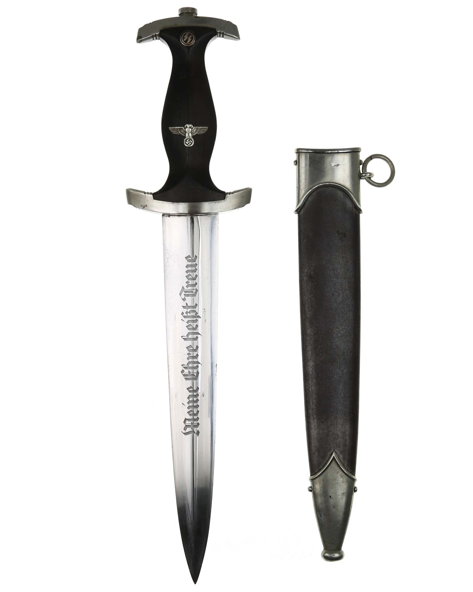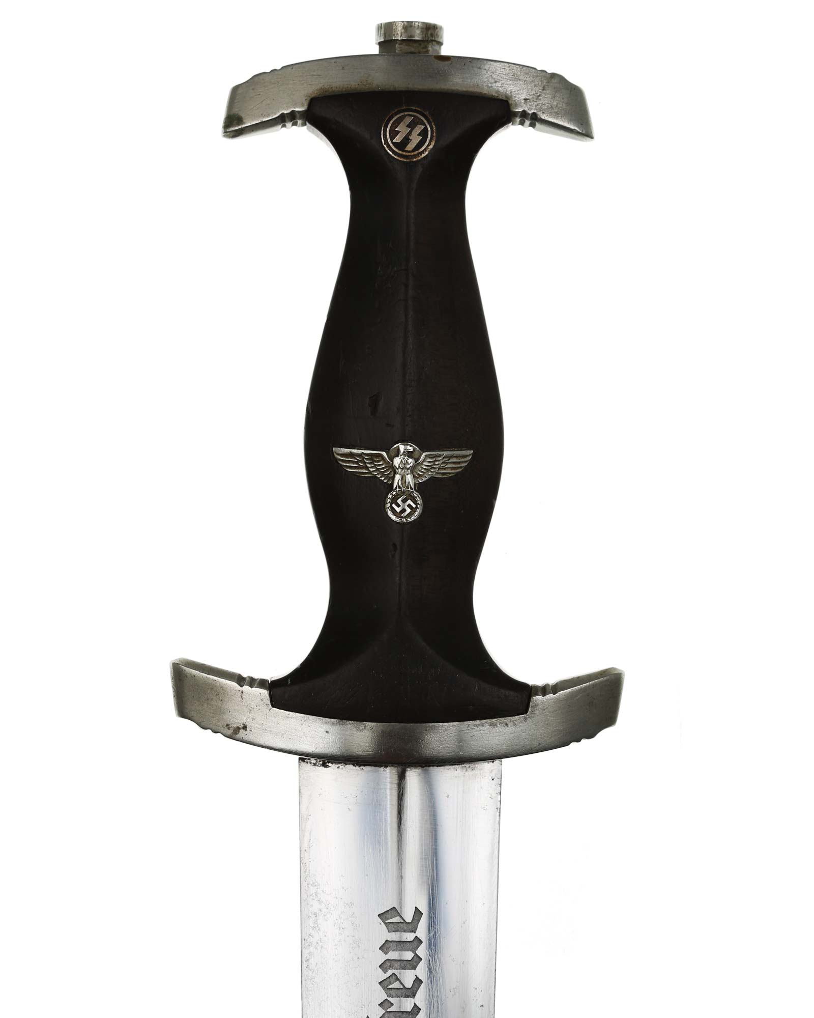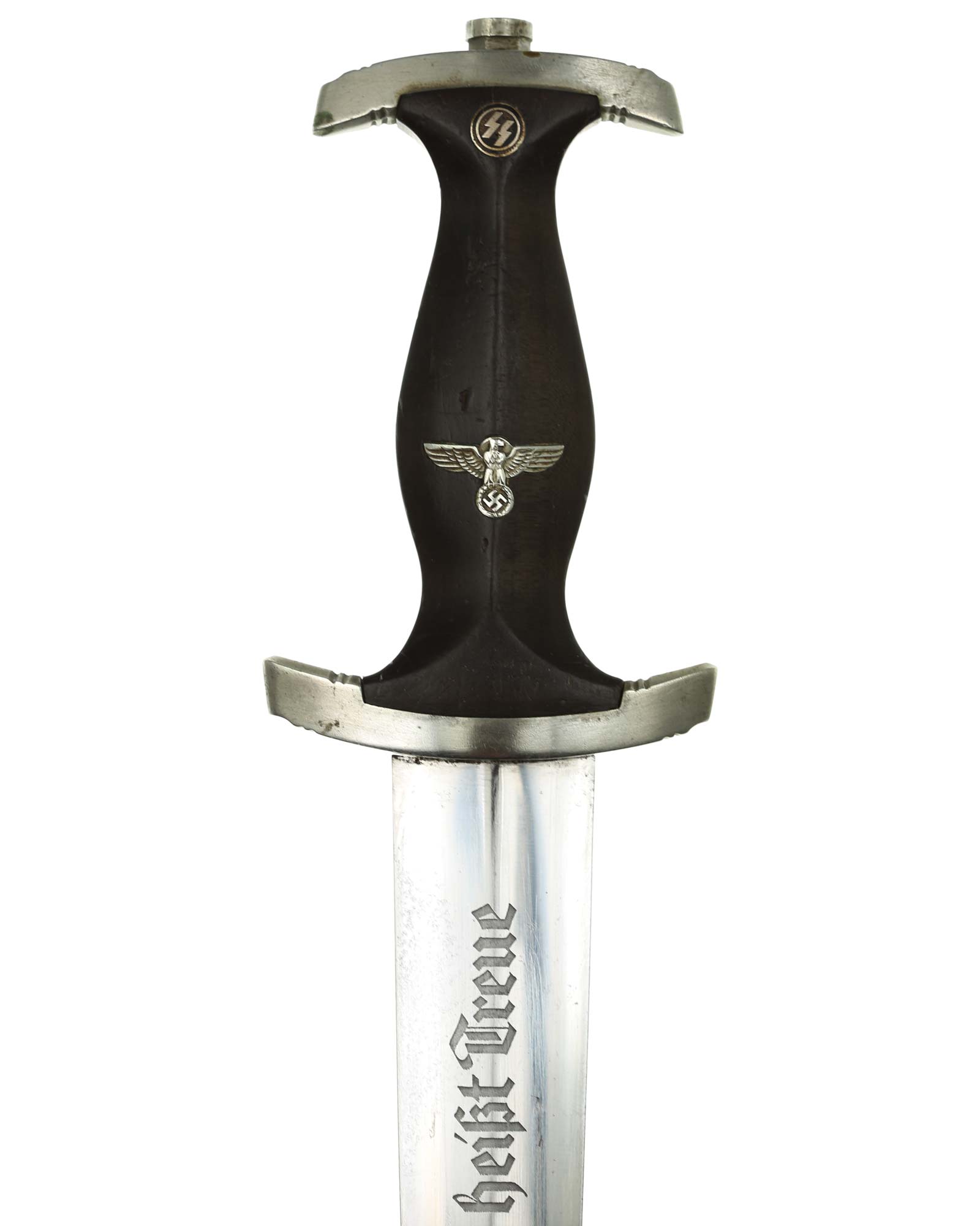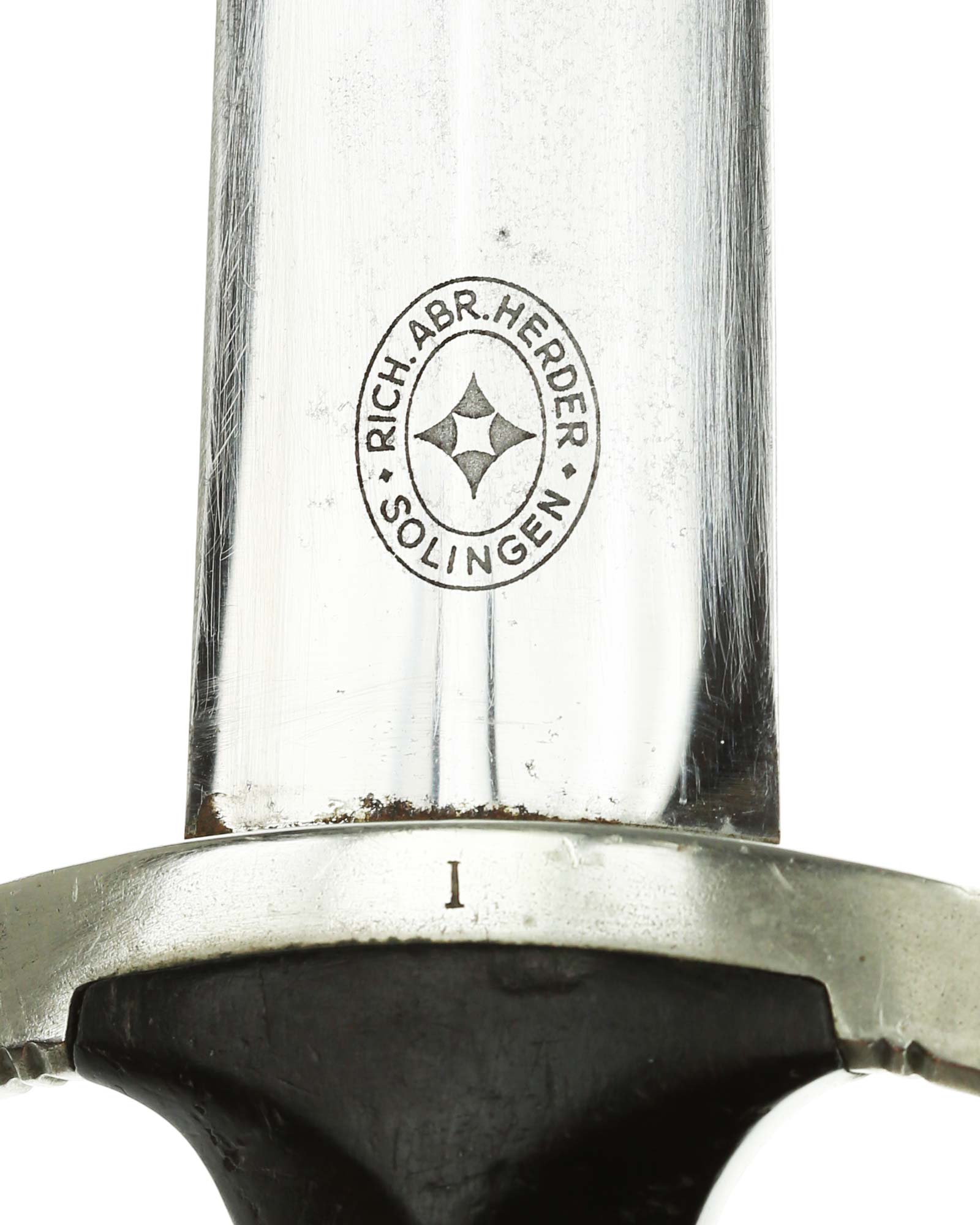 Клинок: Клинок кинжала прямой, стальной, двулезвийный, кинжального типа, с выраженным центральным ребром. На одной стороне клинка методом травления нанесен девиз СС «Meine Ehre heisst Treue» (Моя честь называется верностью). Клинок на оборотной стороне у основания стоит клеймо производителя Rich. A. Herder Solingen (Рихард А. Хердер Золинген).