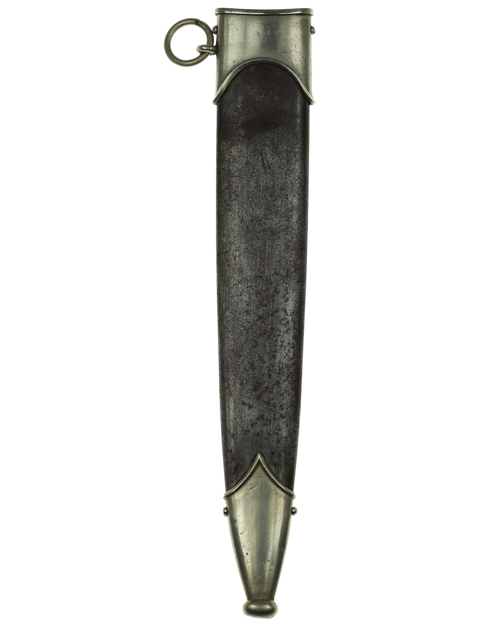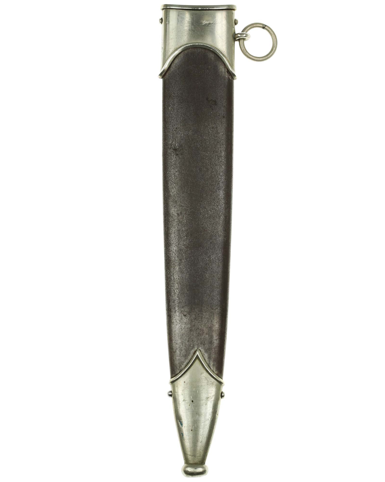Ножны: Ножны металлические. Прибор ножен изготовлен из белого металла и состоит из устья с гайкой и кольцом для подвешивания га ремень и устья с шариком.