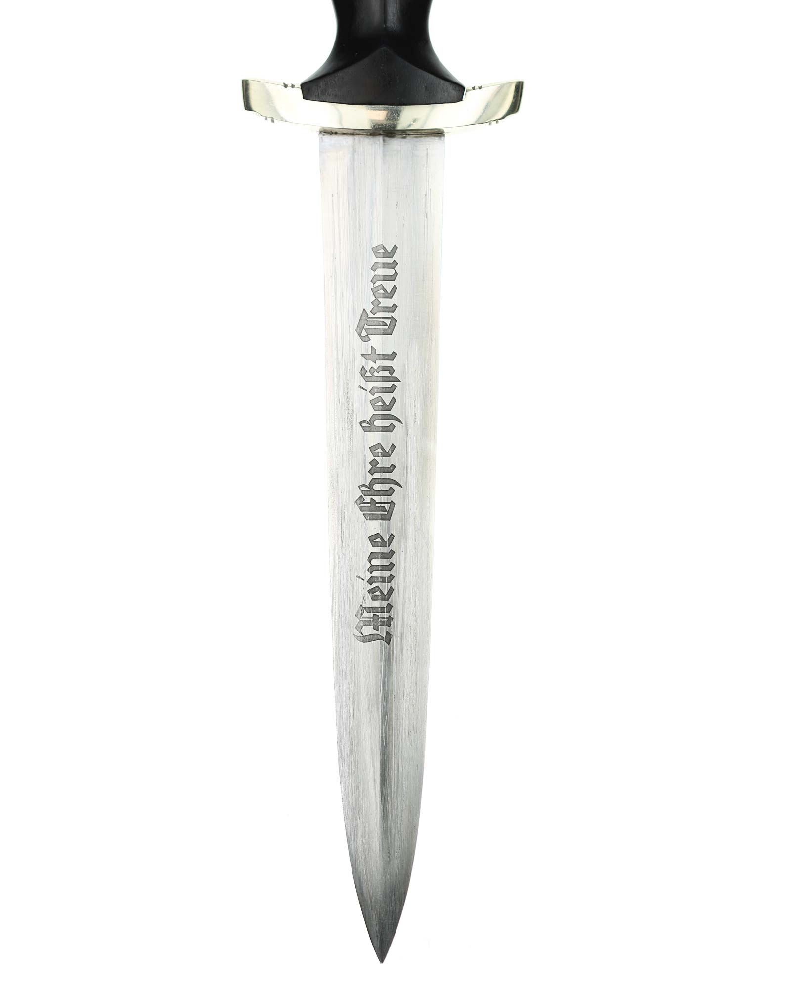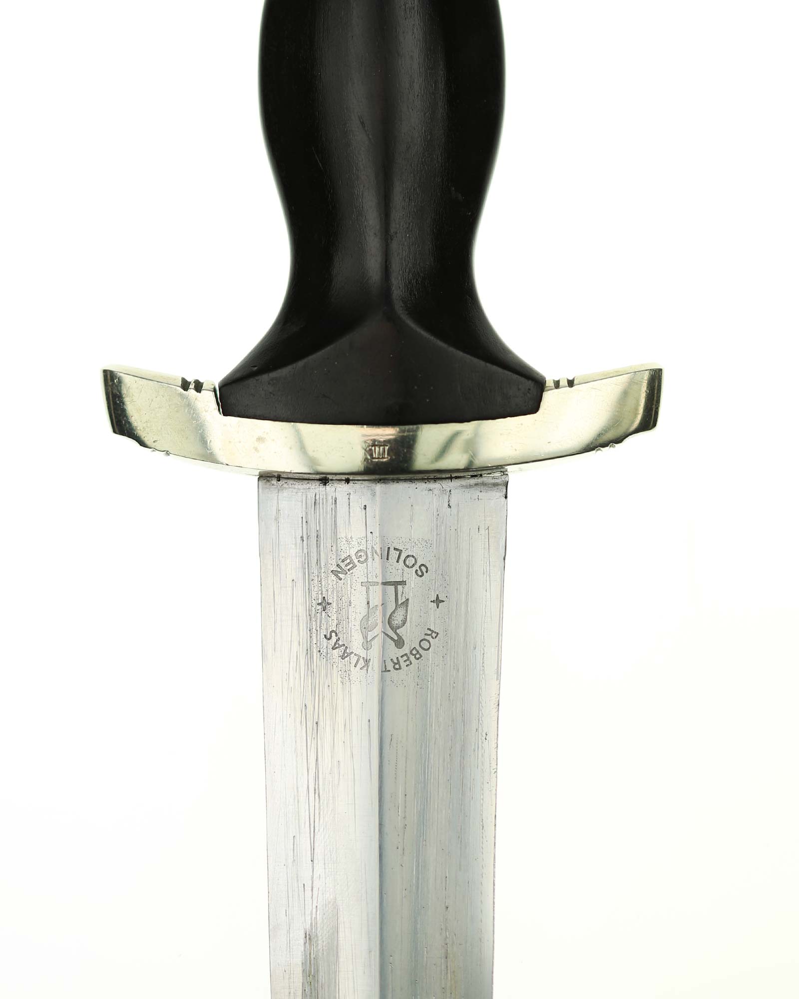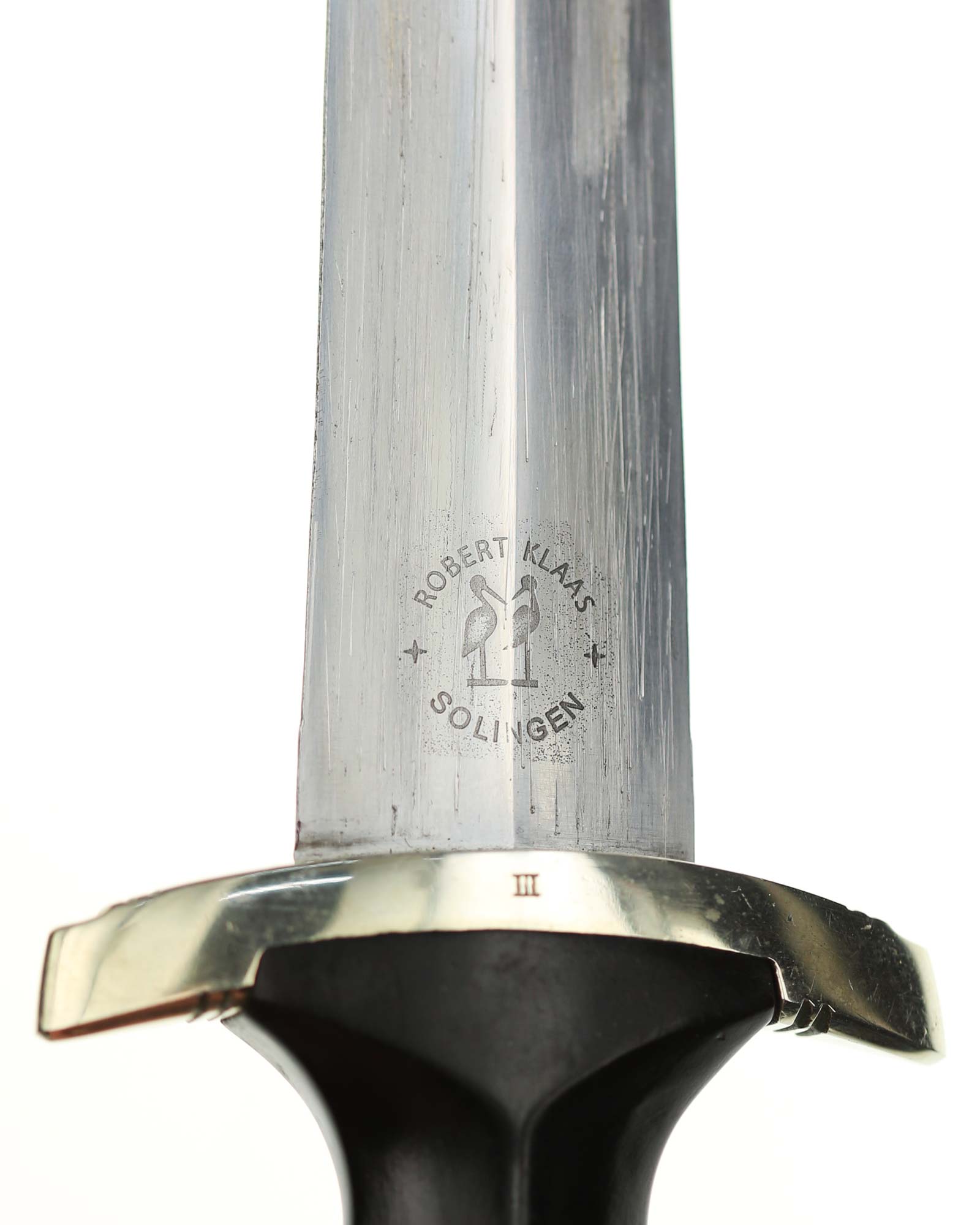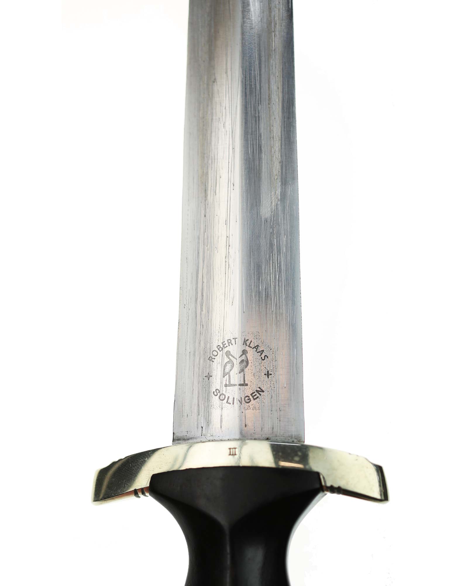 Клинок: Клинок кинжала прямой, стальной, двулезвийный, кинжального типа, с выраженным центральным ребром. На одной стороне клинка методом травления нанесен девиз СС «Meine Ehre heisst Treue» (Моя честь называется верностью). Клинок на оборотной стороне у основания стоит клеймо производителя Роберт Клаас Золинген (Robert Klaas Solingen).