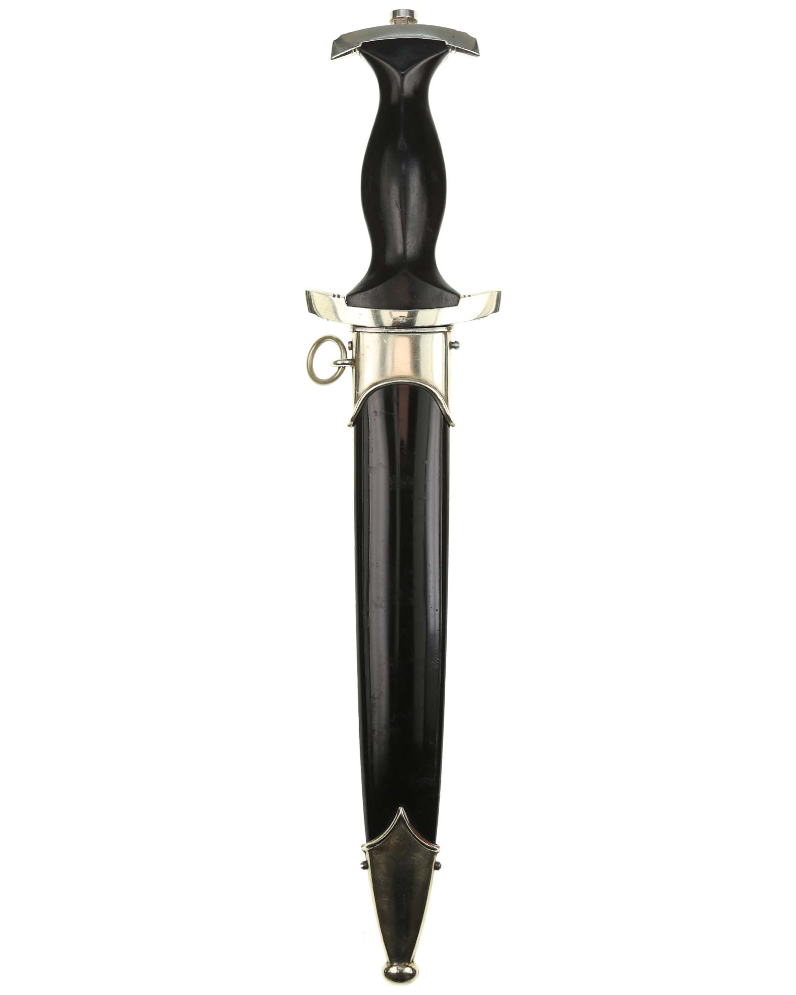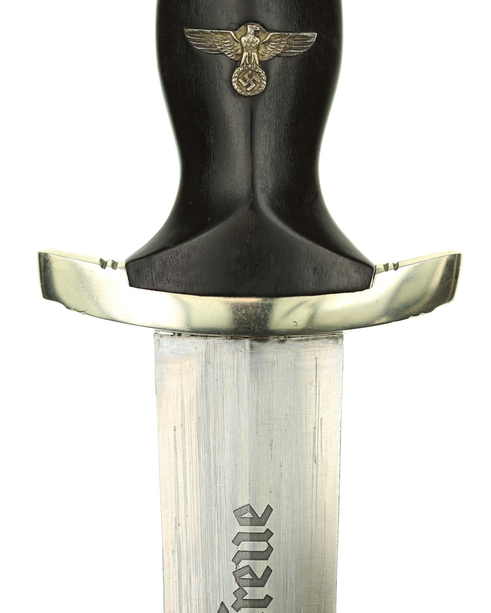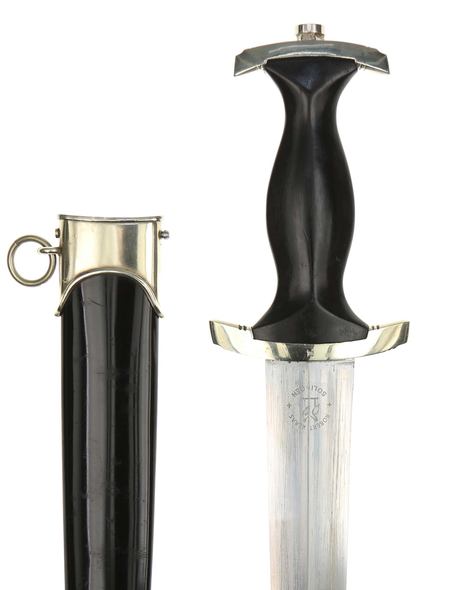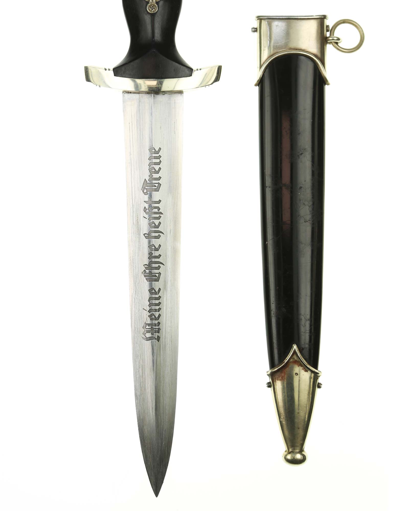 Клинок: Клинок кинжала прямой, стальной, двулезвийный, кинжального типа, с выраженным центральным ребром. На одной стороне клинка методом травления нанесен девиз СС «Meine Ehre heisst Treue» (Моя честь называется верностью). Клинок на оборотной стороне у основания стоит клеймо производителя Роберт Клаас Золинген (Robert Klaas Solingen).