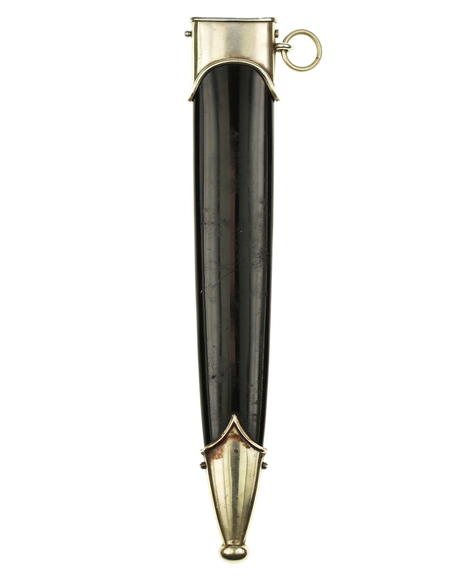 Ножны: Ножны металлические. Черные ножны с посеребренным прибором и одним подвижным кольцом для крепления к подвесу.
