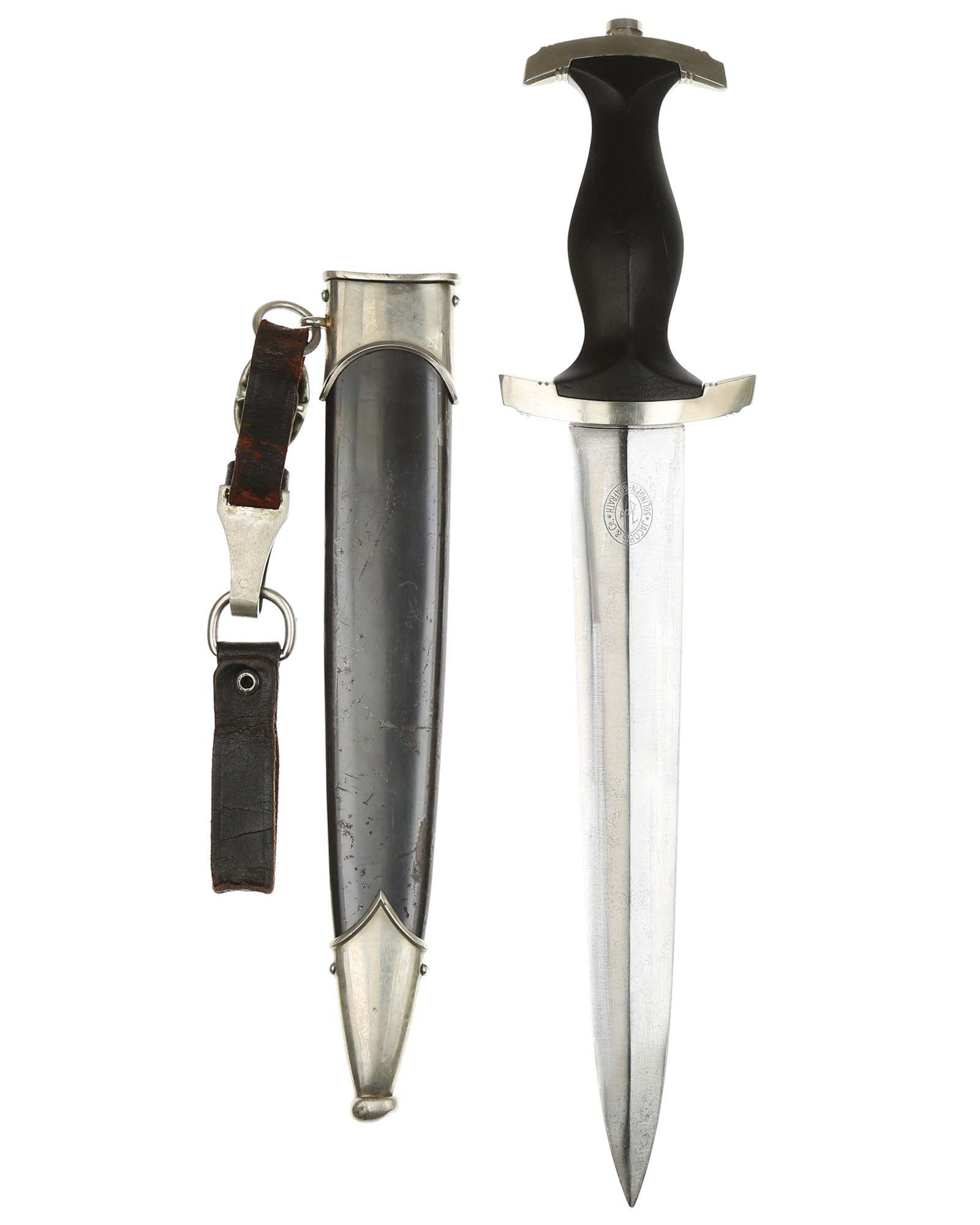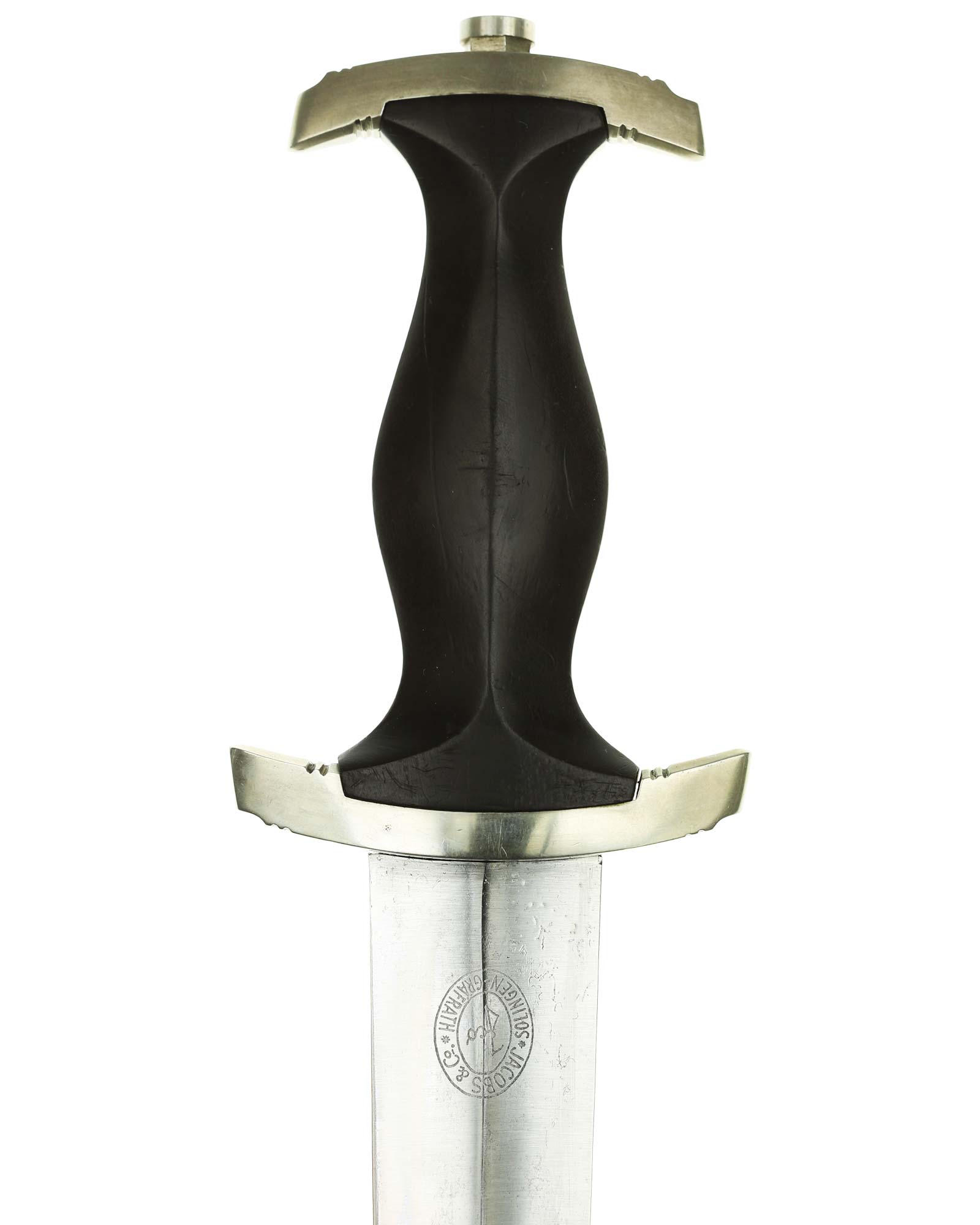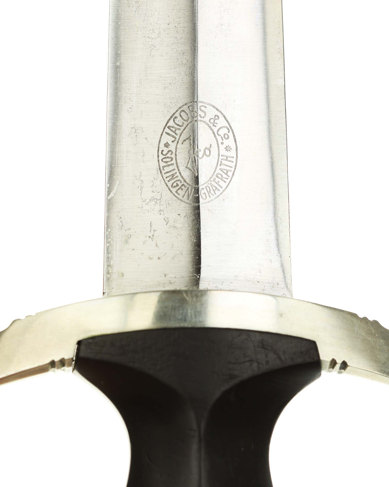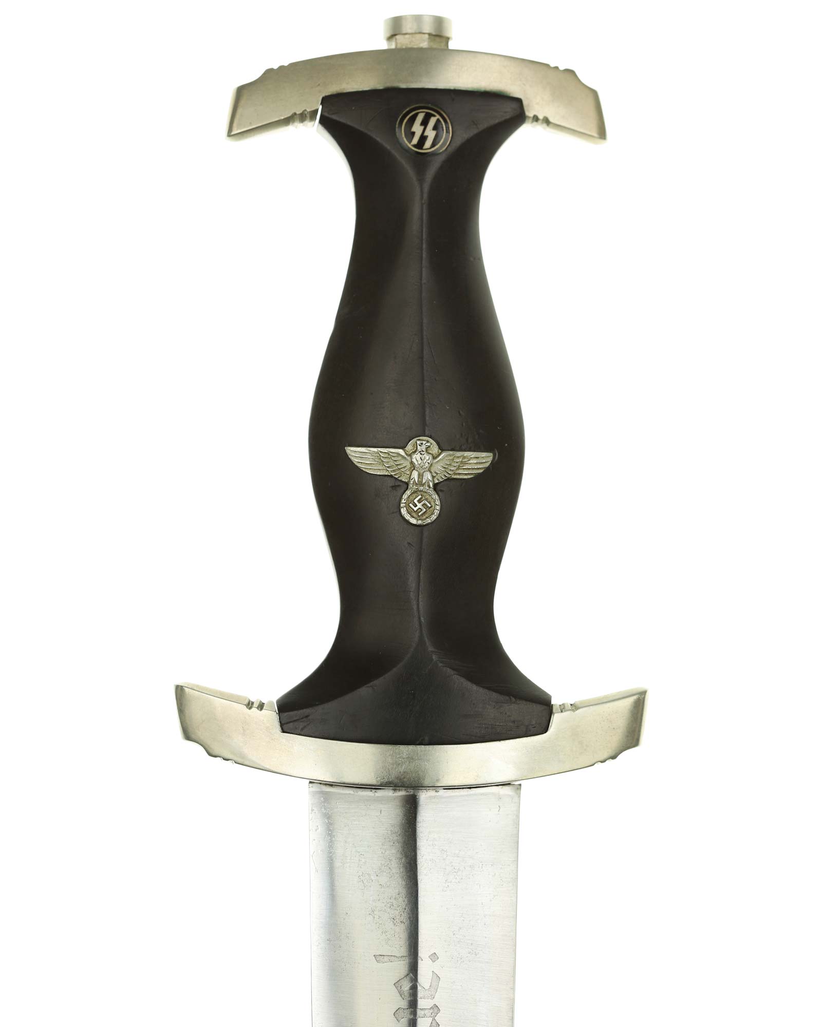 Клинок: Клинок кинжала прямой, стальной, двулезвийный, кинжального типа, с выраженным центральным ребром. На одной стороне клинка методом травления нанесен девиз СС «Meine Ehre heisst Treue !» (Моя честь называется верностью !). Клинок на оборотной стороне у основания стоит клеймо производителя Jacobs & Co. Solingen-Gräfrath (Якобс и Ко. Золинген).