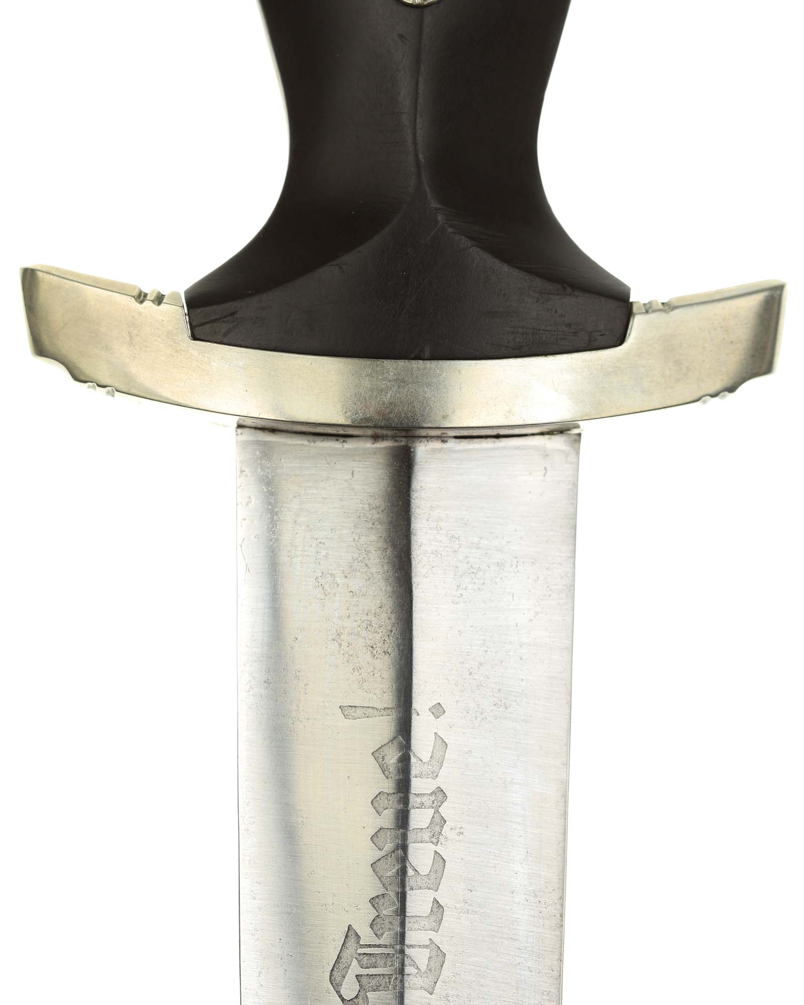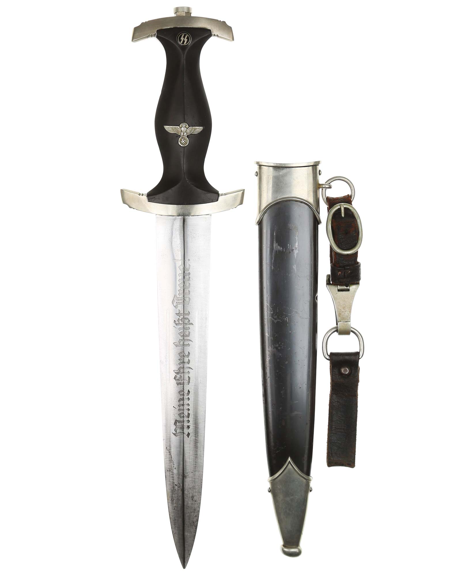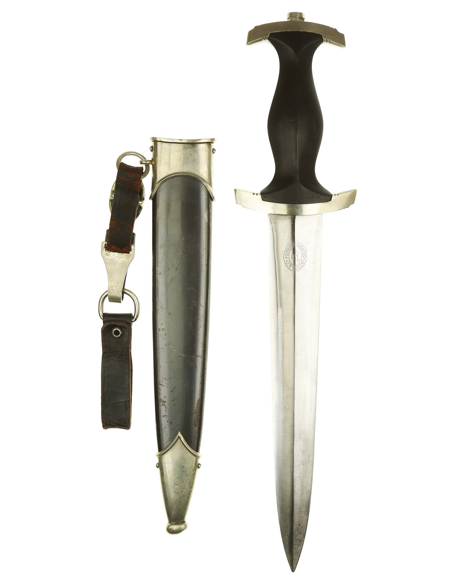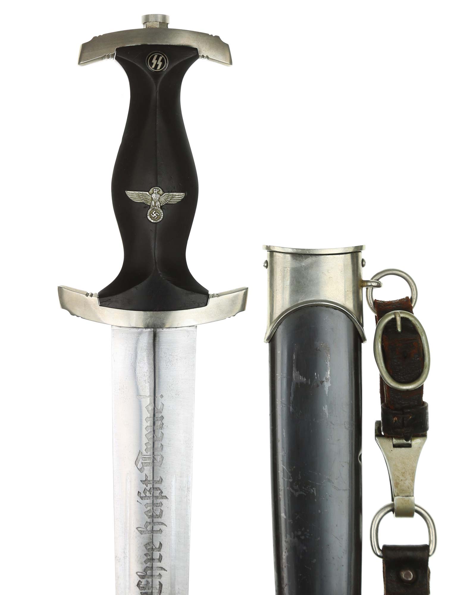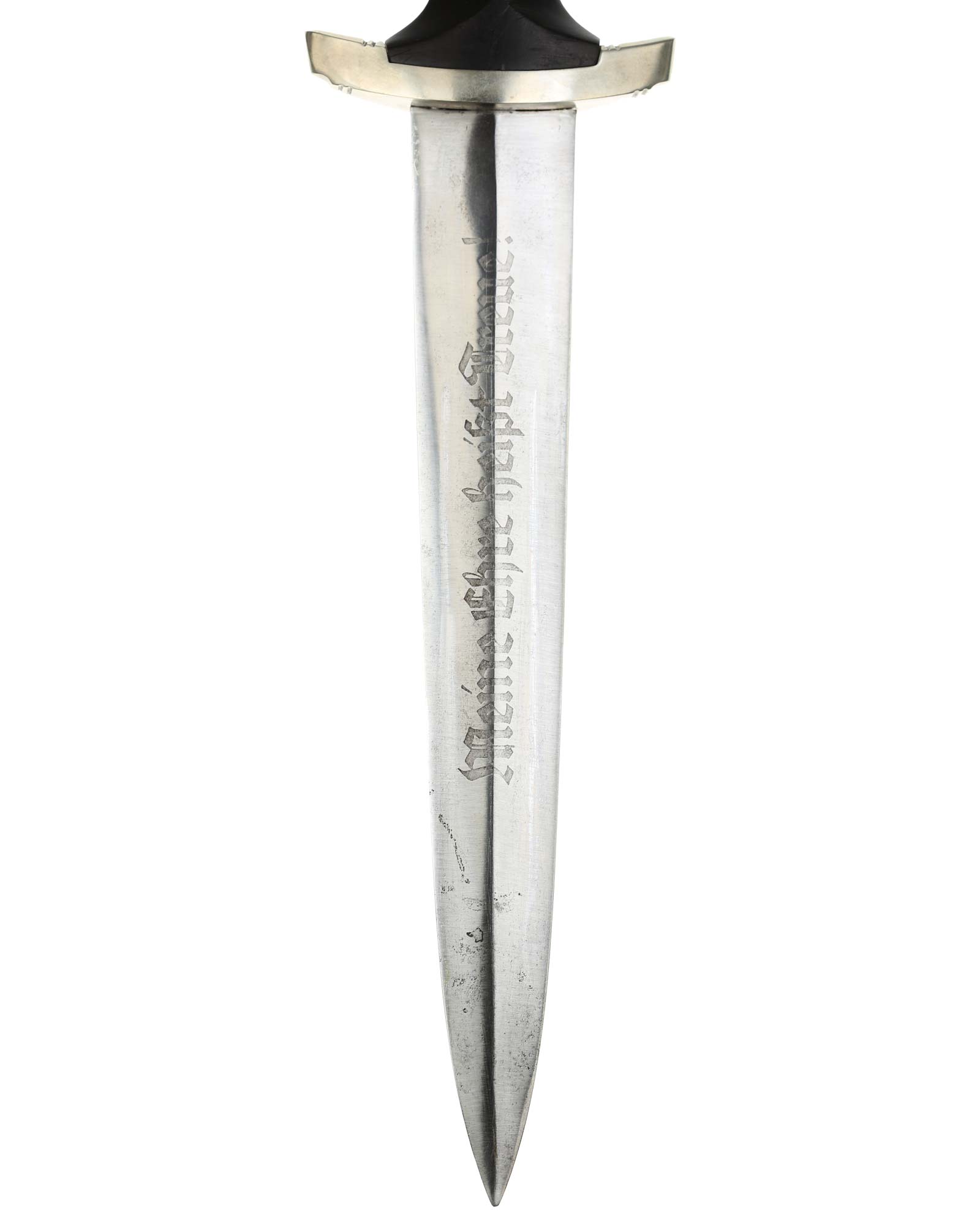 Клинок: Клинок кинжала прямой, стальной, двулезвийный, кинжального типа, с выраженным центральным ребром. На одной стороне клинка методом травления нанесен девиз СС «Meine Ehre heisst Treue !» (Моя честь называется верностью !). Клинок на оборотной стороне у основания стоит клеймо производителя Jacobs & Co. Solingen-Gräfrath (Якобс и Ко. Золинген).