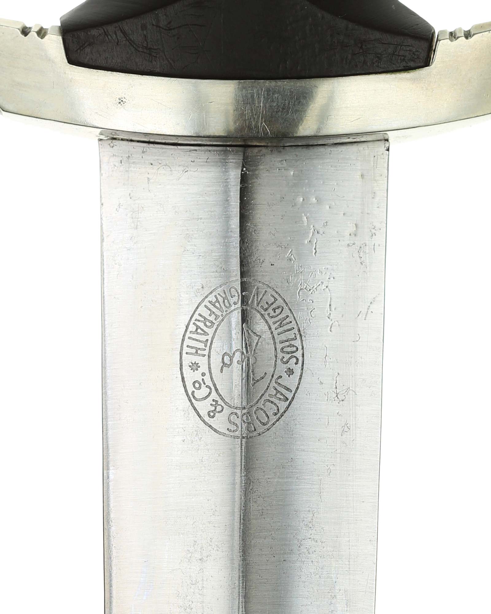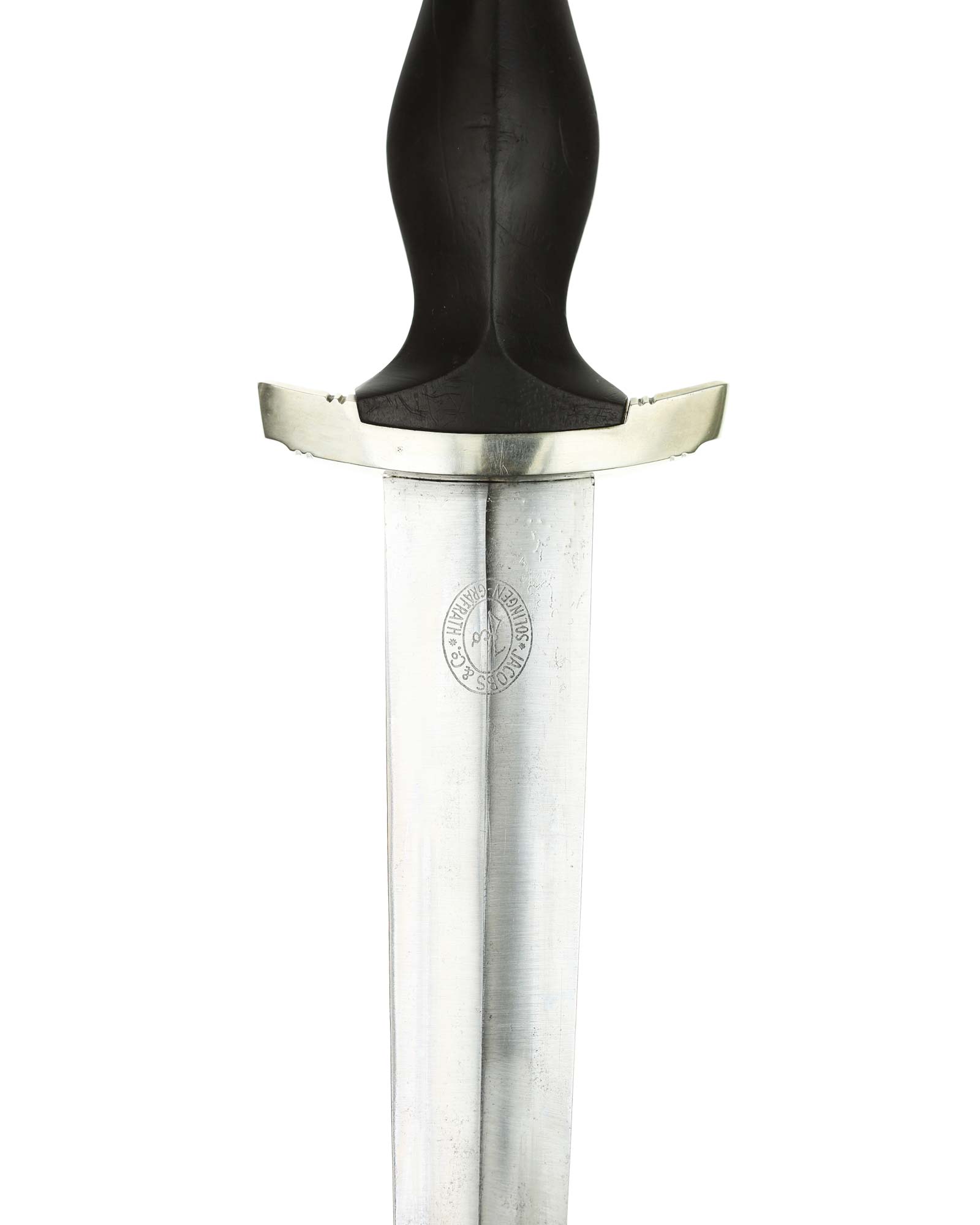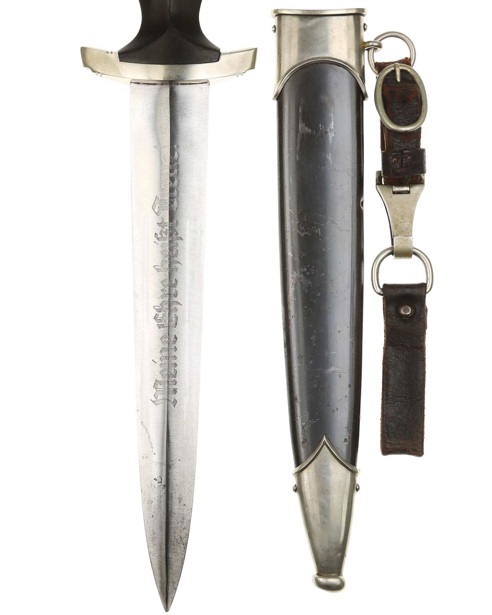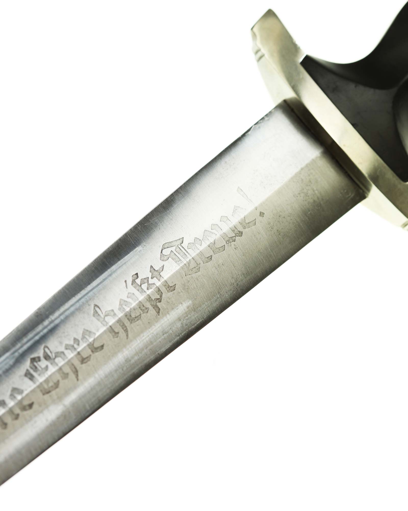 Клинок: Клинок кинжала прямой, стальной, двулезвийный, кинжального типа, с выраженным центральным ребром. На одной стороне клинка методом травления нанесен девиз СС «Meine Ehre heisst Treue !» (Моя честь называется верностью !). Клинок на оборотной стороне у основания стоит клеймо производителя Jacobs & Co. Solingen-Gräfrath (Якобс и Ко. Золинген).