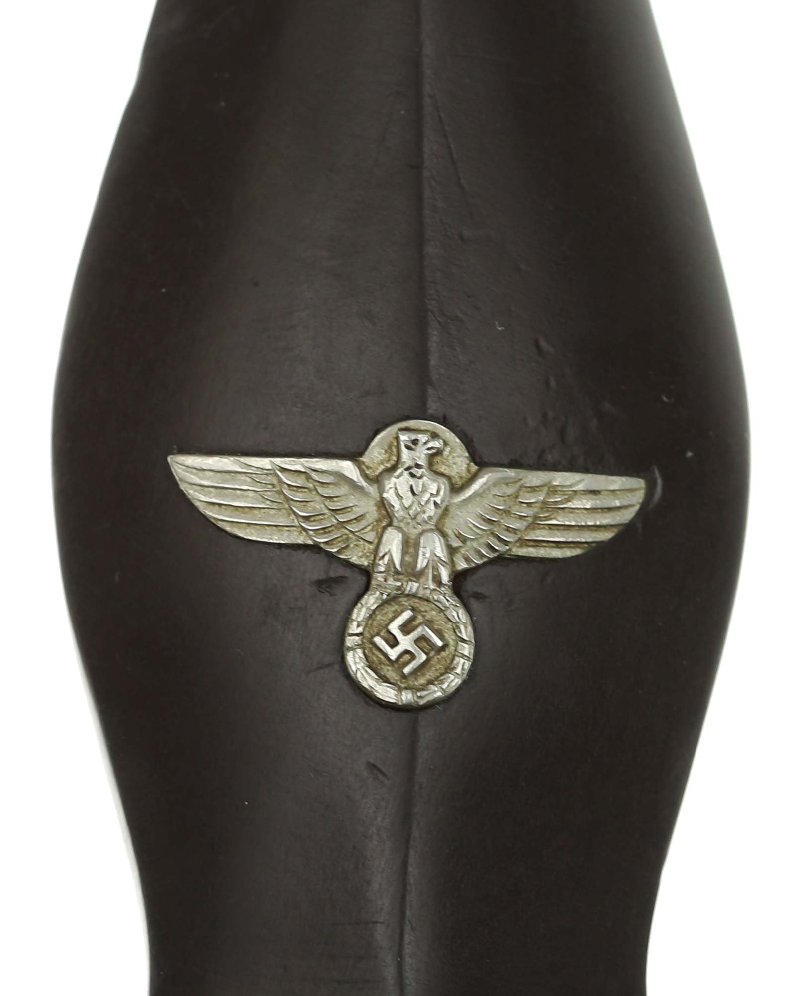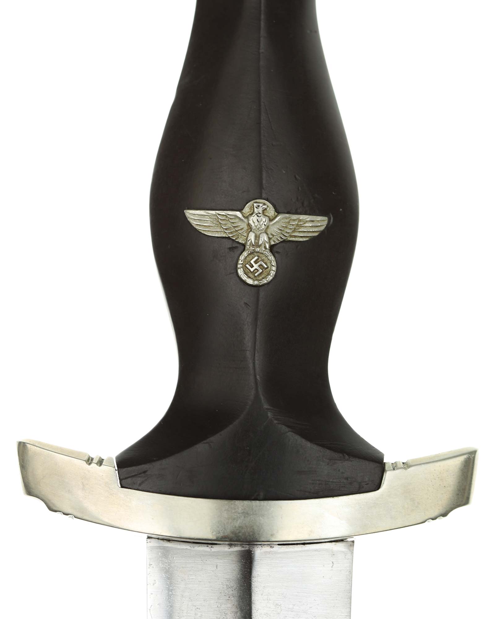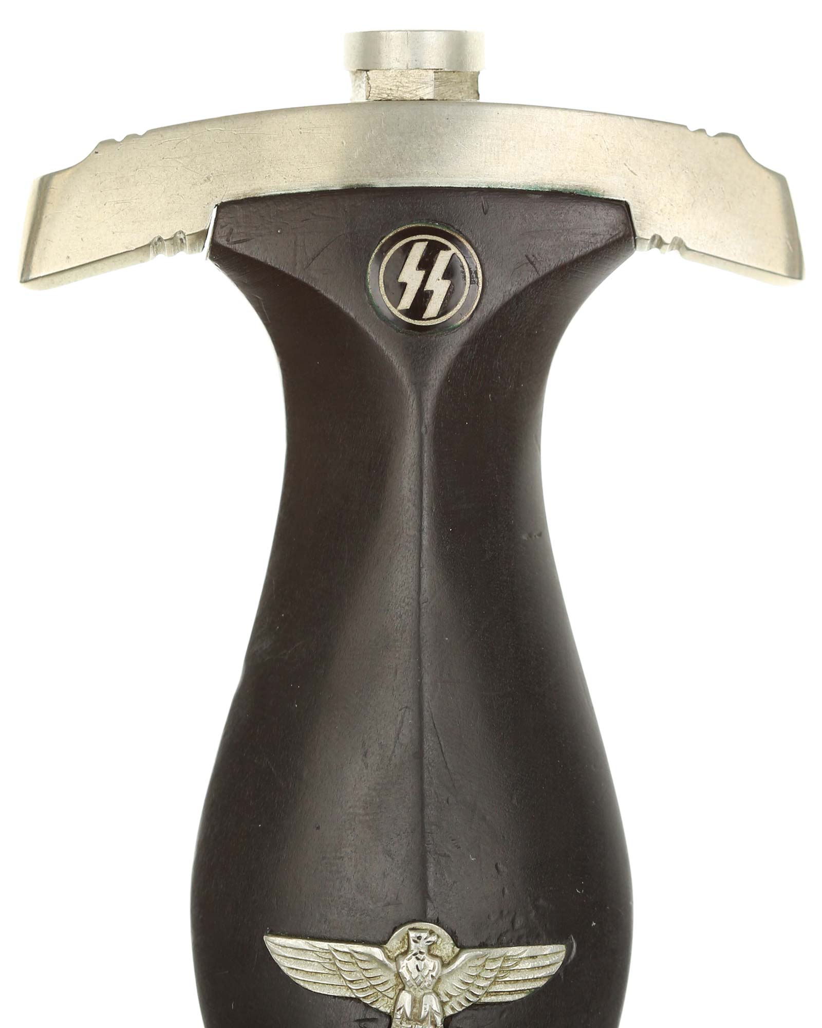 Рукоять: Рукоять из мореного в черный цвет дерева. Рукоять в верхней части имеет вставку в виде черного эмалевого глазка с рунами, в средней части рукояти – металлический знак в виде стилизованного изображения раскинувшего крылья орла, держащего в когтях венок со свастикой. Металлические элементы гарды изготовлены из мельхиора. Крестовина С-образная, белого металла, с концами, чуть загнутыми вверх.