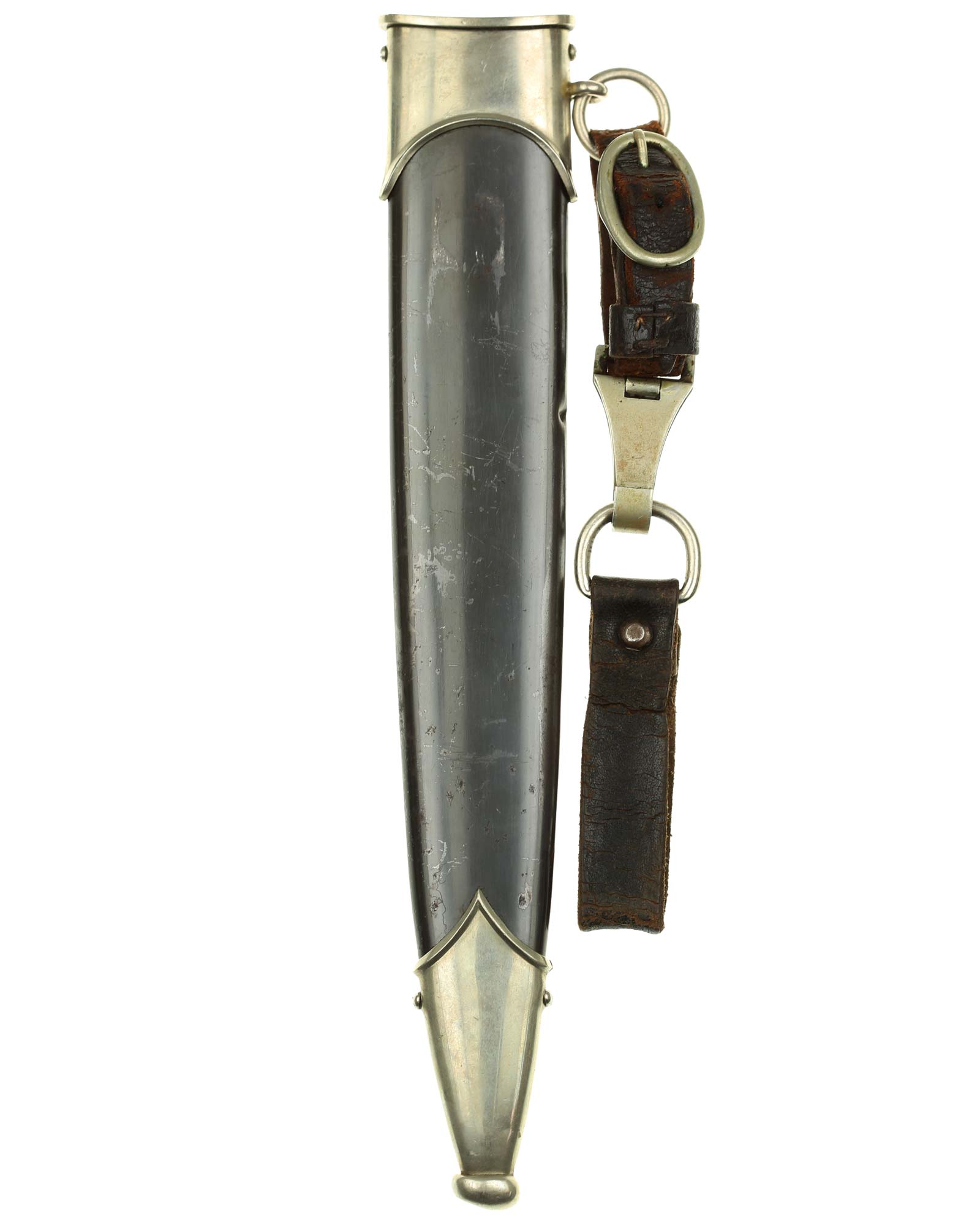 Ножны: Ножны металлические. Прибор ножен изготовлен из белого металла и состоит из устья с гайкой и кольцом для подвешивания га ремень и устья с шариком.
