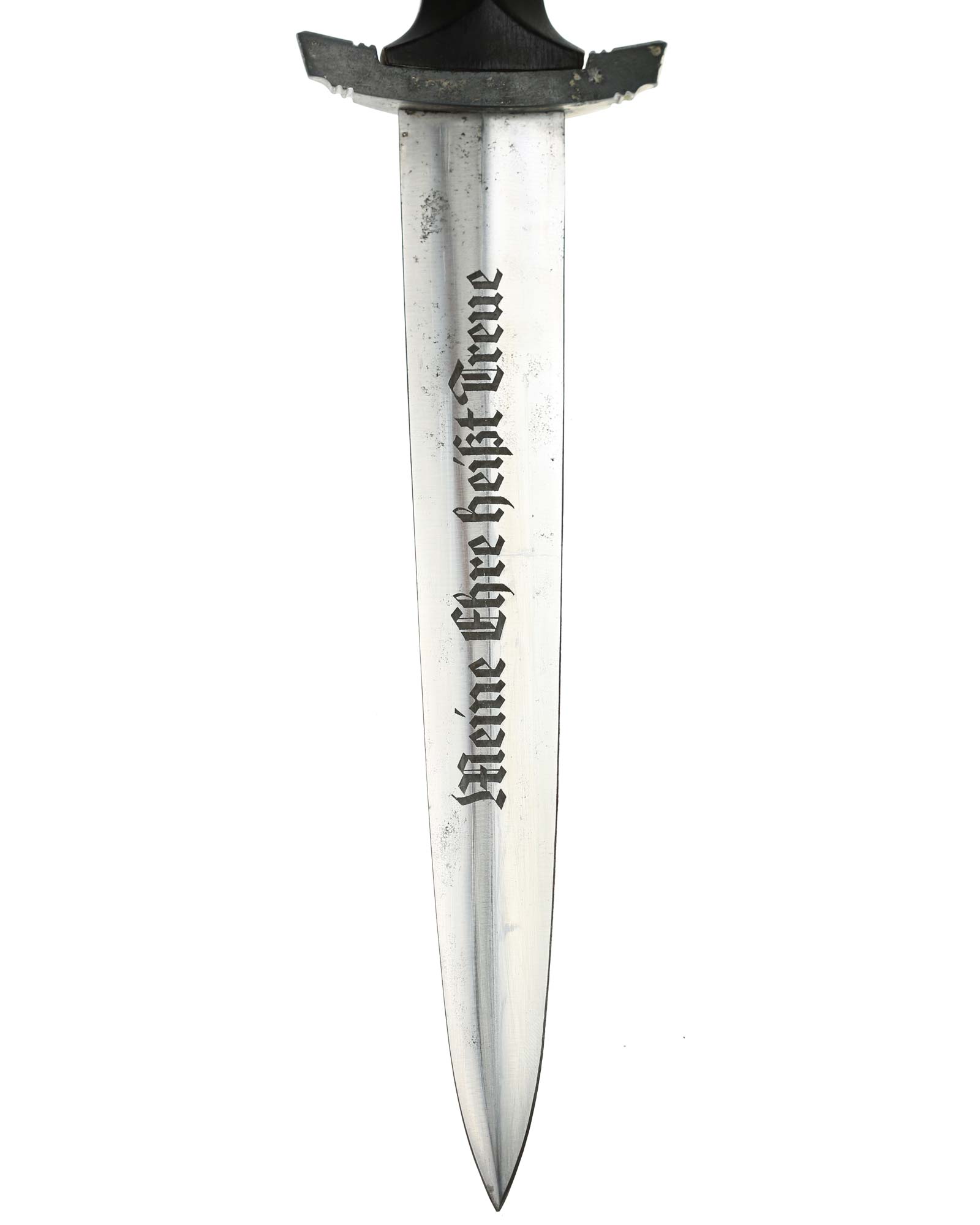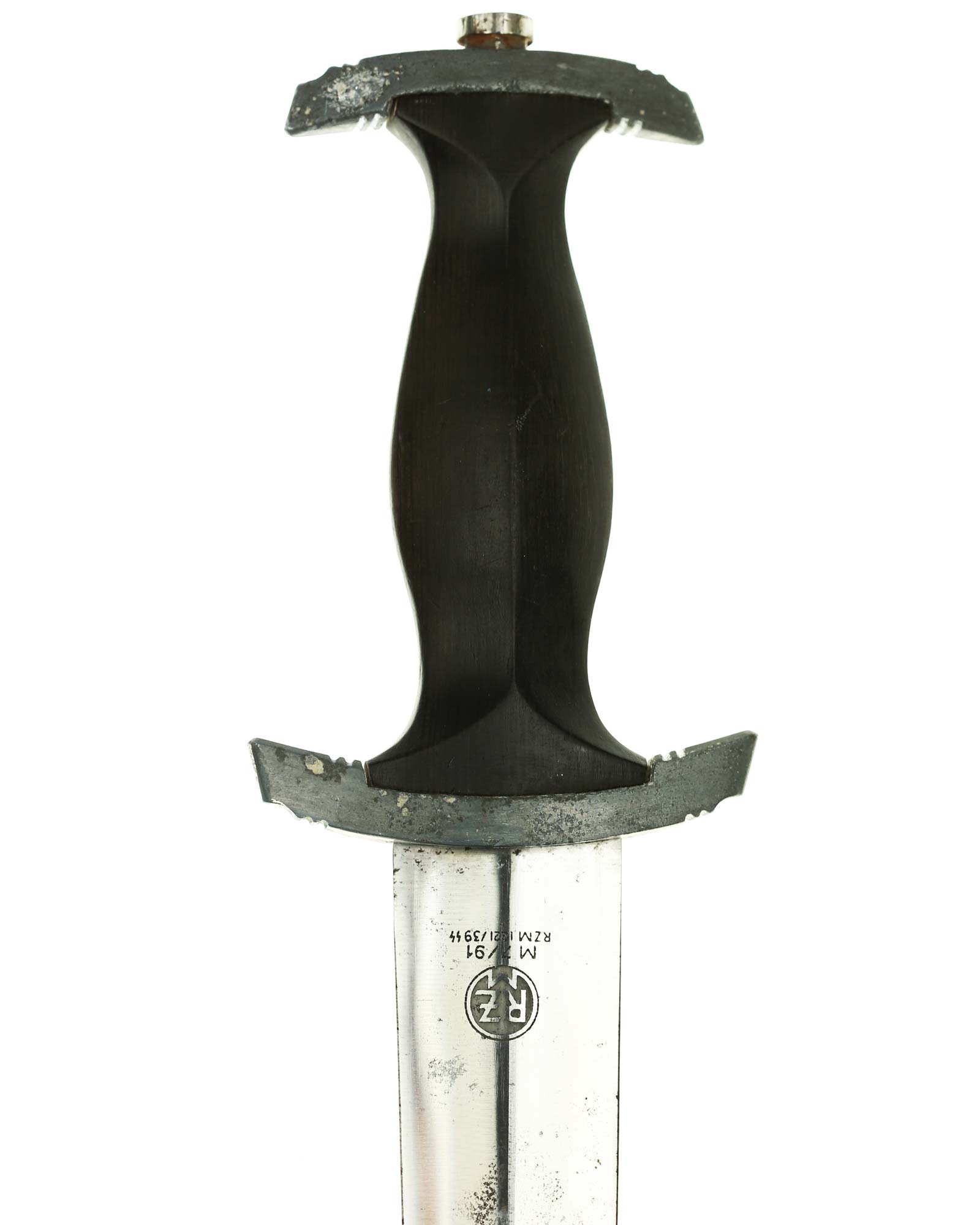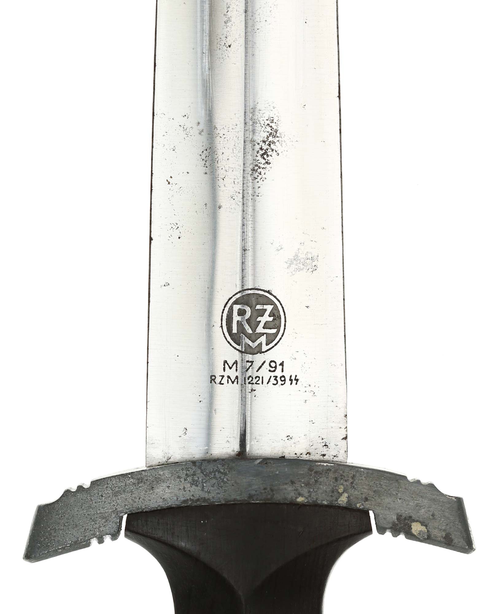 Клинок: Клинок кинжала прямой, стальной, двулезвийный, кинжального типа, с выраженным центральным ребром. На одной стороне клинка методом травления нанесен девиз СС «Meine Ehre heisst Treue» (Моя честь называется верностью). Клинок на оборотной стороне у основания стоит клеймо производителя RZM M7/91 1221/39 SS (Мальш-Шпитцер Карл, Штайнбах | Malsch-Spitzer Karl, Steinbach).