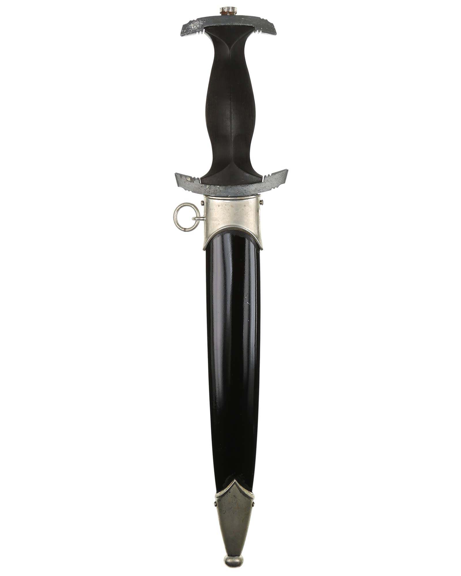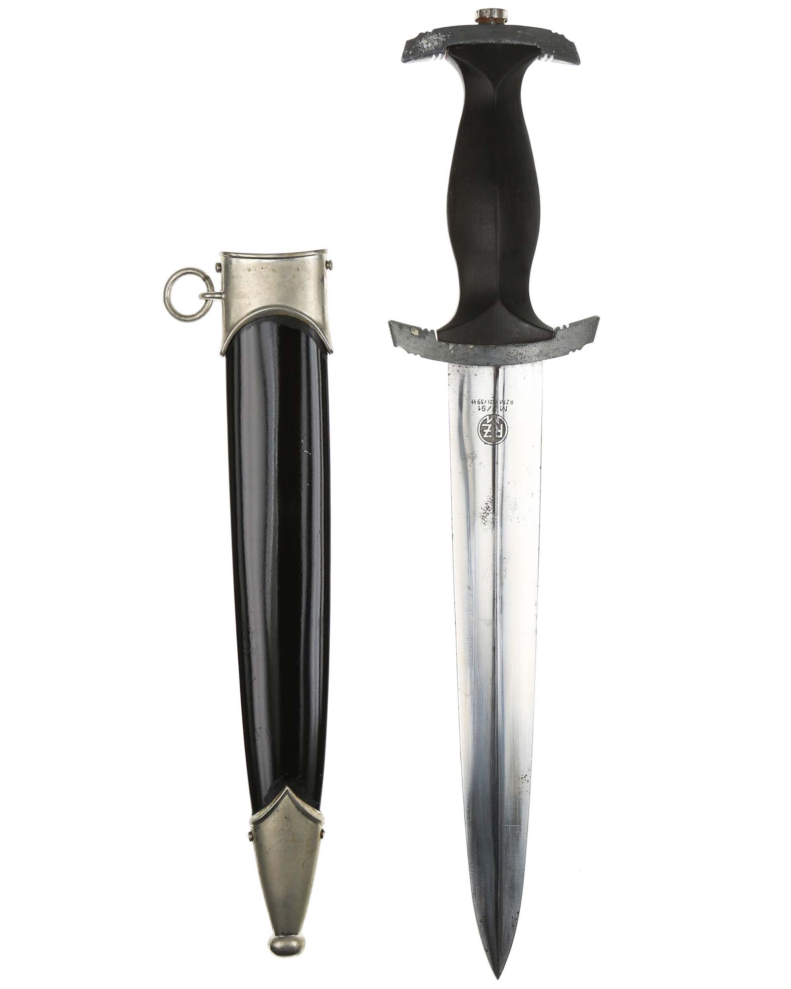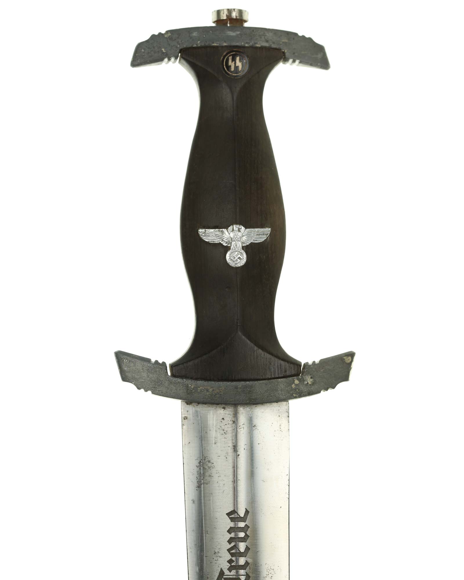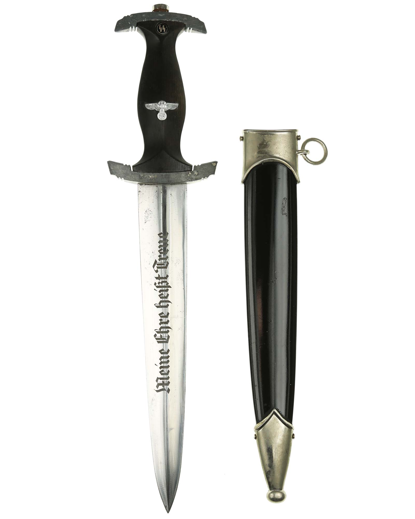 Клинок: Клинок кинжала прямой, стальной, двулезвийный, кинжального типа, с выраженным центральным ребром. На одной стороне клинка методом травления нанесен девиз СС «Meine Ehre heisst Treue» (Моя честь называется верностью). Клинок на оборотной стороне у основания стоит клеймо производителя RZM M7/91 1221/39 SS (Мальш-Шпитцер Карл, Штайнбах | Malsch-Spitzer Karl, Steinbach).