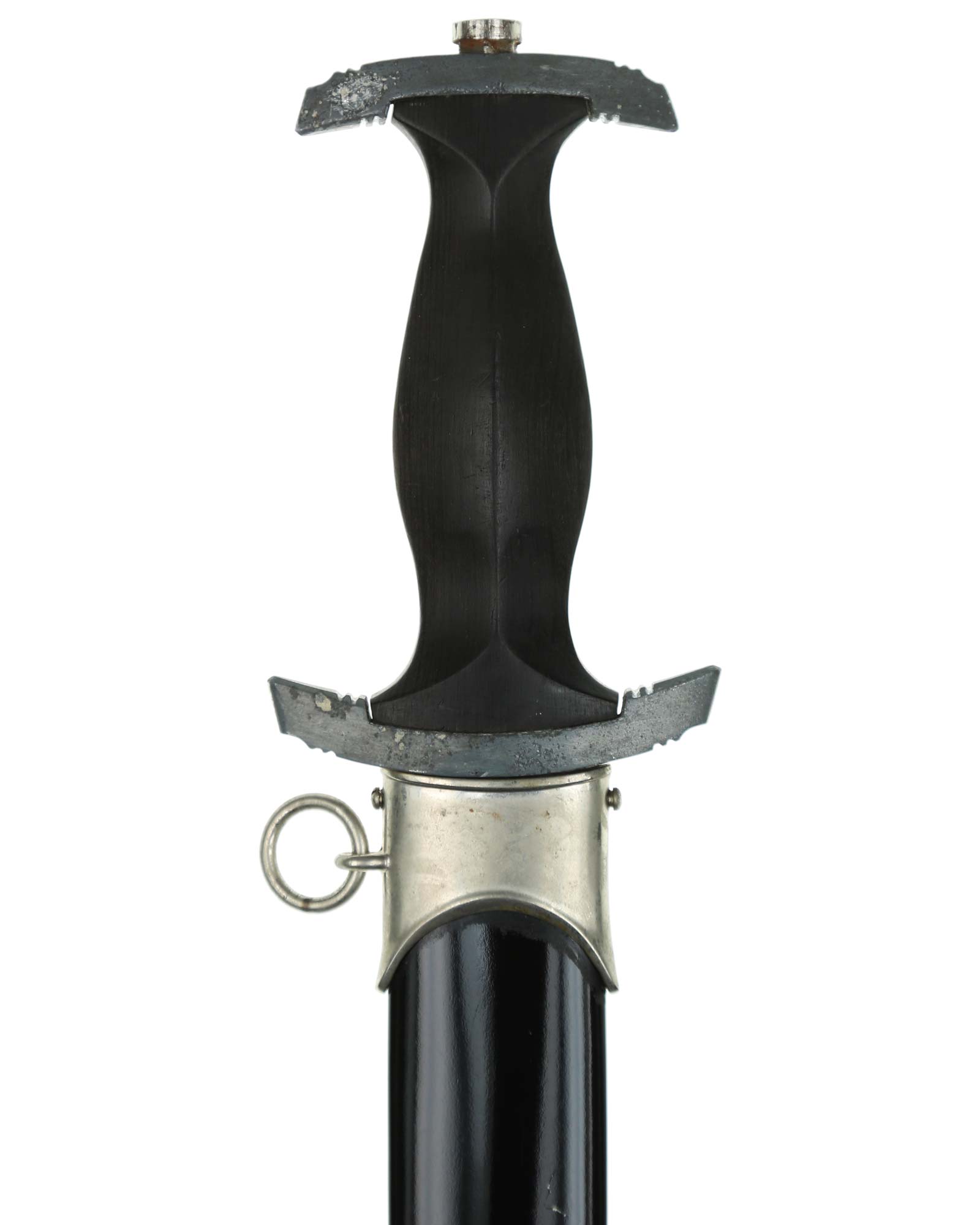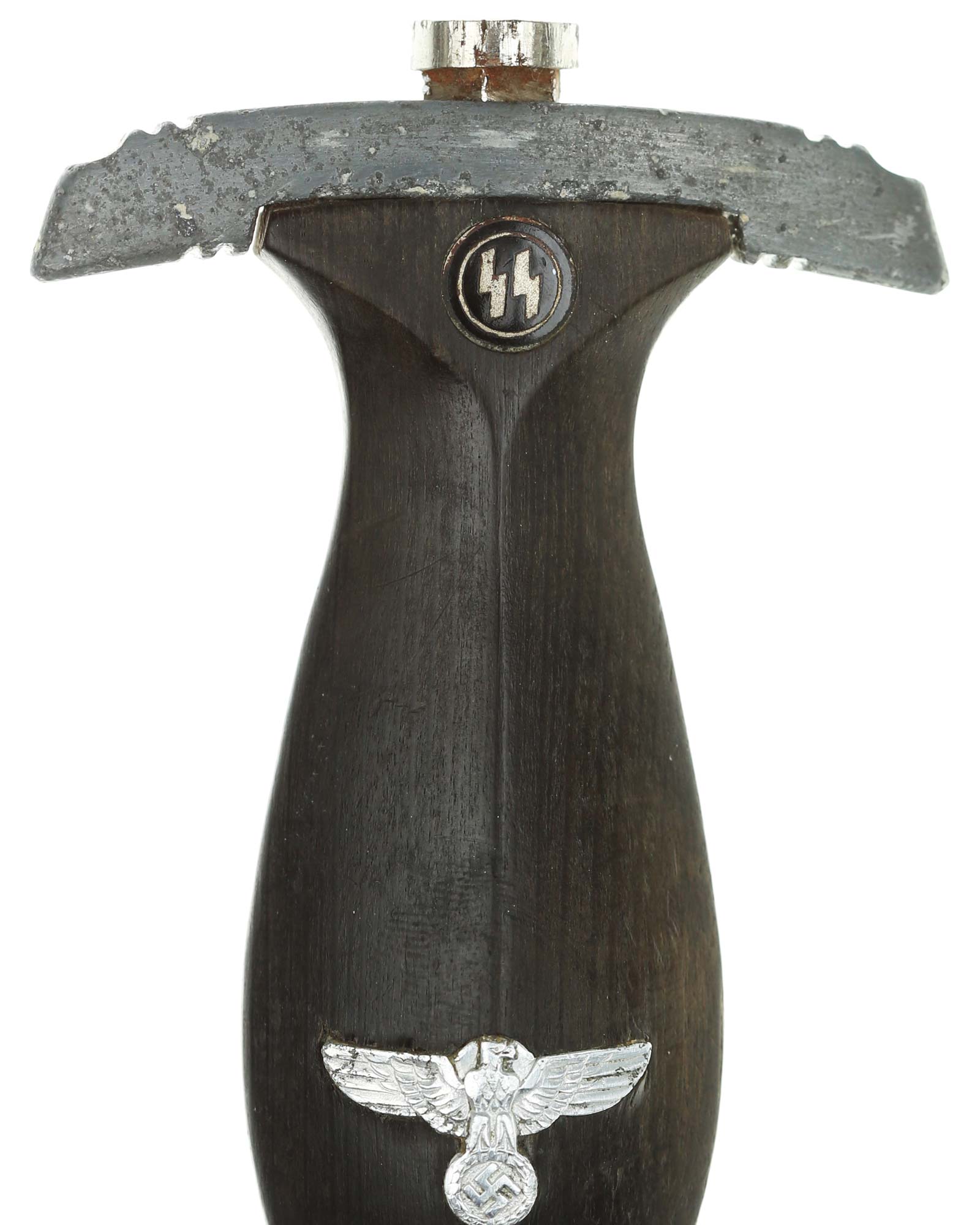 Рукоять: Рукоять из мореного в черный цвет дерева. Рукоять в верхней части имеет вставку в виде черного эмалевого глазка с рунами, в средней части – вставка в виде орла СС. Металлические элементы гарды изготовлены из мельхиора.